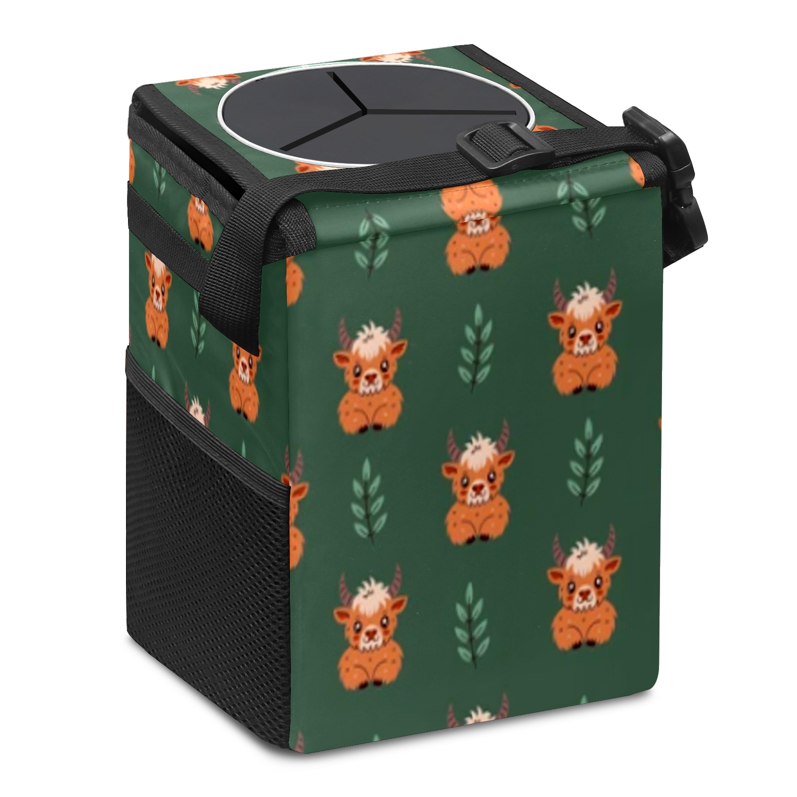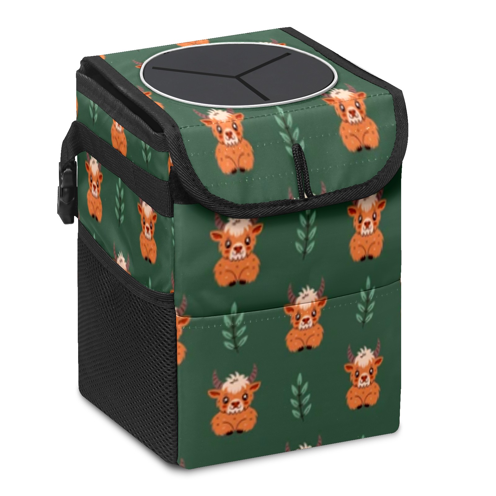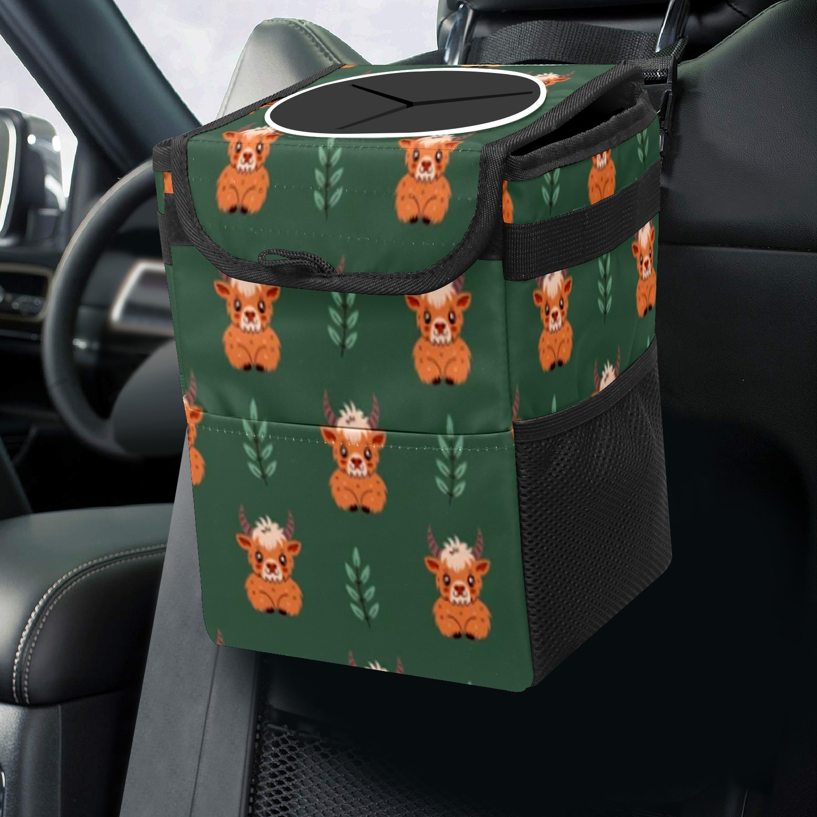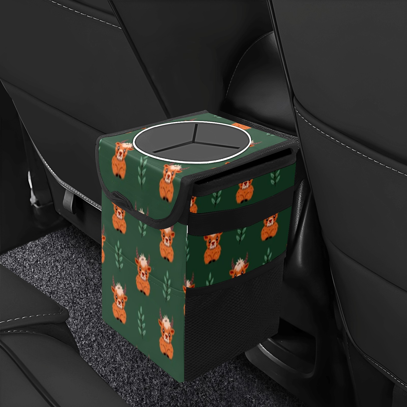 Car Trash Can with Lid, Small Portable Hanging Automotive Garbage Bin for Vehicles, Leakproof Waste Bag Container for SUV Truck Van Interior Auto Travel Road Trips(Cow)