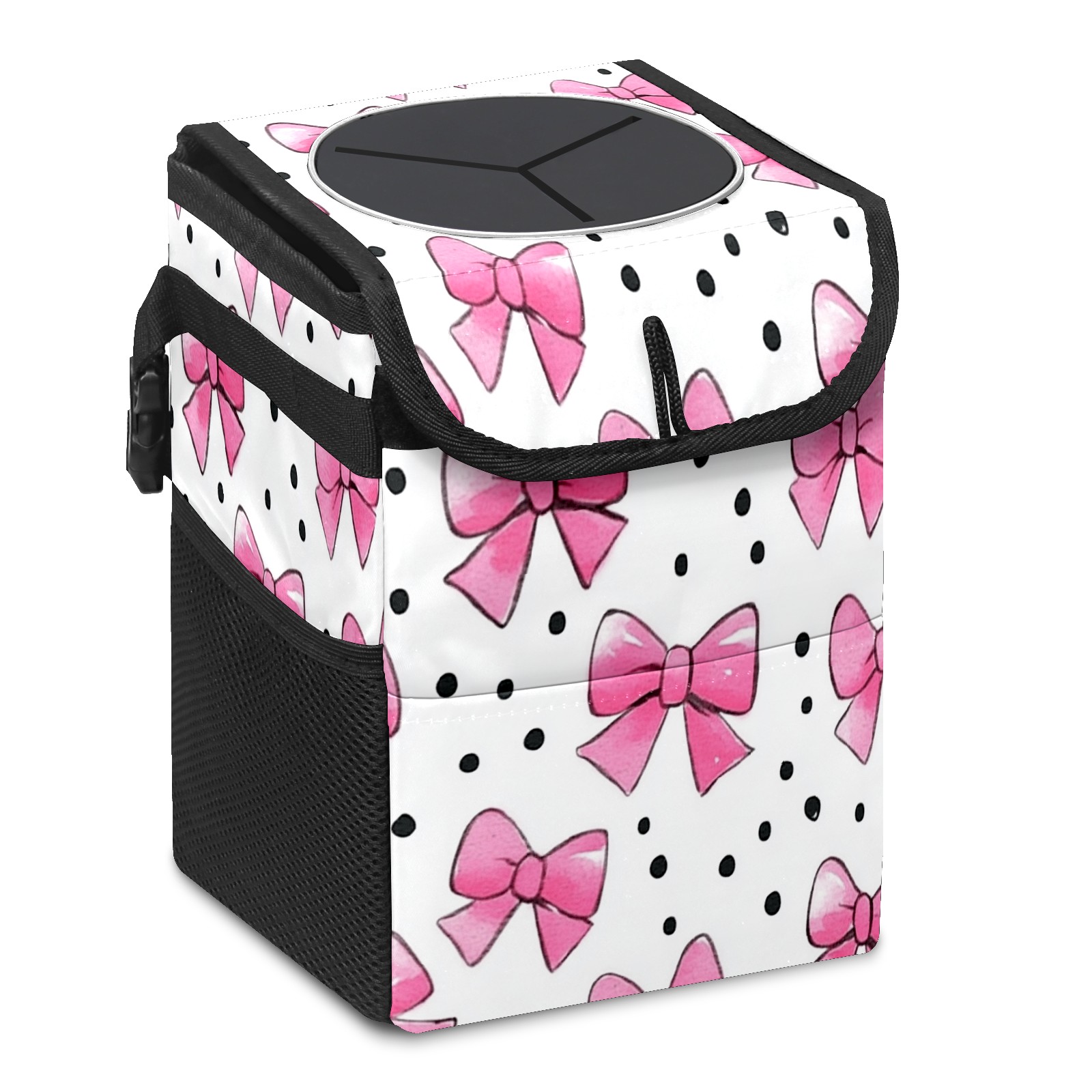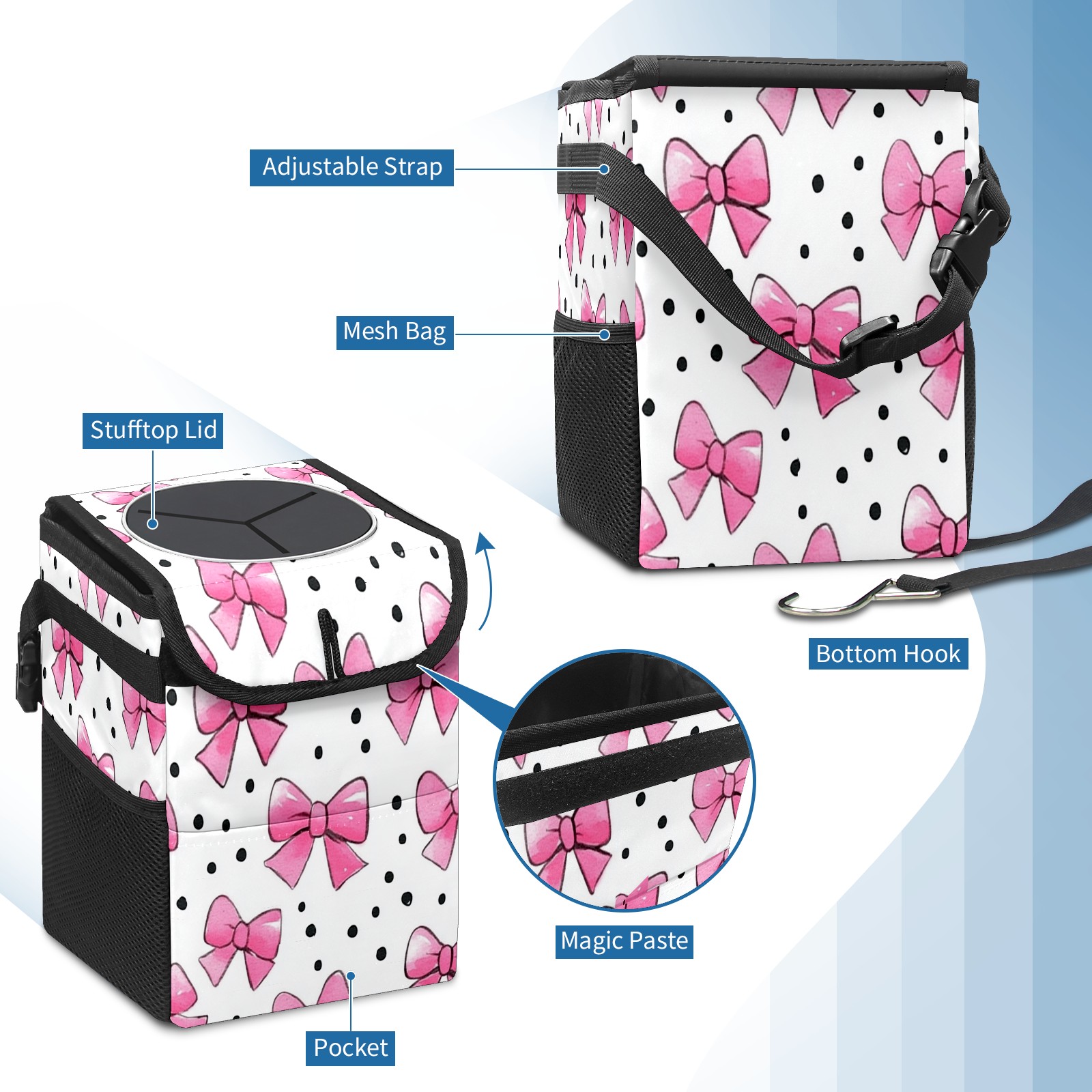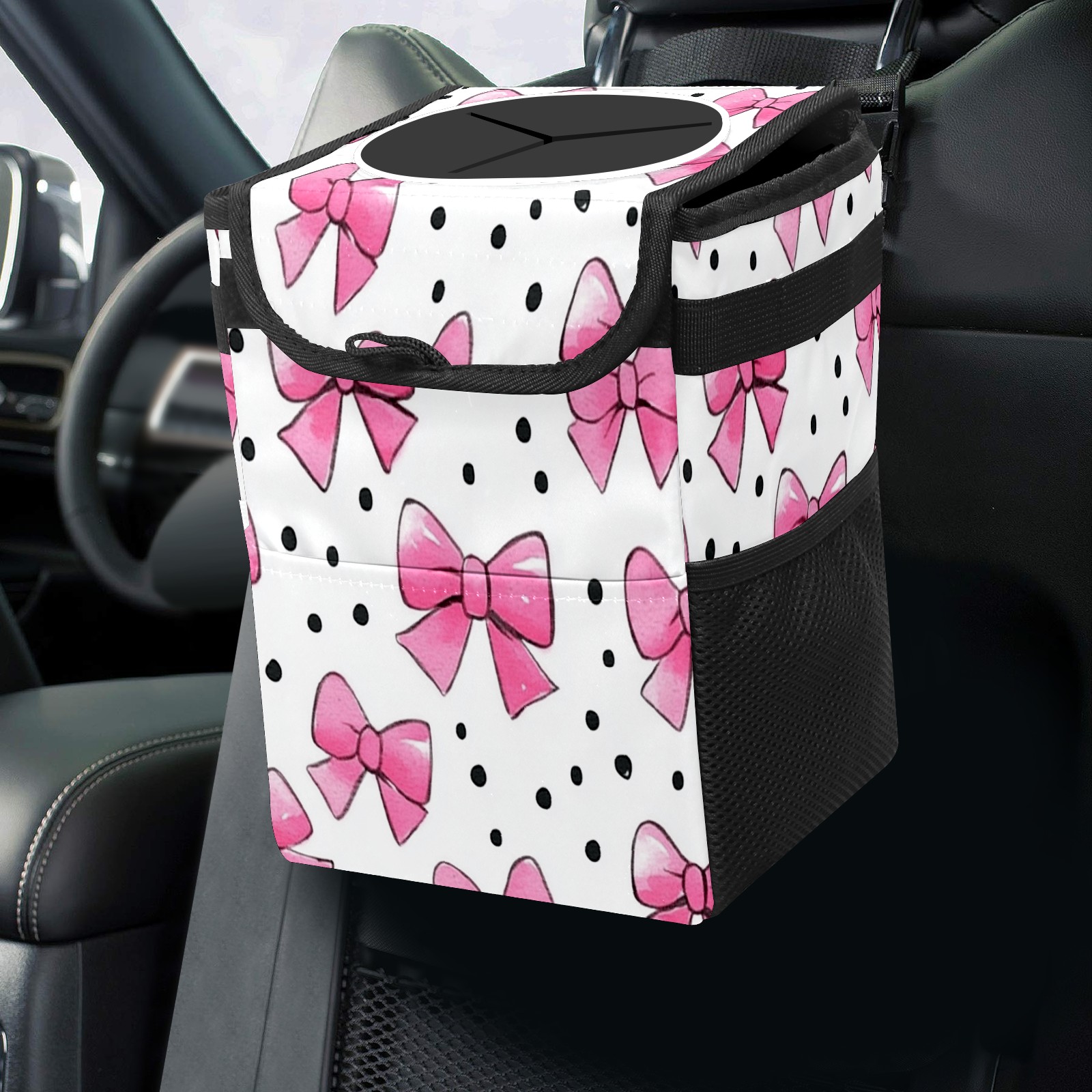 Car Trash Can with Lid, Small Portable Hanging Automotive Garbage Bin for Vehicles, Leakproof Waste Bag Container for SUV Truck Van Interior Auto Travel Road Trips(Pink Bows And Black Dots)