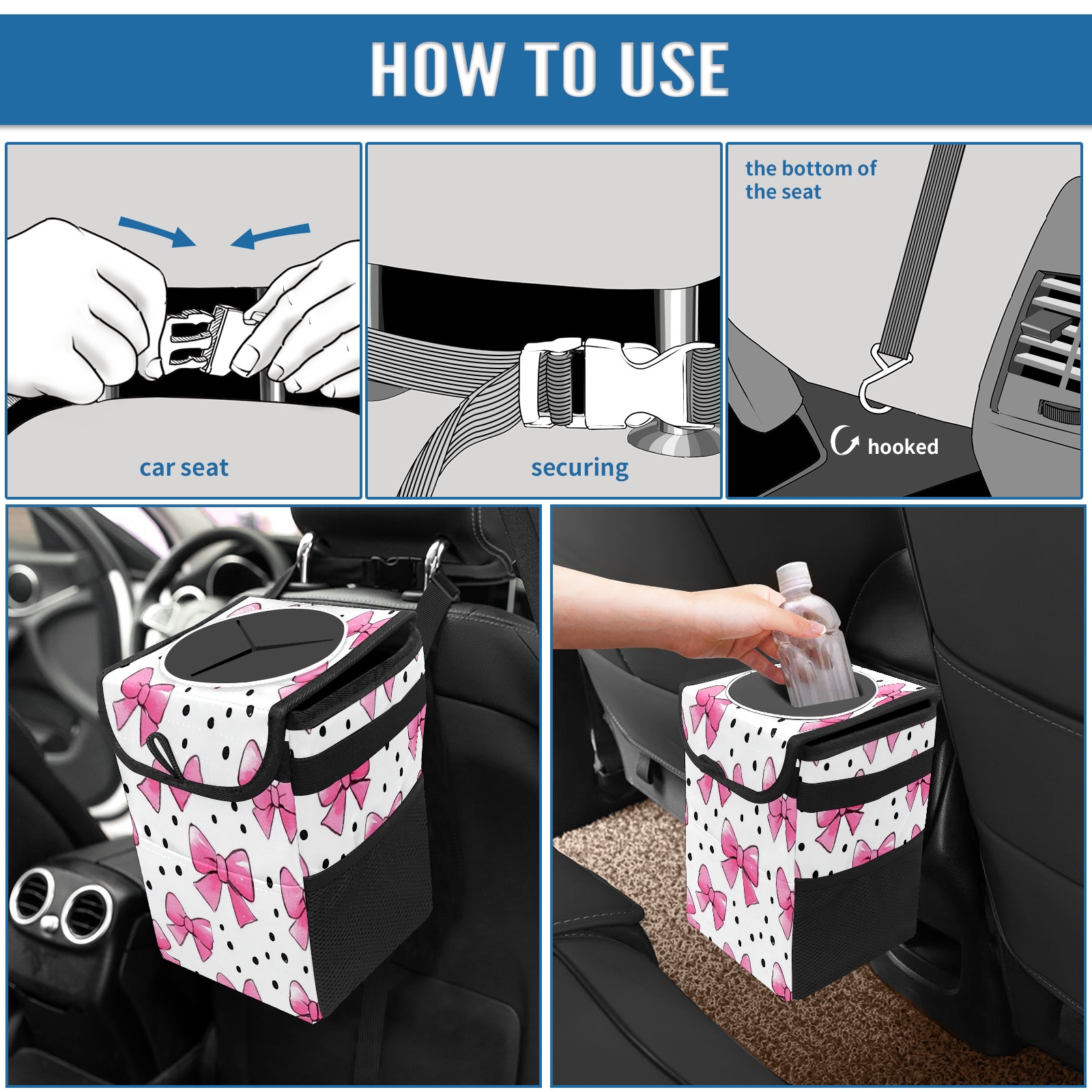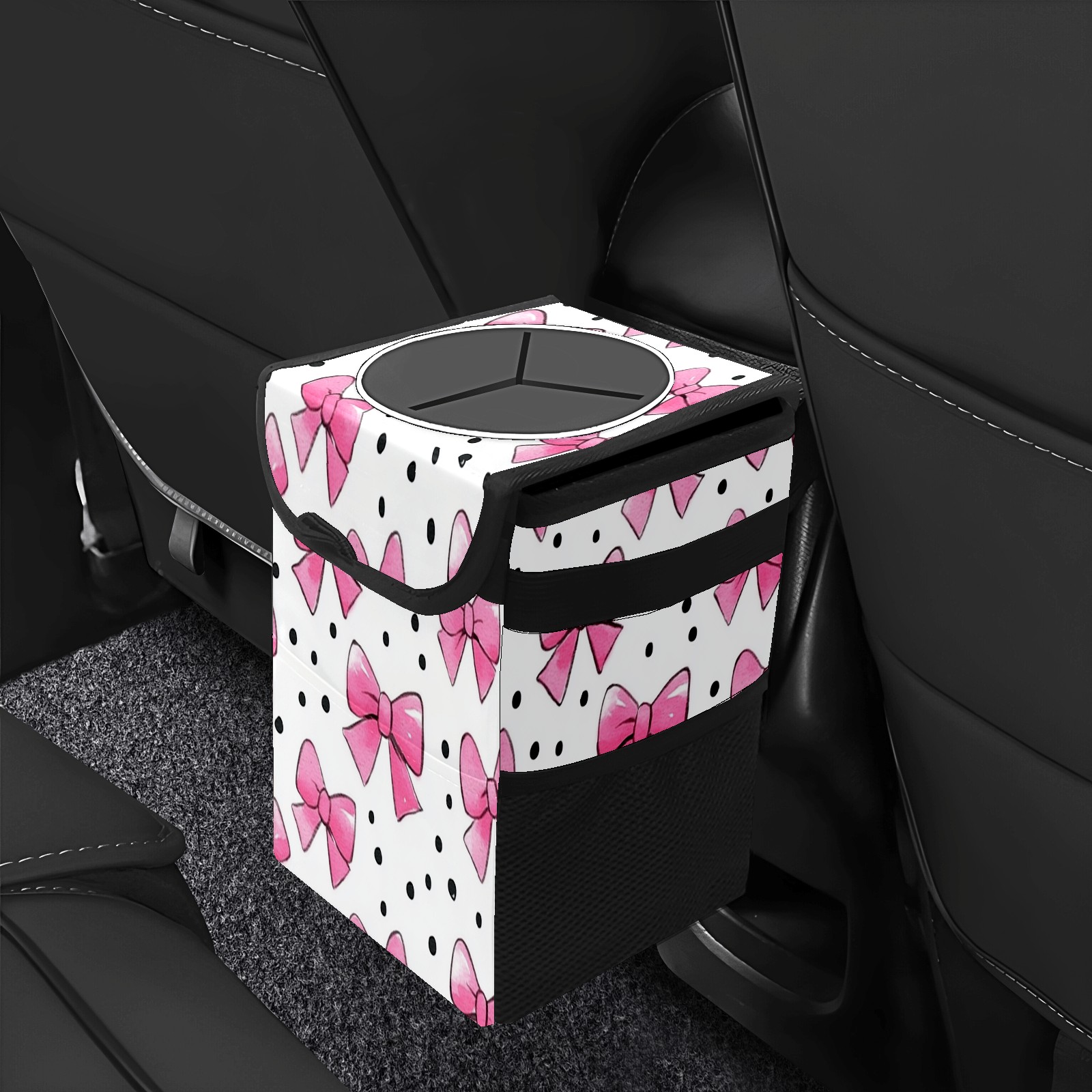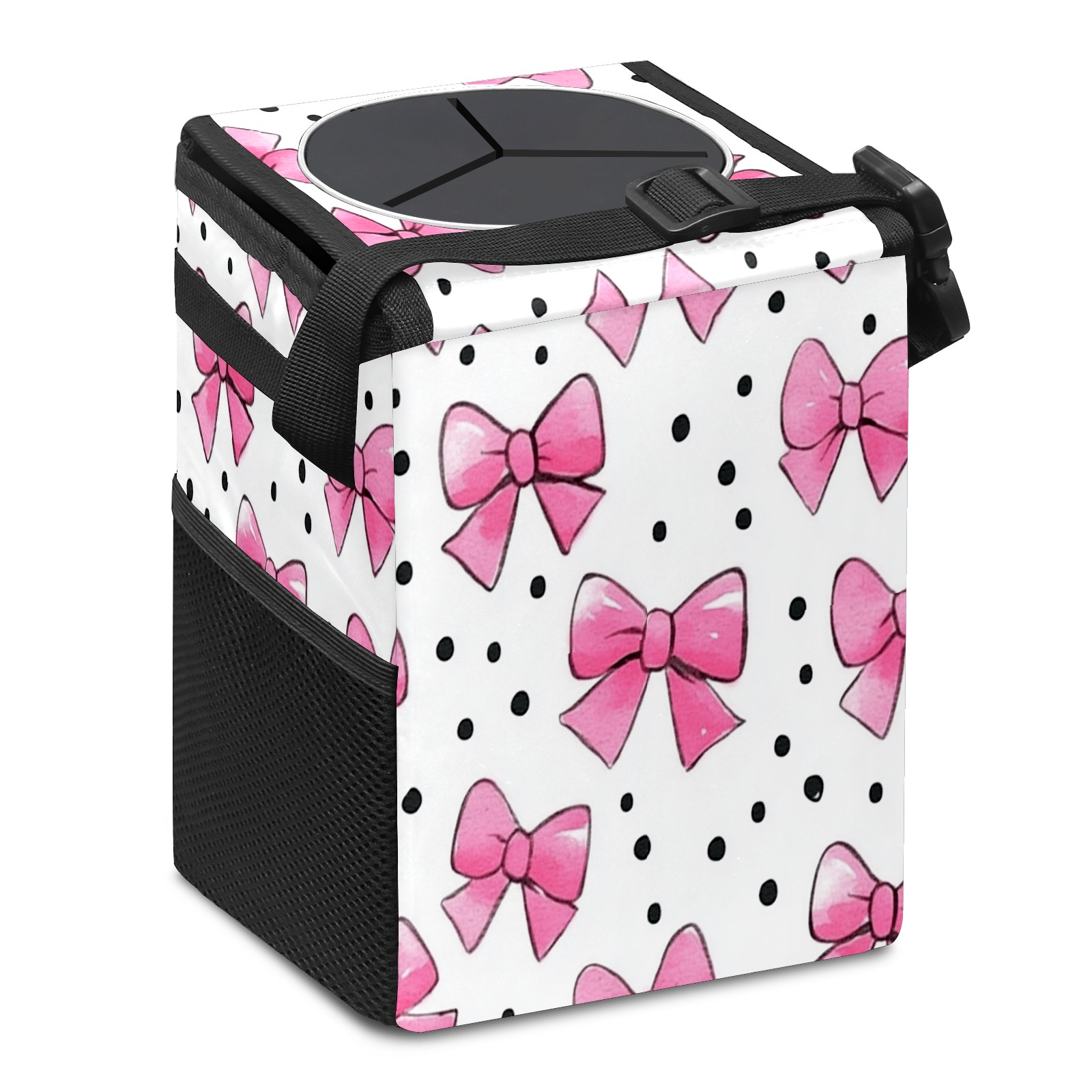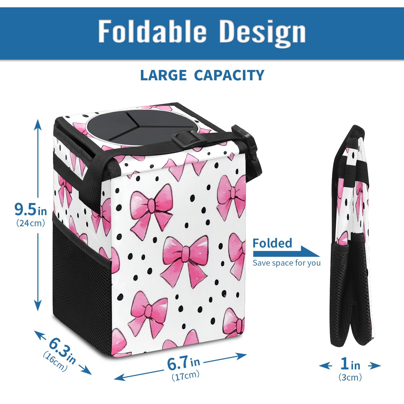 Car Trash Can with Lid, Small Portable Hanging Automotive Garbage Bin for Vehicles, Leakproof Waste Bag Container for SUV Truck Van Interior Auto Travel Road Trips(Pink Bows And Black Dots)