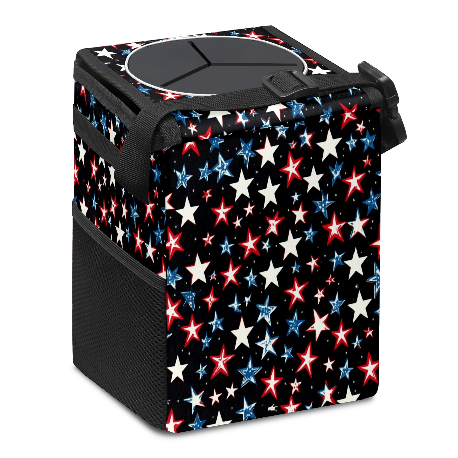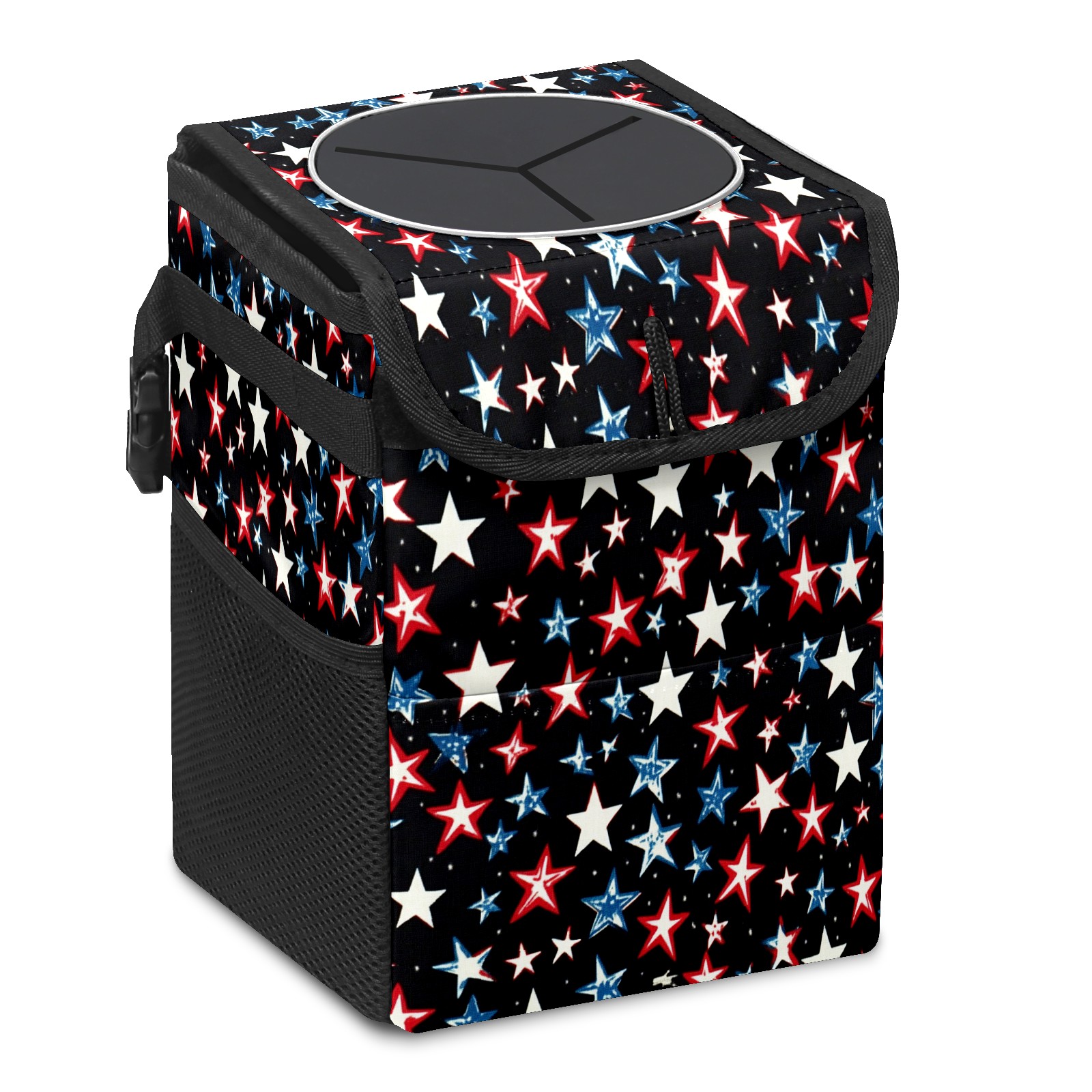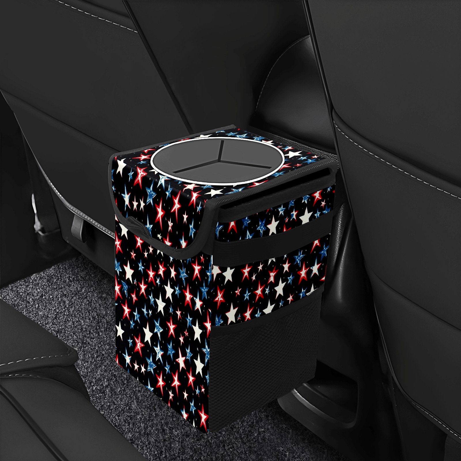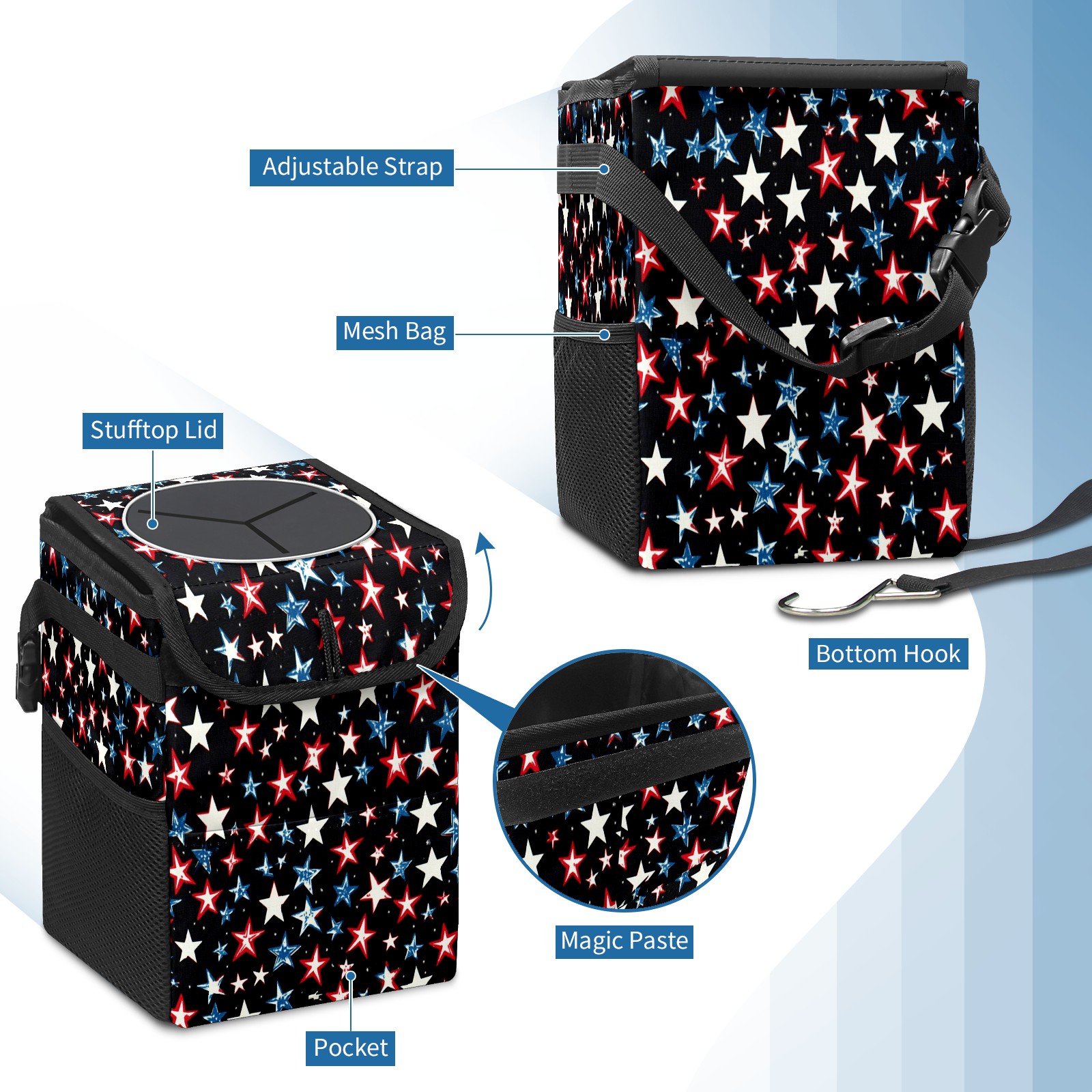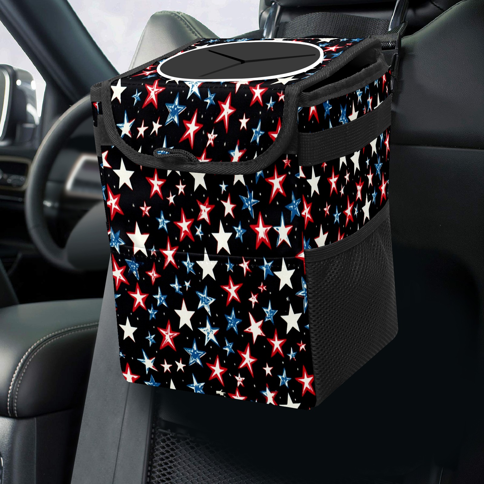 Car Trash Can with Lid, Small Portable Hanging Automotive Garbage Bin for Vehicles, Leakproof Waste Bag Container for SUV Truck Van Interior Auto Travel Road Trips(Red White And Blue Stars)