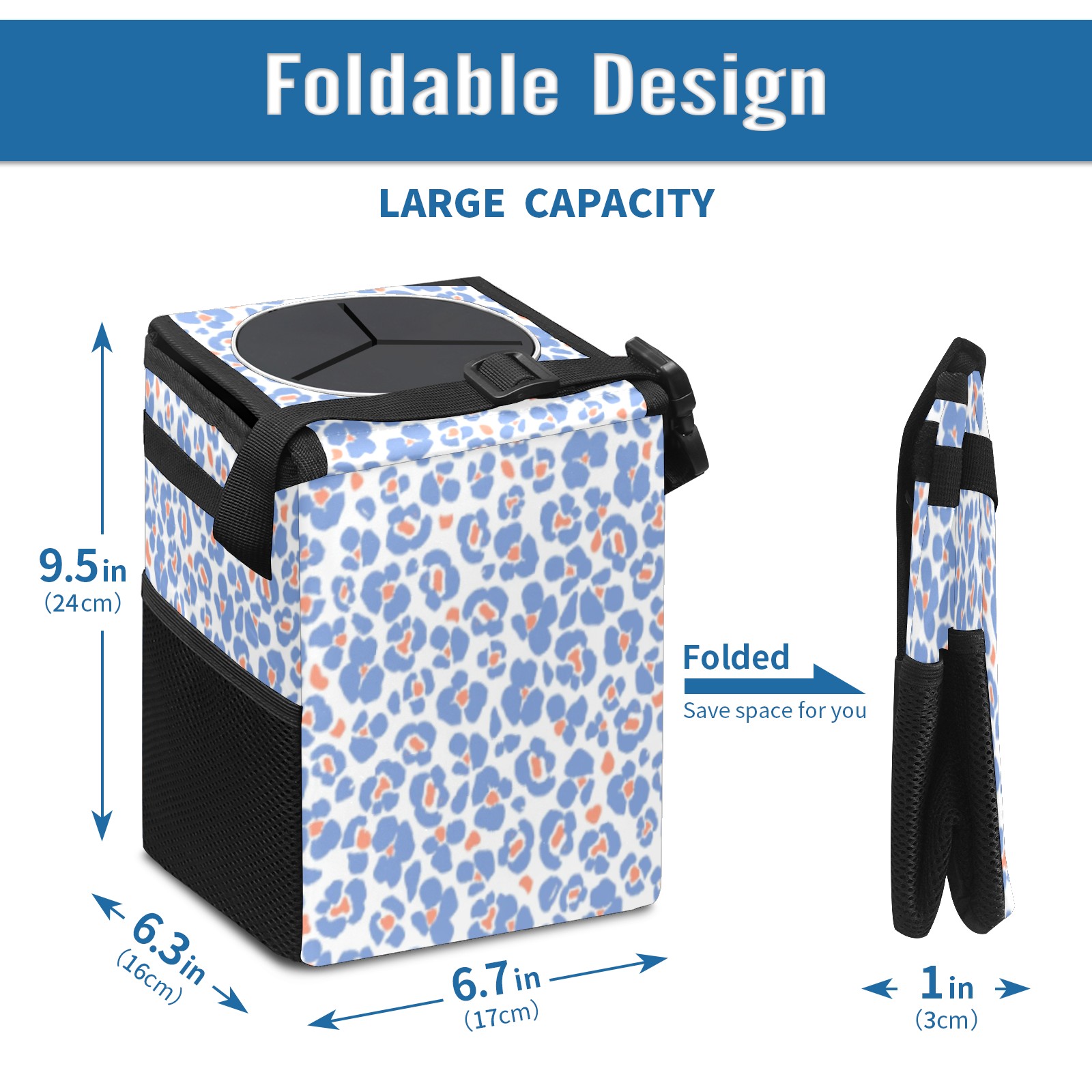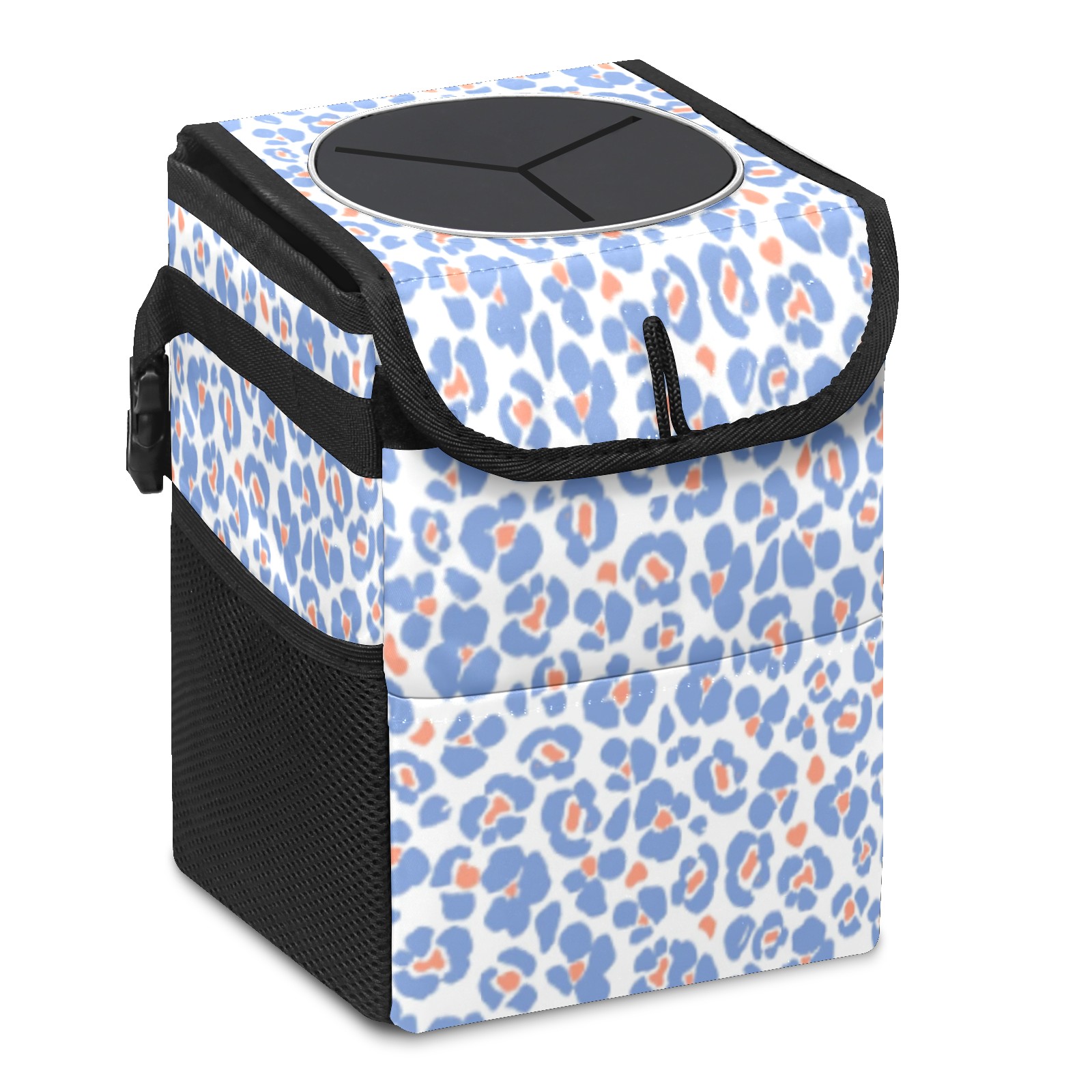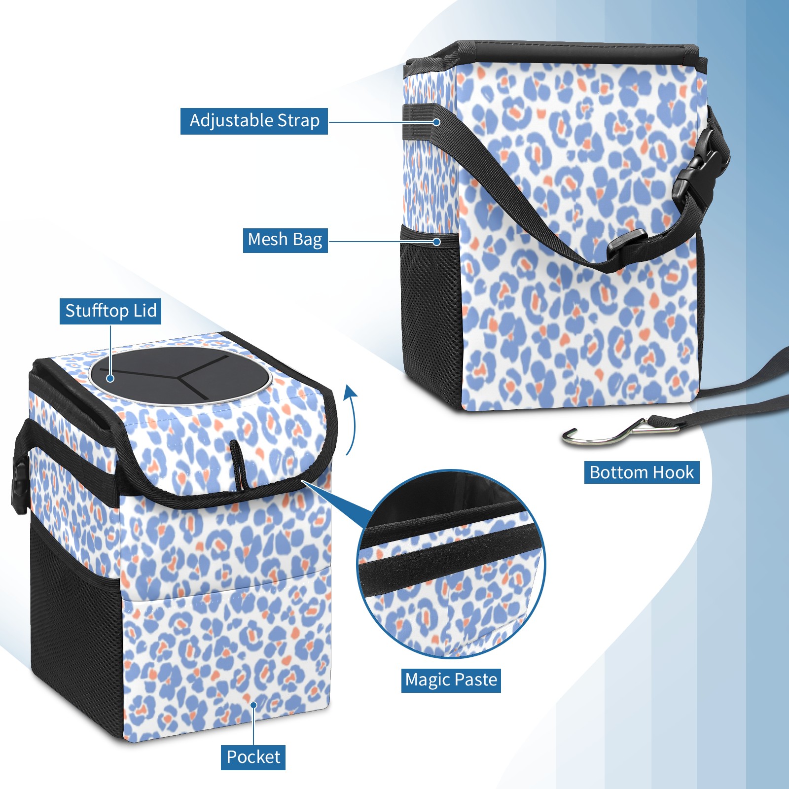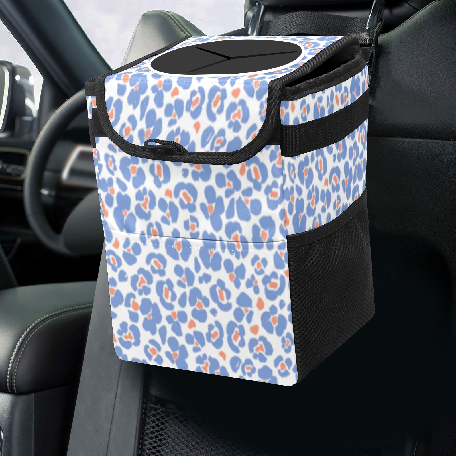 Car Trash Can with Lid, Small Portable Hanging Automotive Garbage Bin for Vehicles, Leakproof Waste Bag Container for SUV Truck Van Interior Auto Travel Road Trips(Blue Leopard)