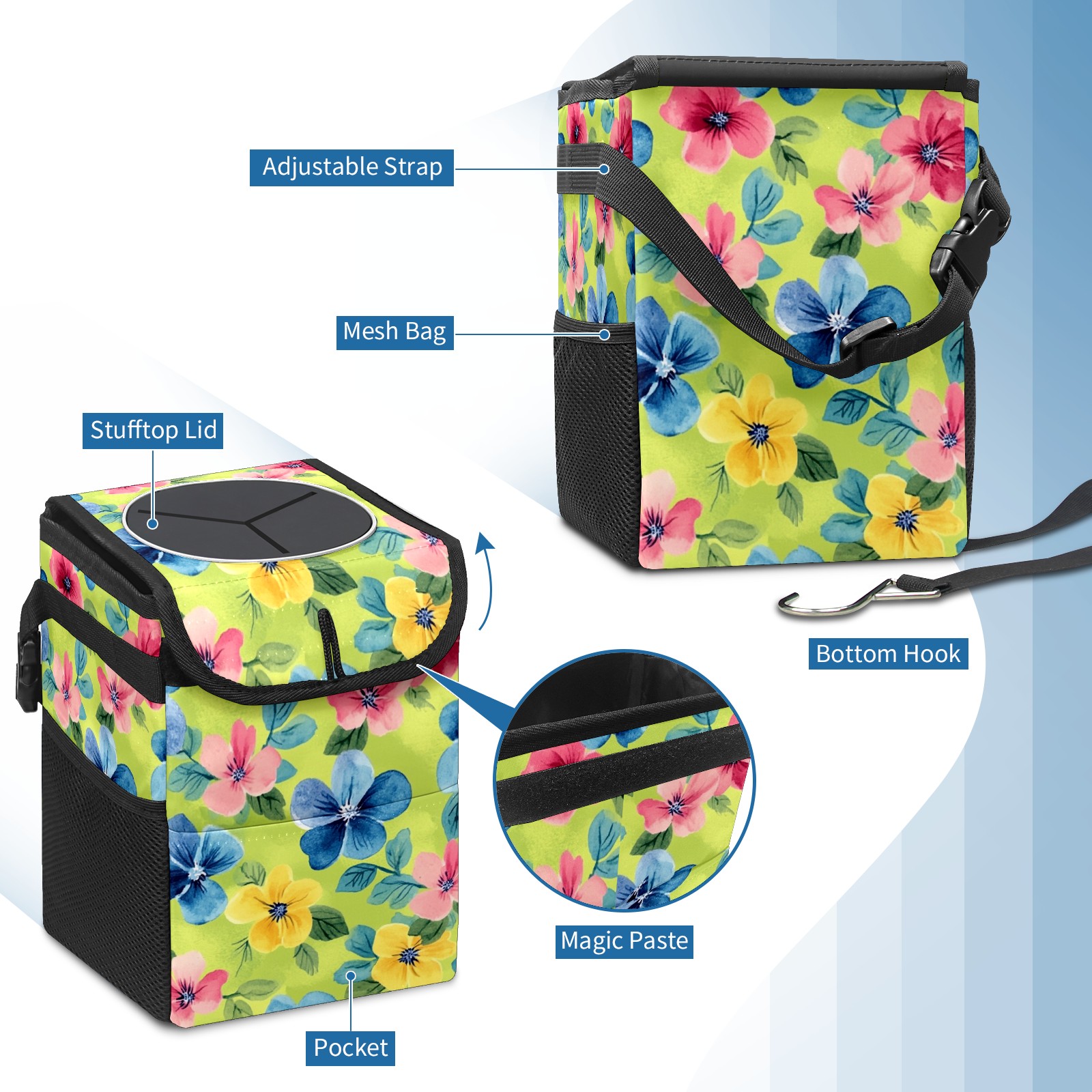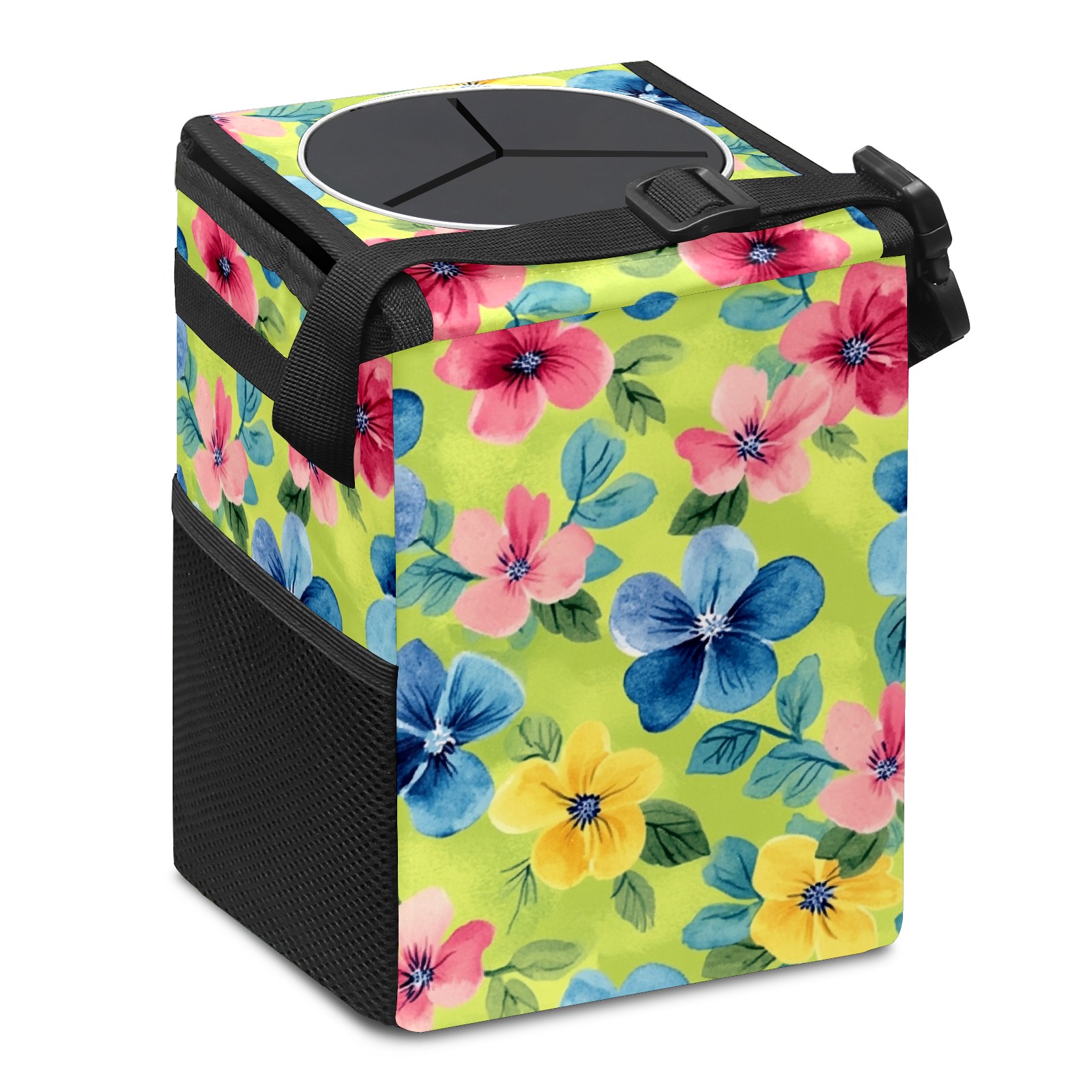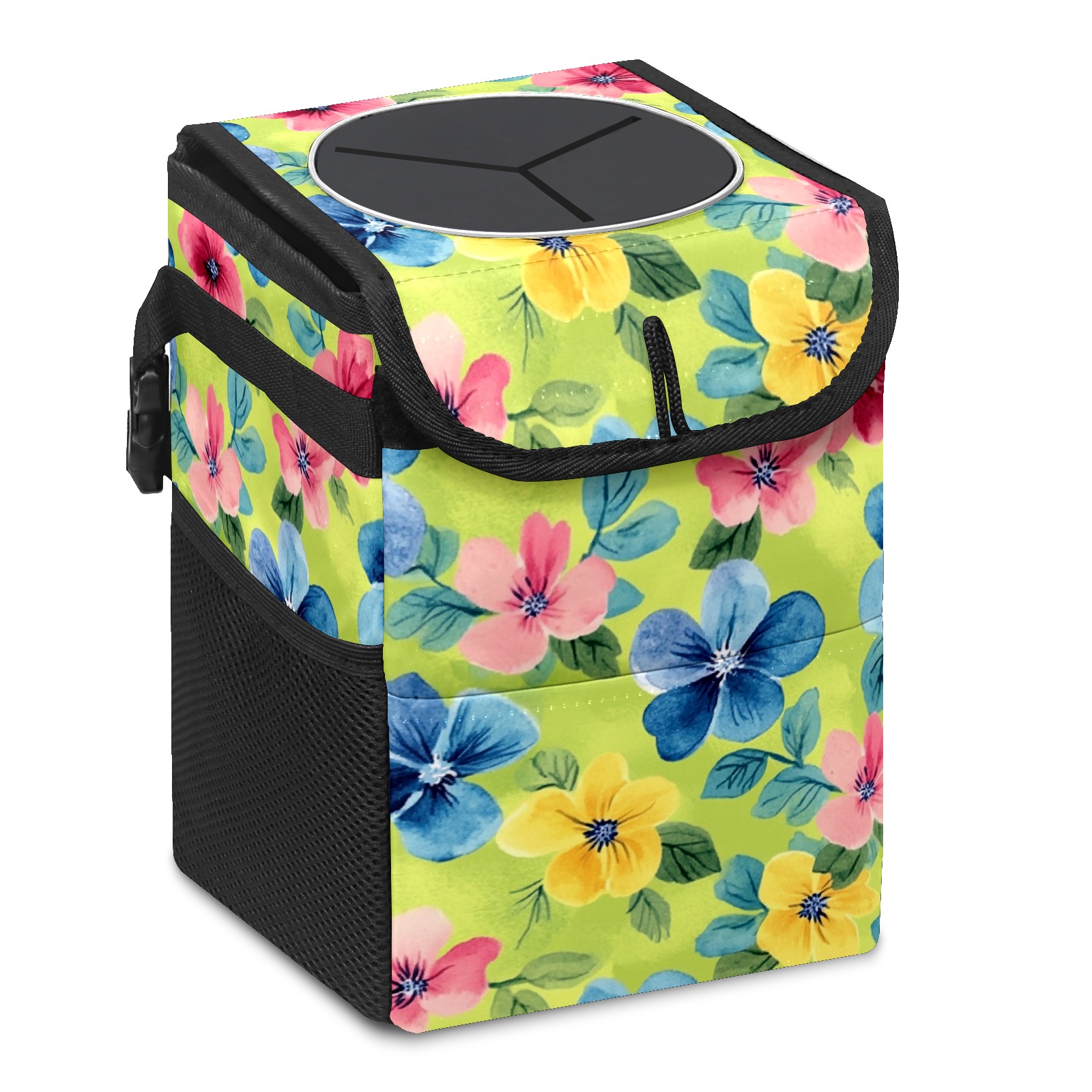 Car Trash Can with Lid, Small Portable Hanging Automotive Garbage Bin for Vehicles, Leakproof Waste Bag Container for SUV Truck Van Interior Auto Travel Road Trips(Watercolor Flowers)