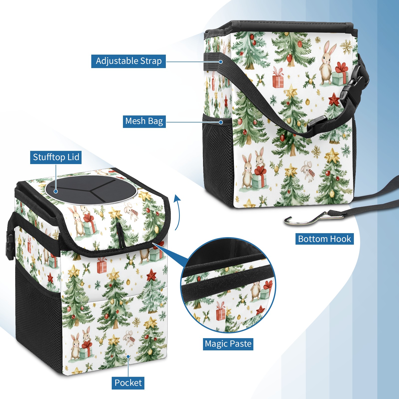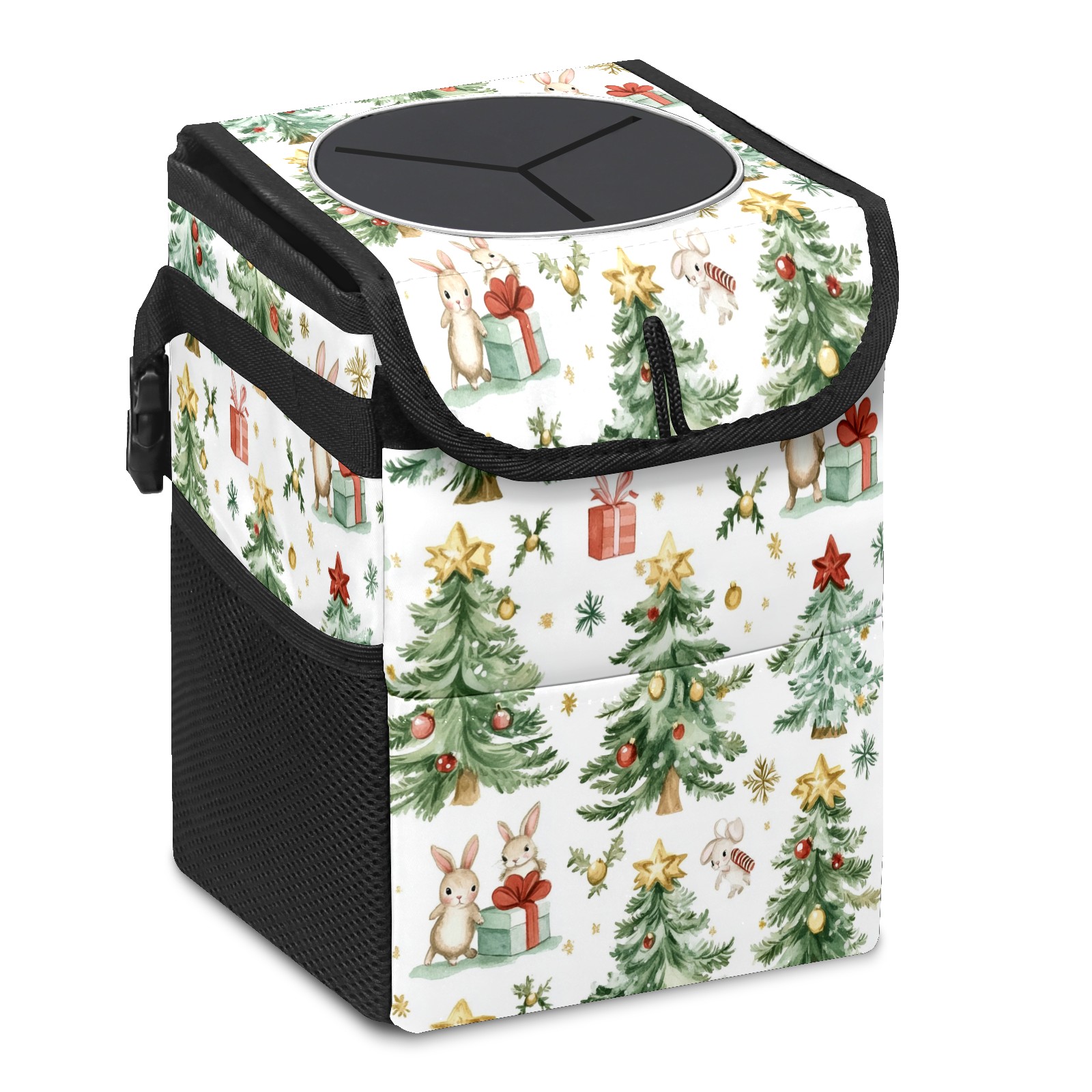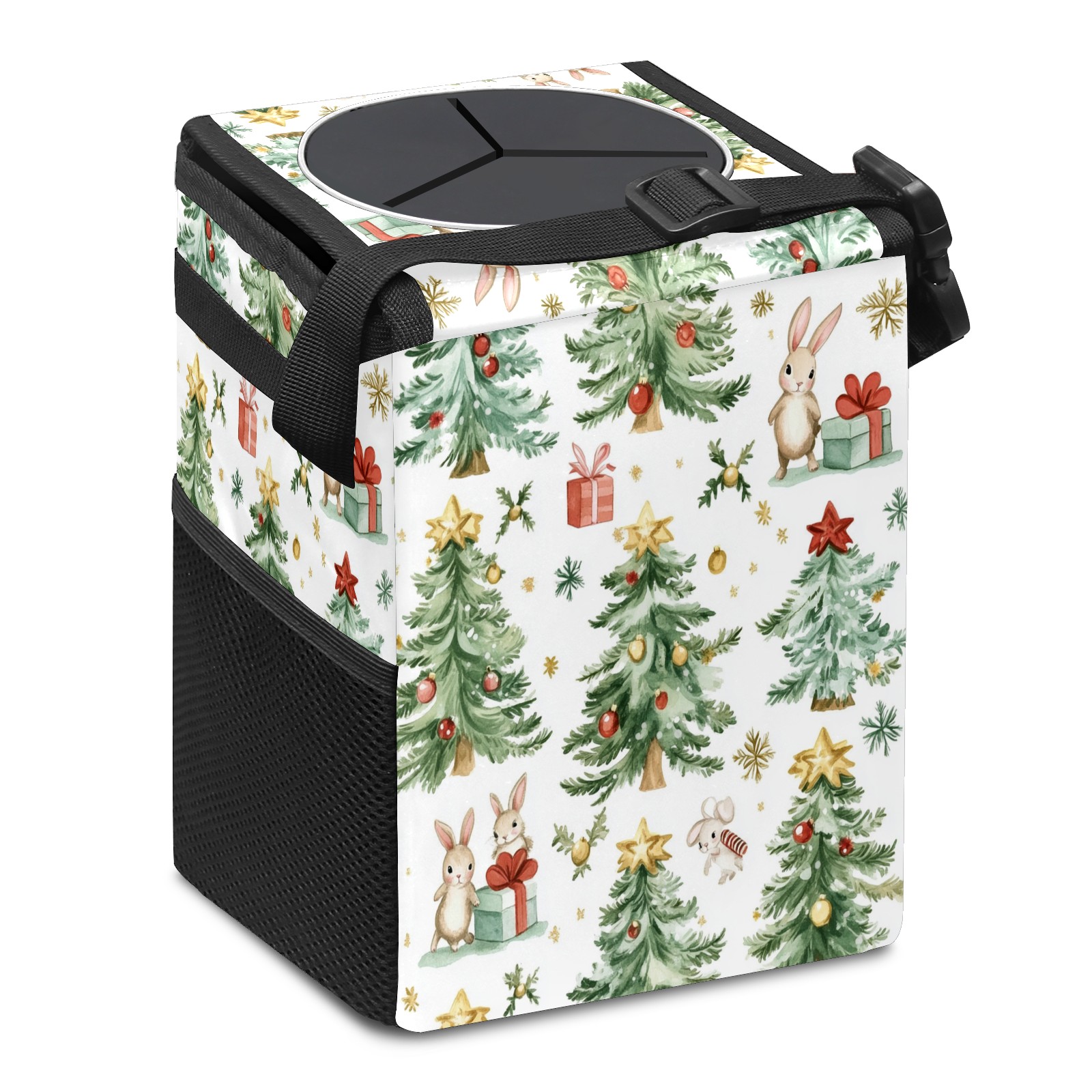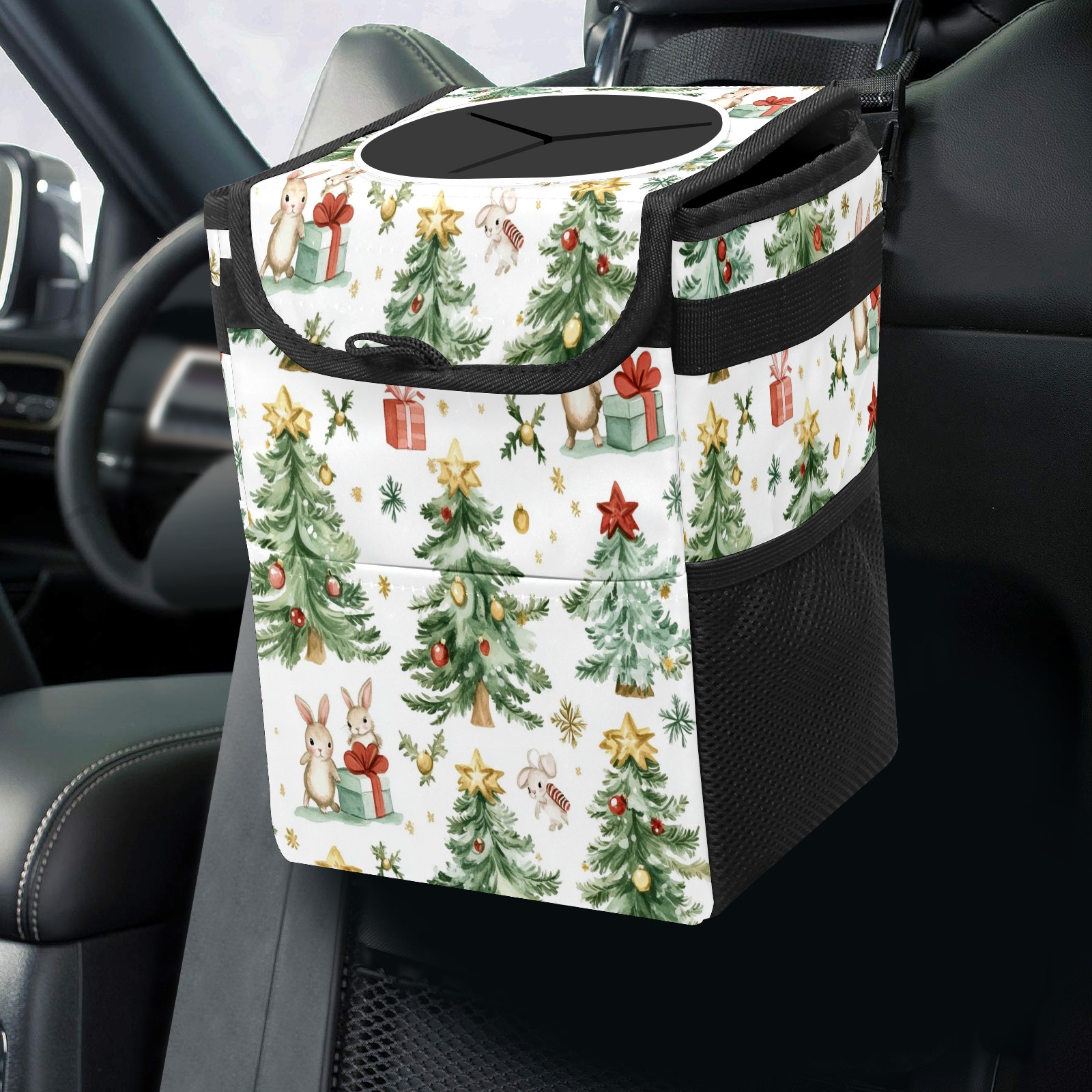 Car Trash Can with Lid, Small Portable Hanging Automotive Garbage Bin for Vehicles, Leakproof Waste Bag Container for SUV Truck Van Interior Auto Travel Road Trips(Watercolor Christmas Trees)