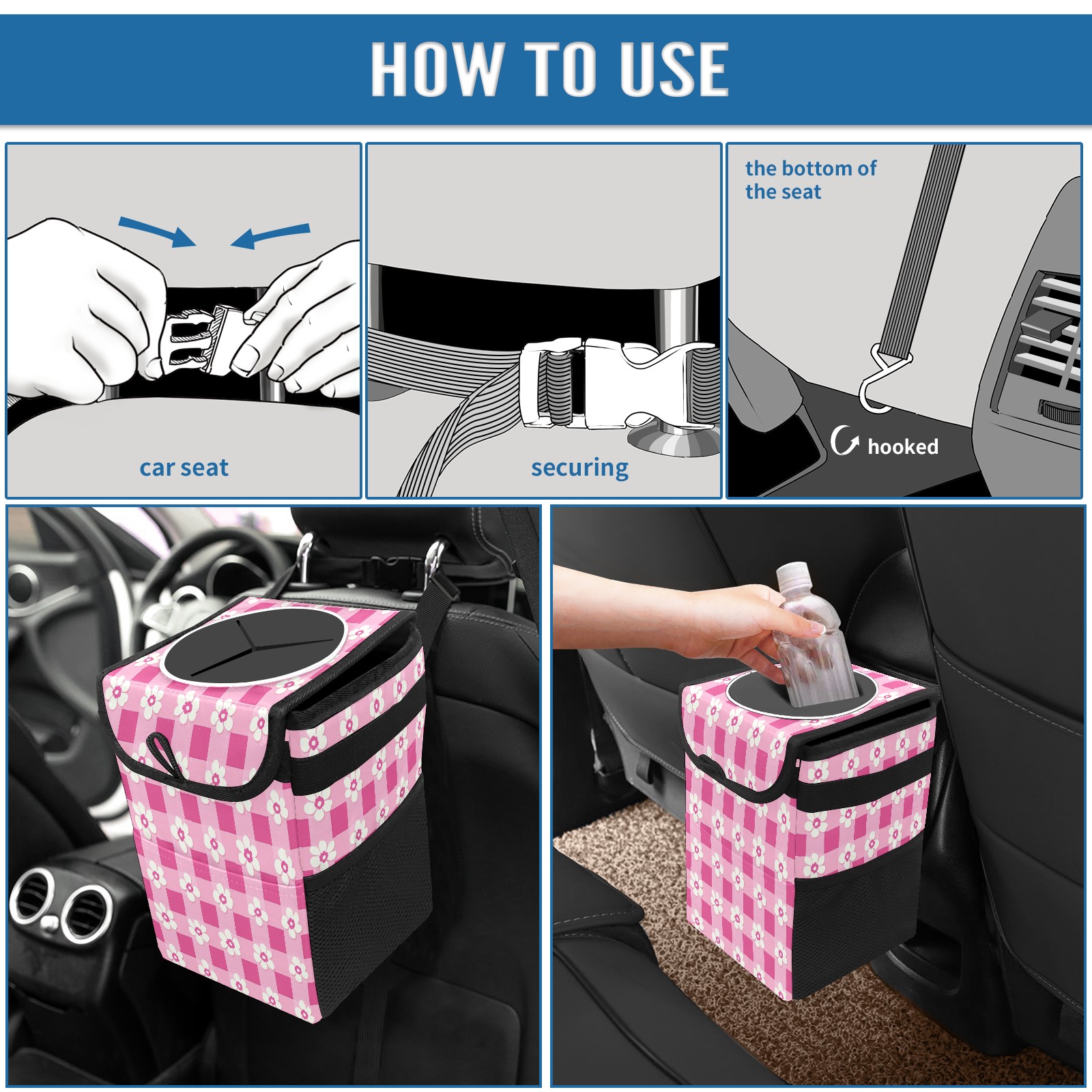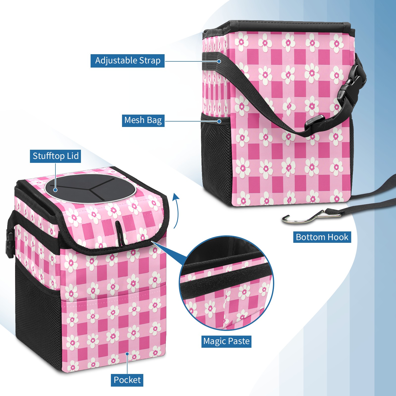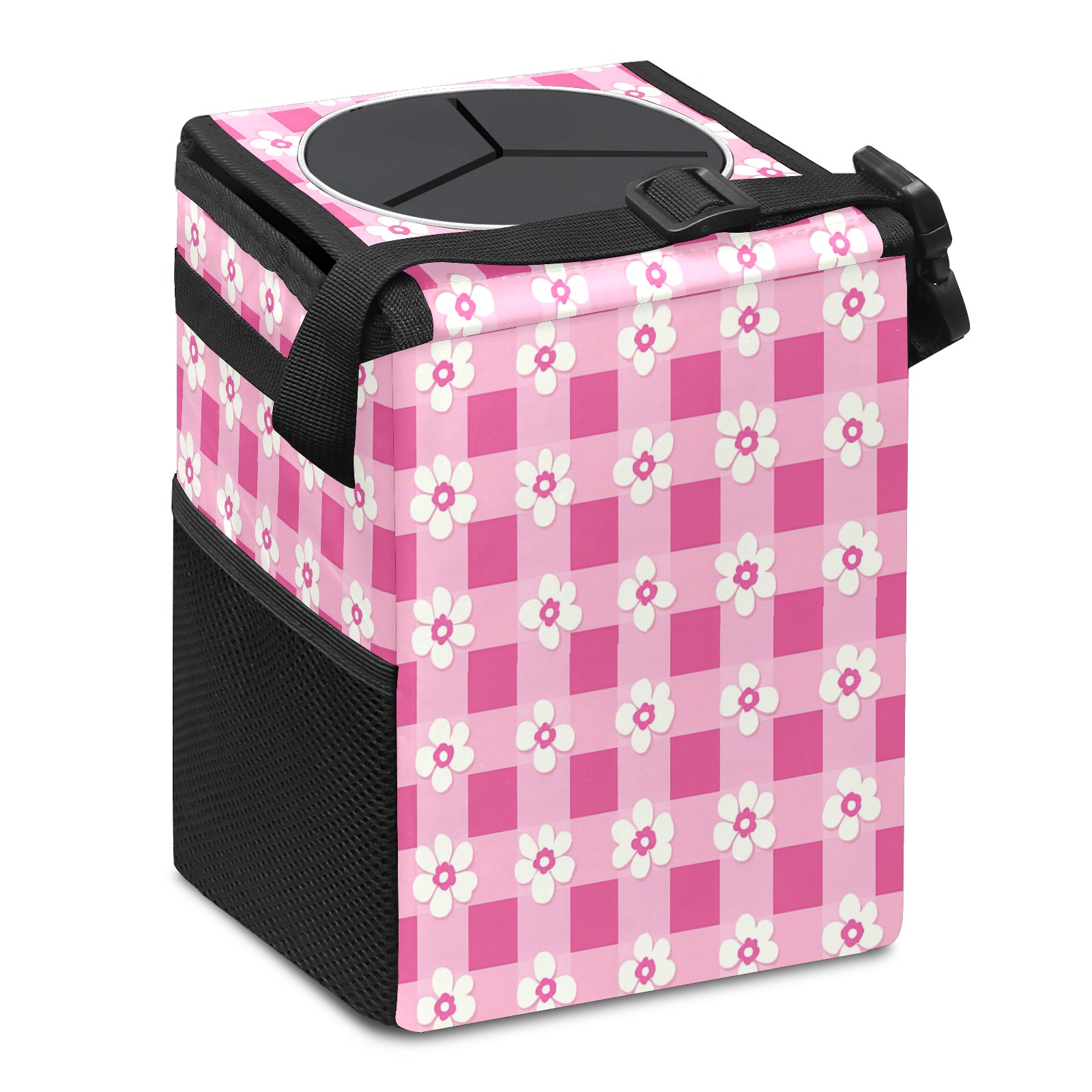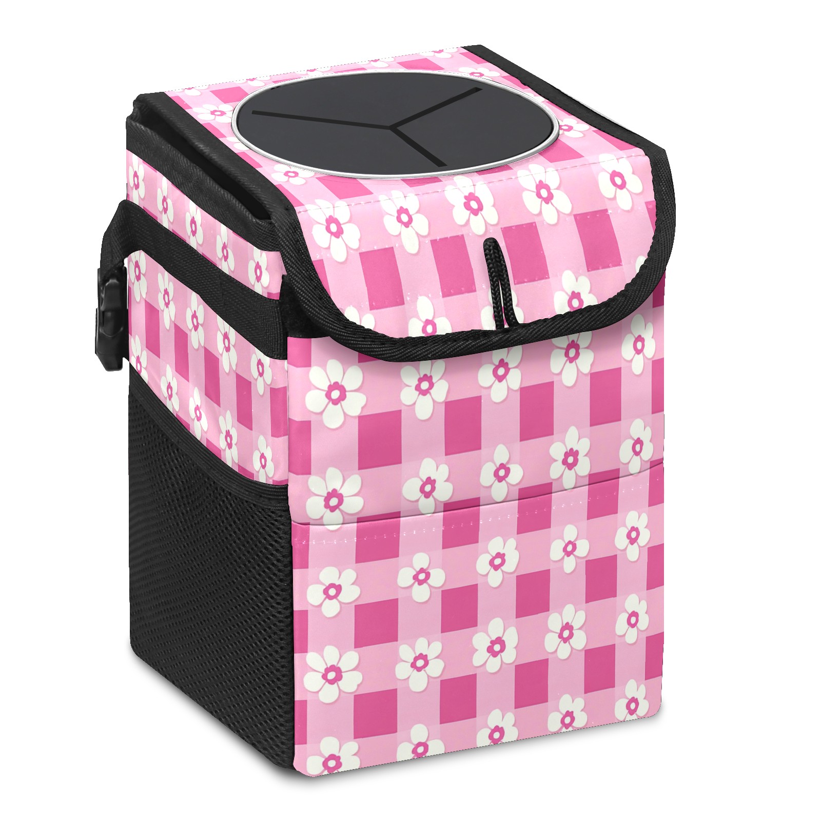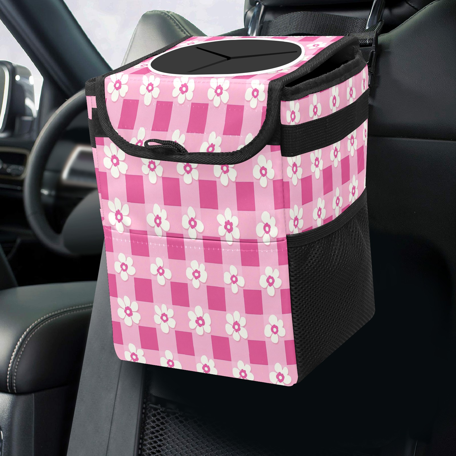 Car Trash Can with Lid, Small Portable Hanging Automotive Garbage Bin for Vehicles, Leakproof Waste Bag Container for SUV Truck Van Interior Auto Travel Road Trips(Pink Gingham With Flowers)