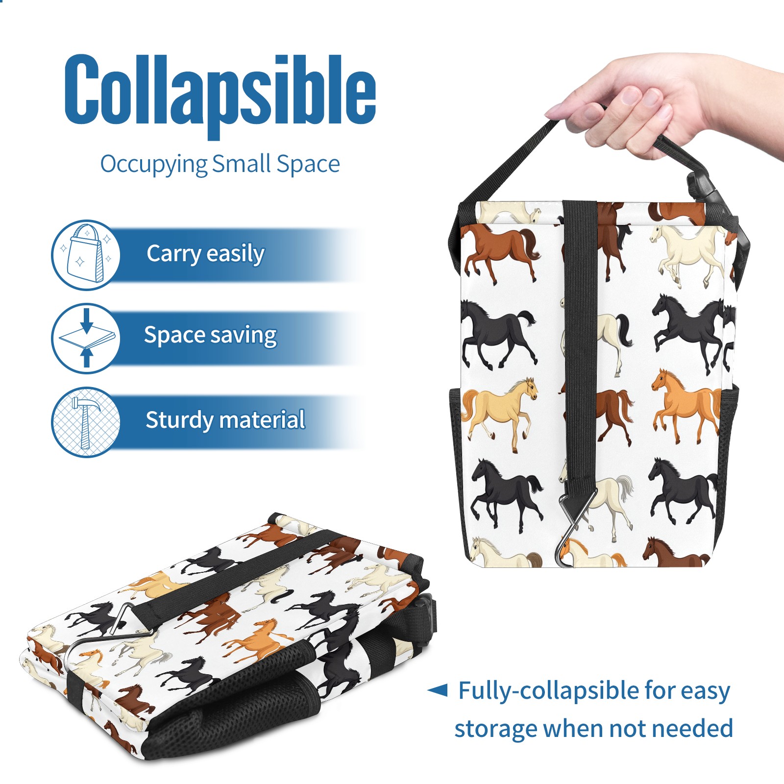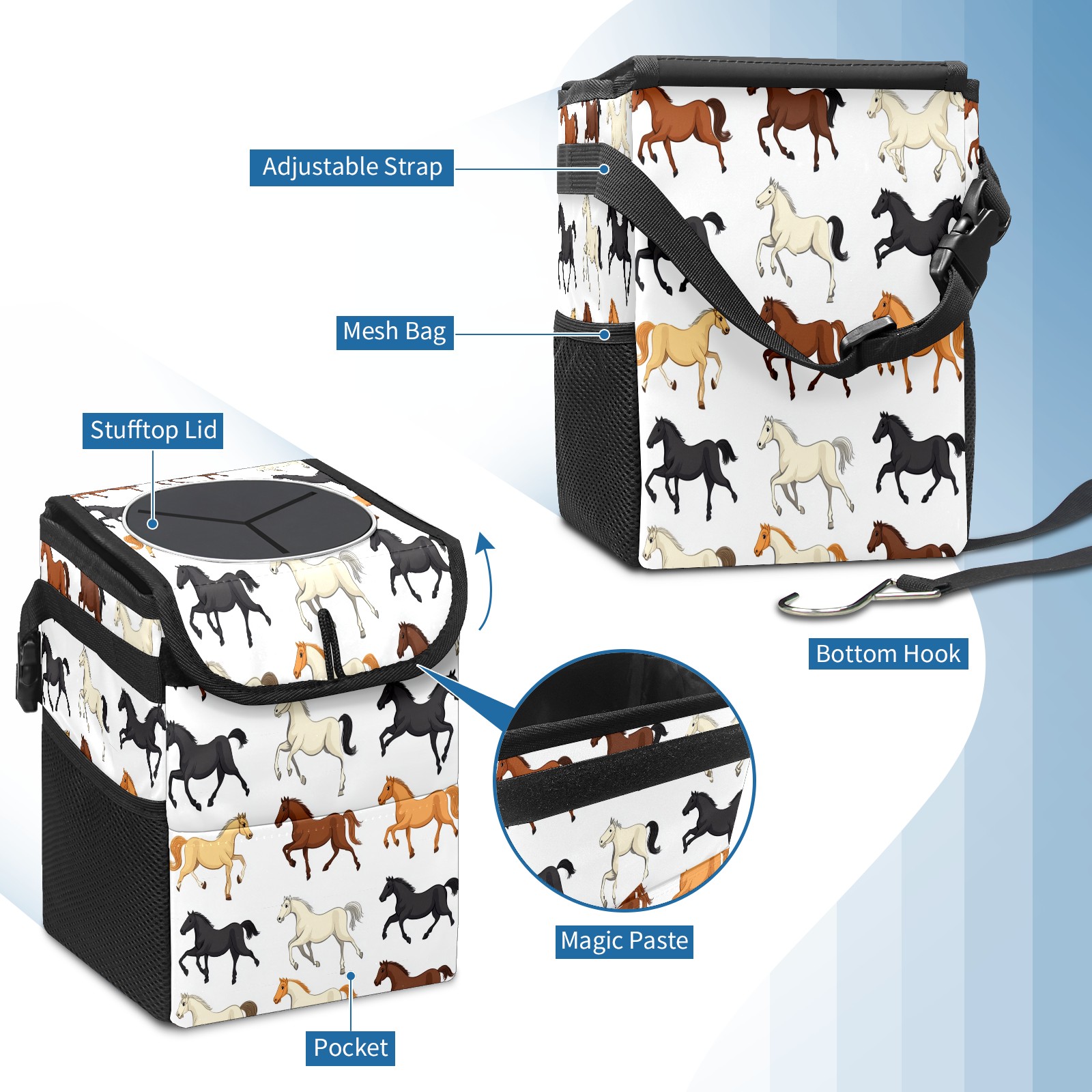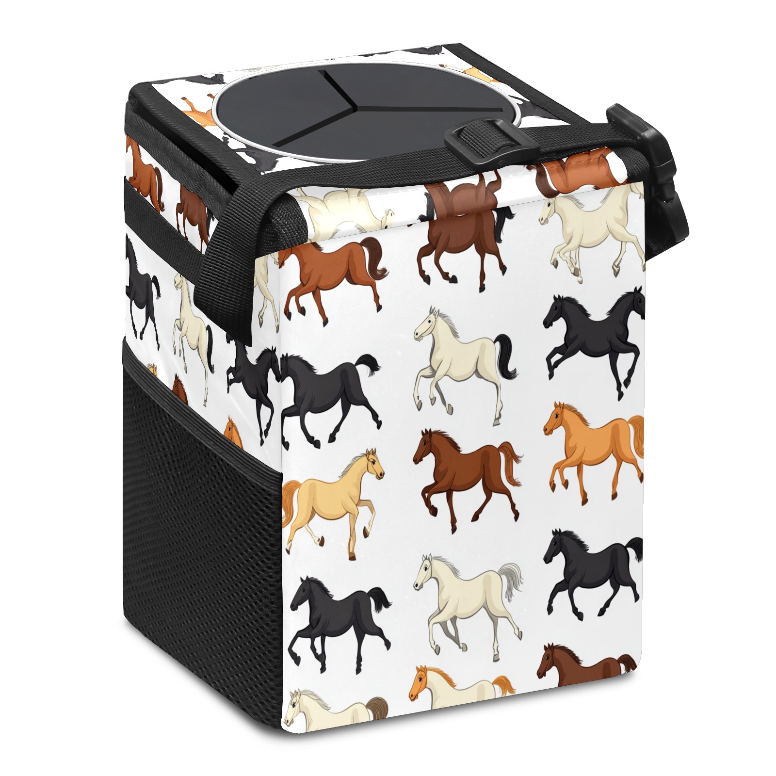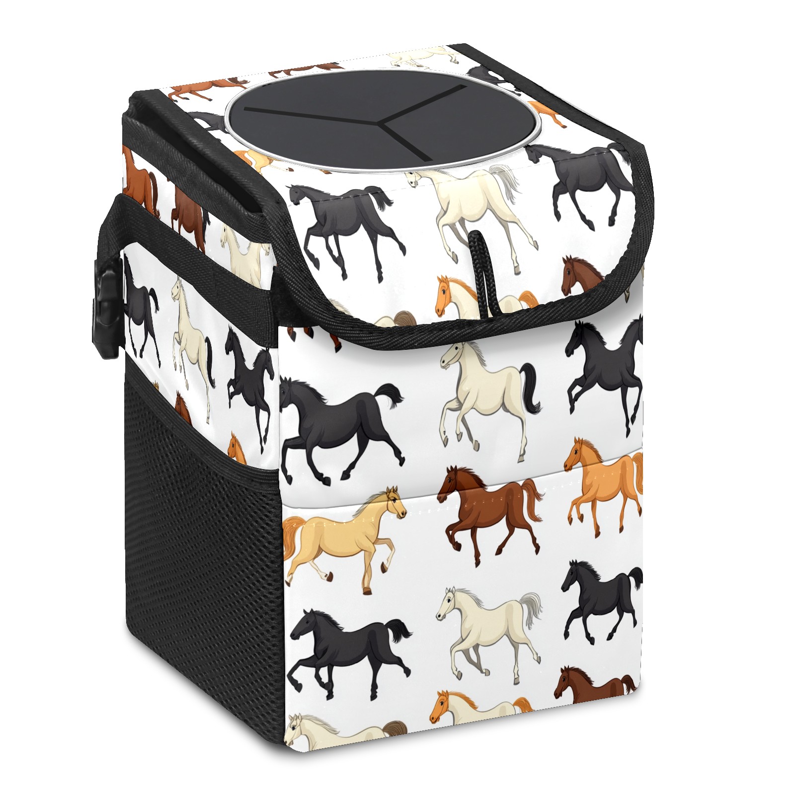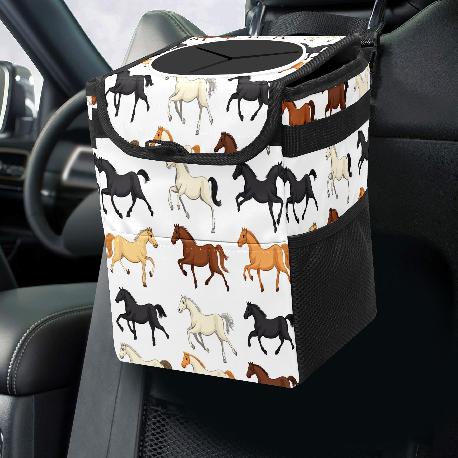 Car Trash Can with Lid, Small Portable Hanging Automotive Garbage Bin for Vehicles, Leakproof Waste Bag Container for SUV Truck Van Interior Auto Travel Road Trips(Horses)