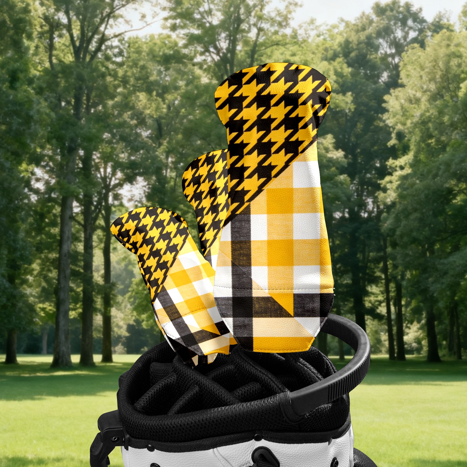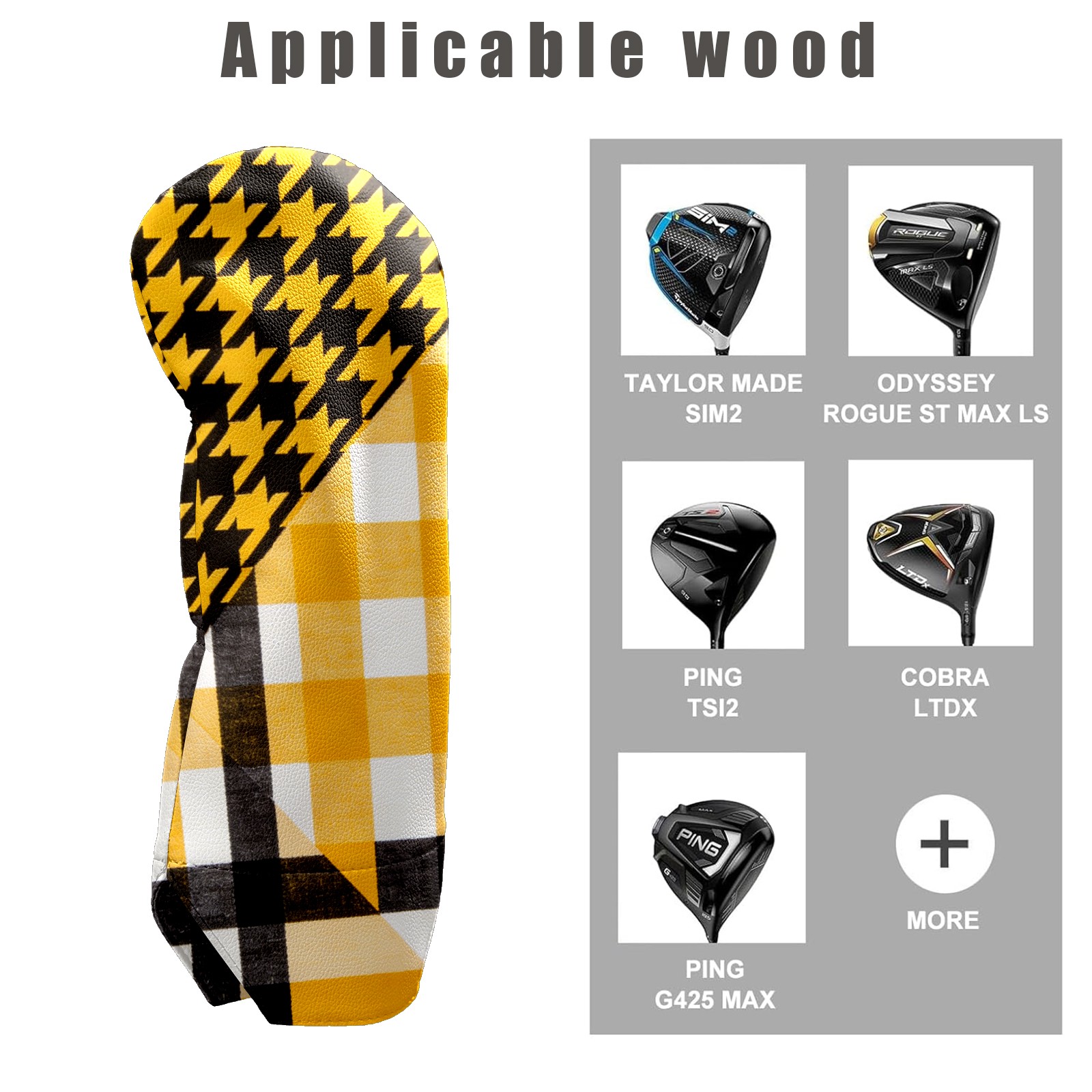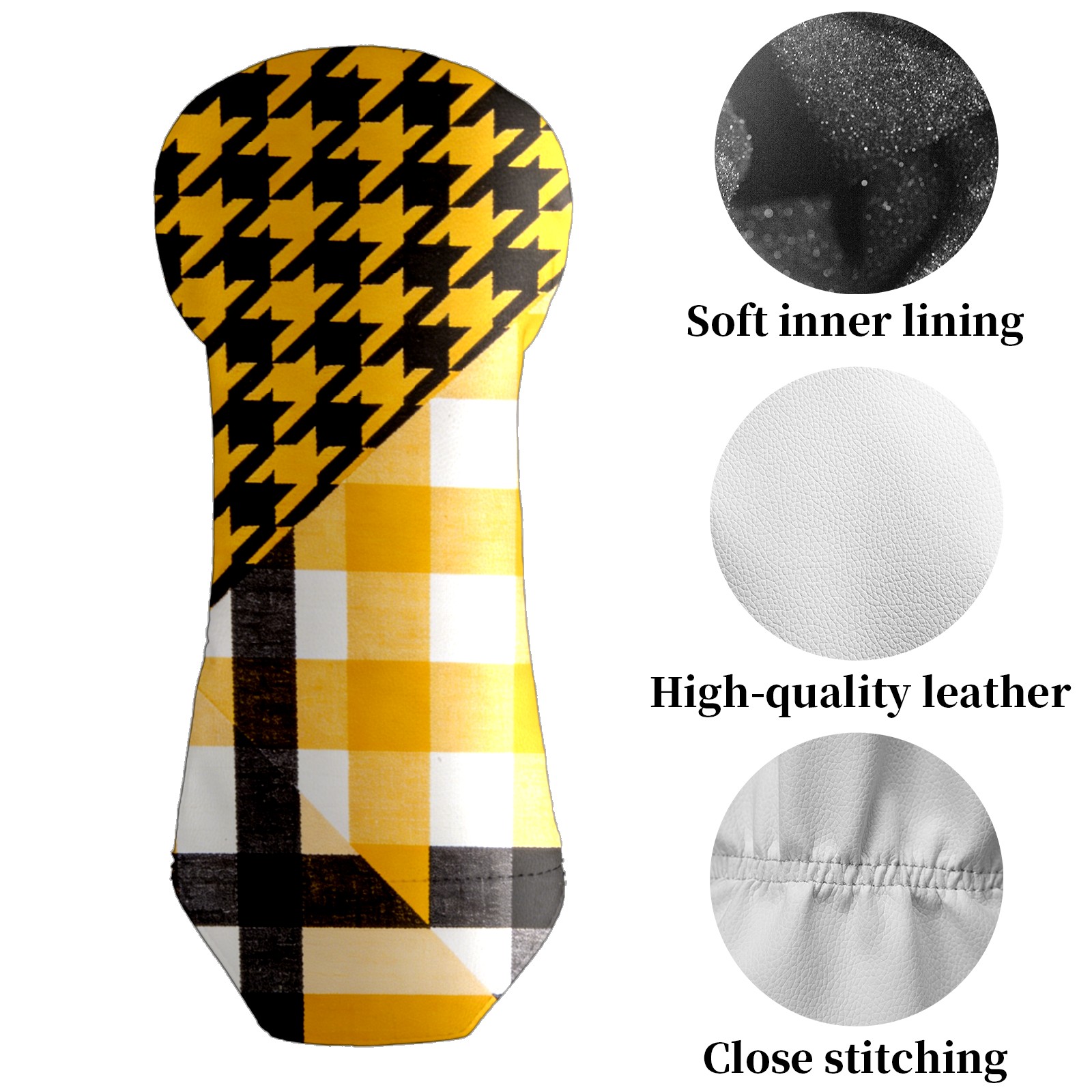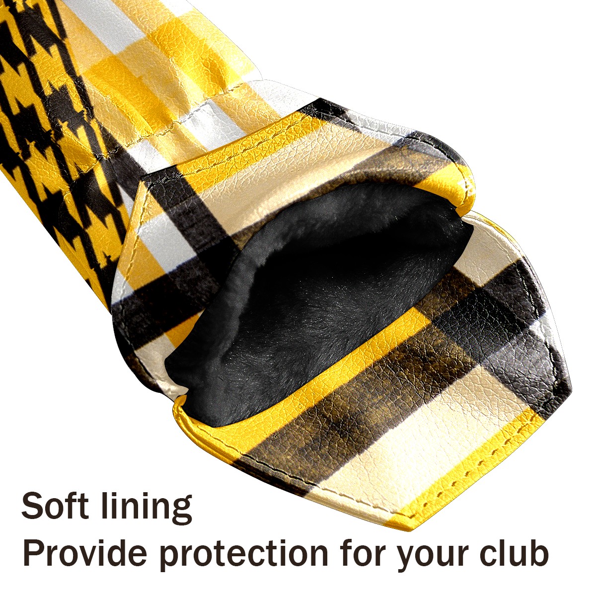 Golf Club Covers for Woods and Driver Hybrid Velvet Cover Leather Golf Headcover for Most Brand Club Men Women Yellow Black Houndstooth Pattern