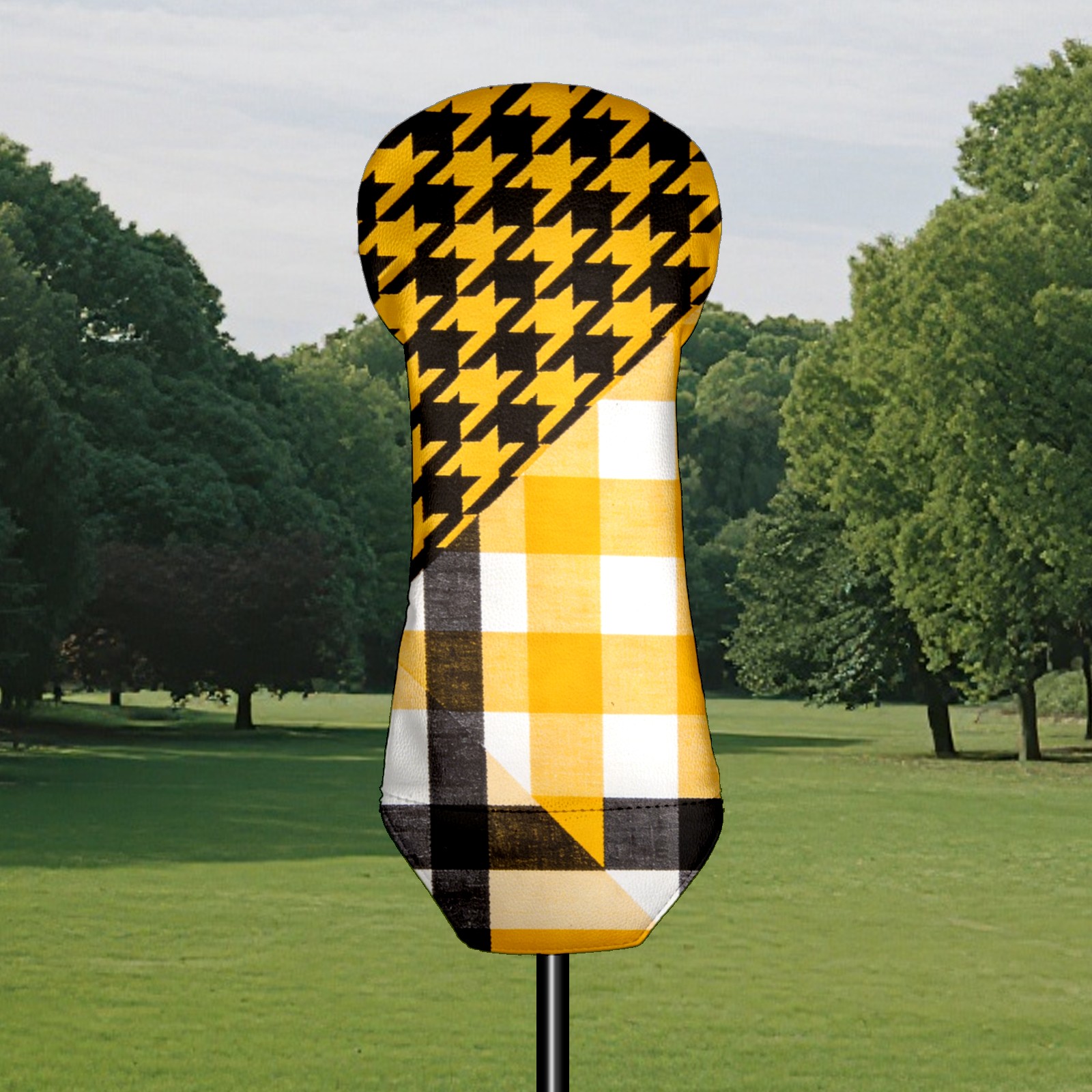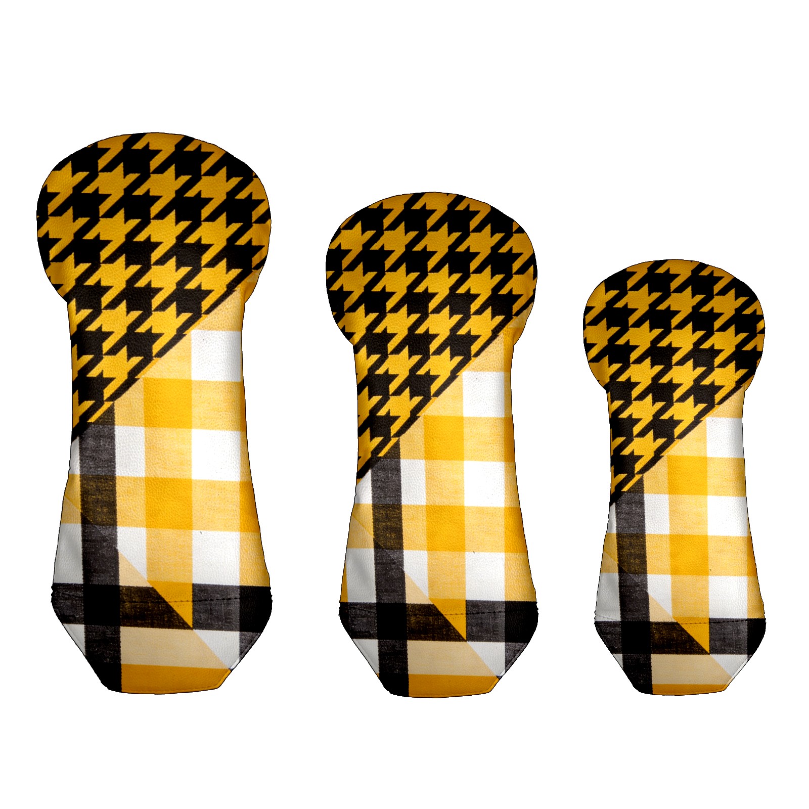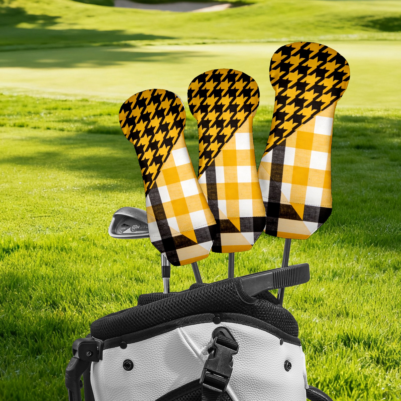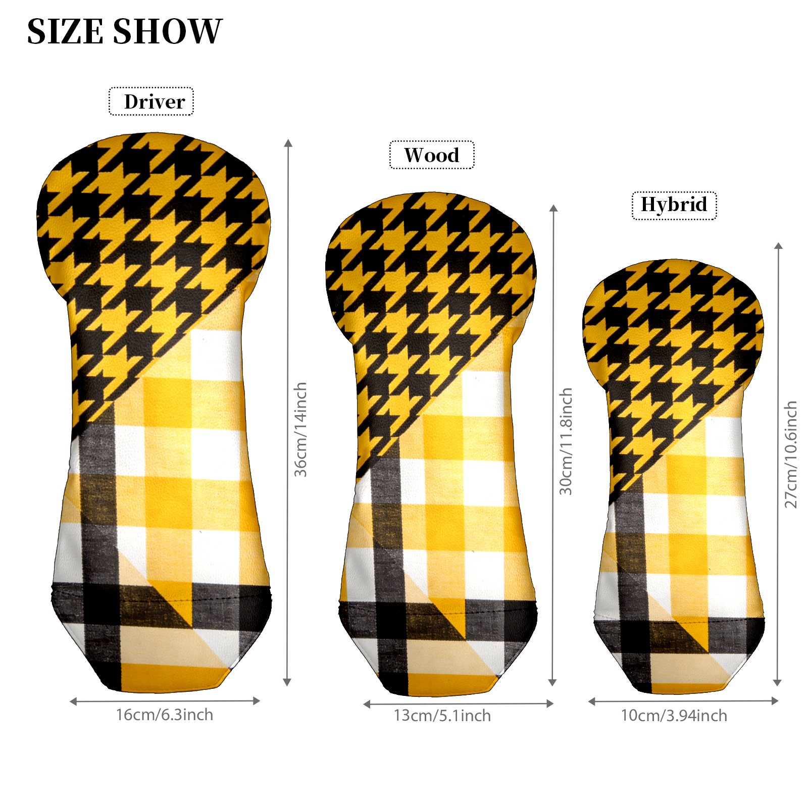 Golf Club Covers for Woods and Driver Hybrid Velvet Cover Leather Golf Headcover for Most Brand Club Men Women Yellow Black Houndstooth Pattern