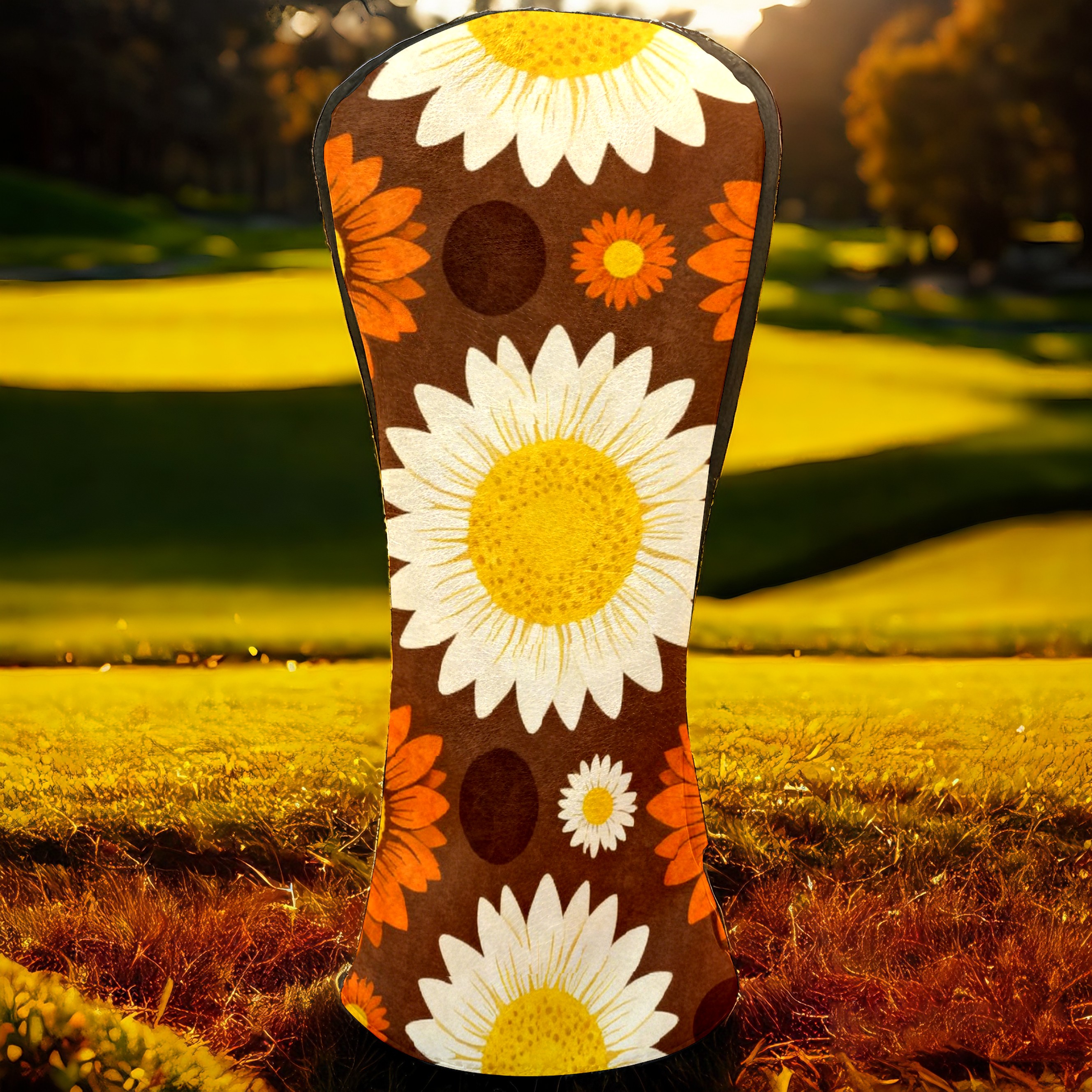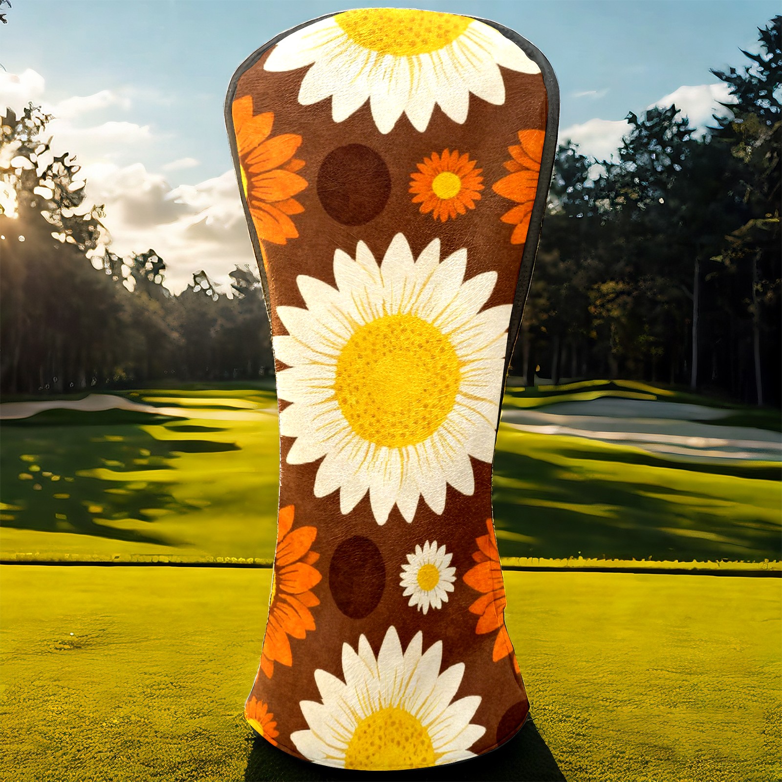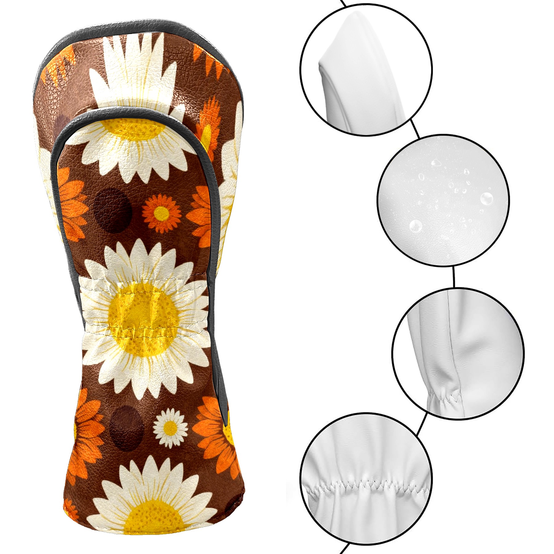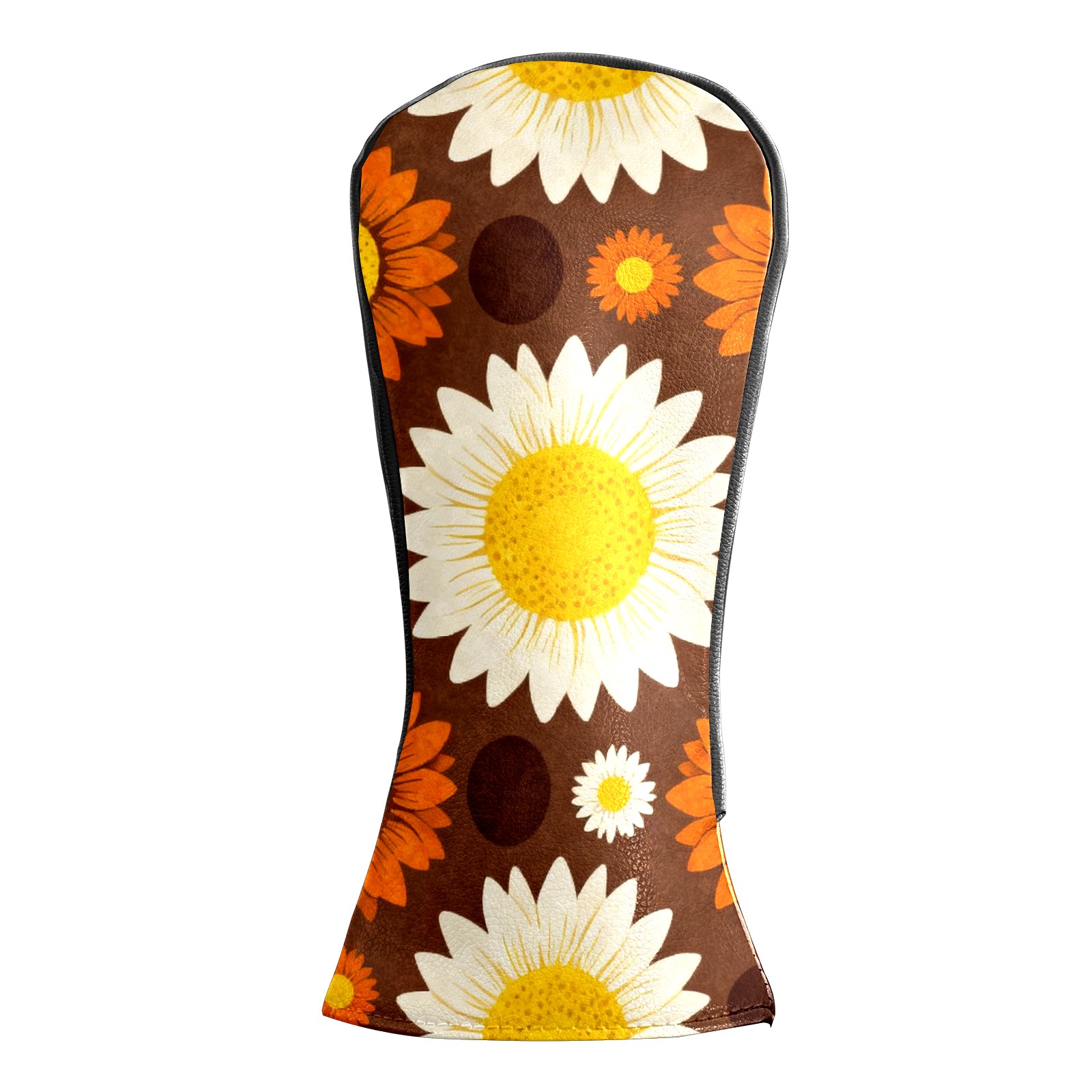 Golf Driver Head Covers Fairway Wood Headcovers, Premium Leather Golf Club Covers with Anti-Scratch Lining 1/3/5 Wood Cover for golf clubs for Women Men (Jimeng-2025-12-15-9141-70年代复古图案设计,深棕色背景上的无缝向日葵图案,大型白色花瓣黄色花心的向日葵...)