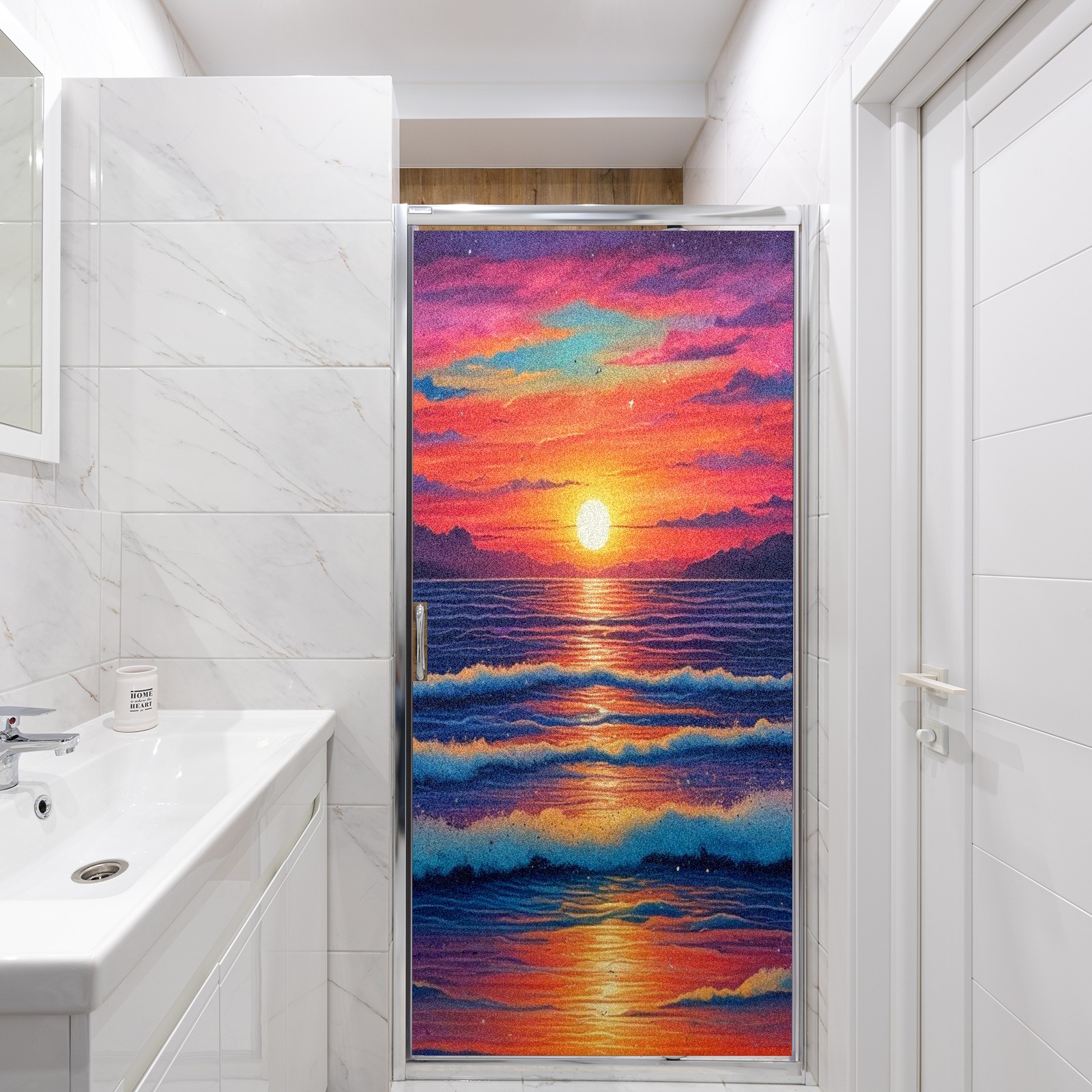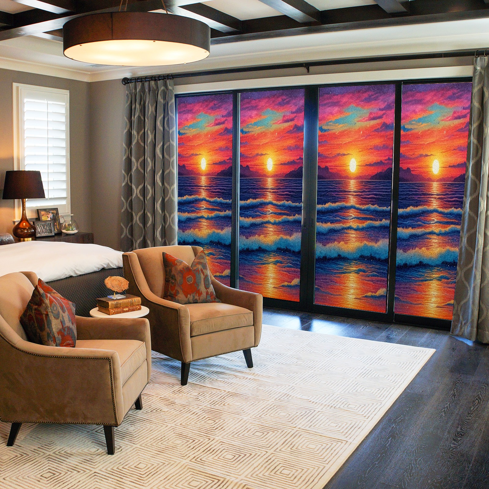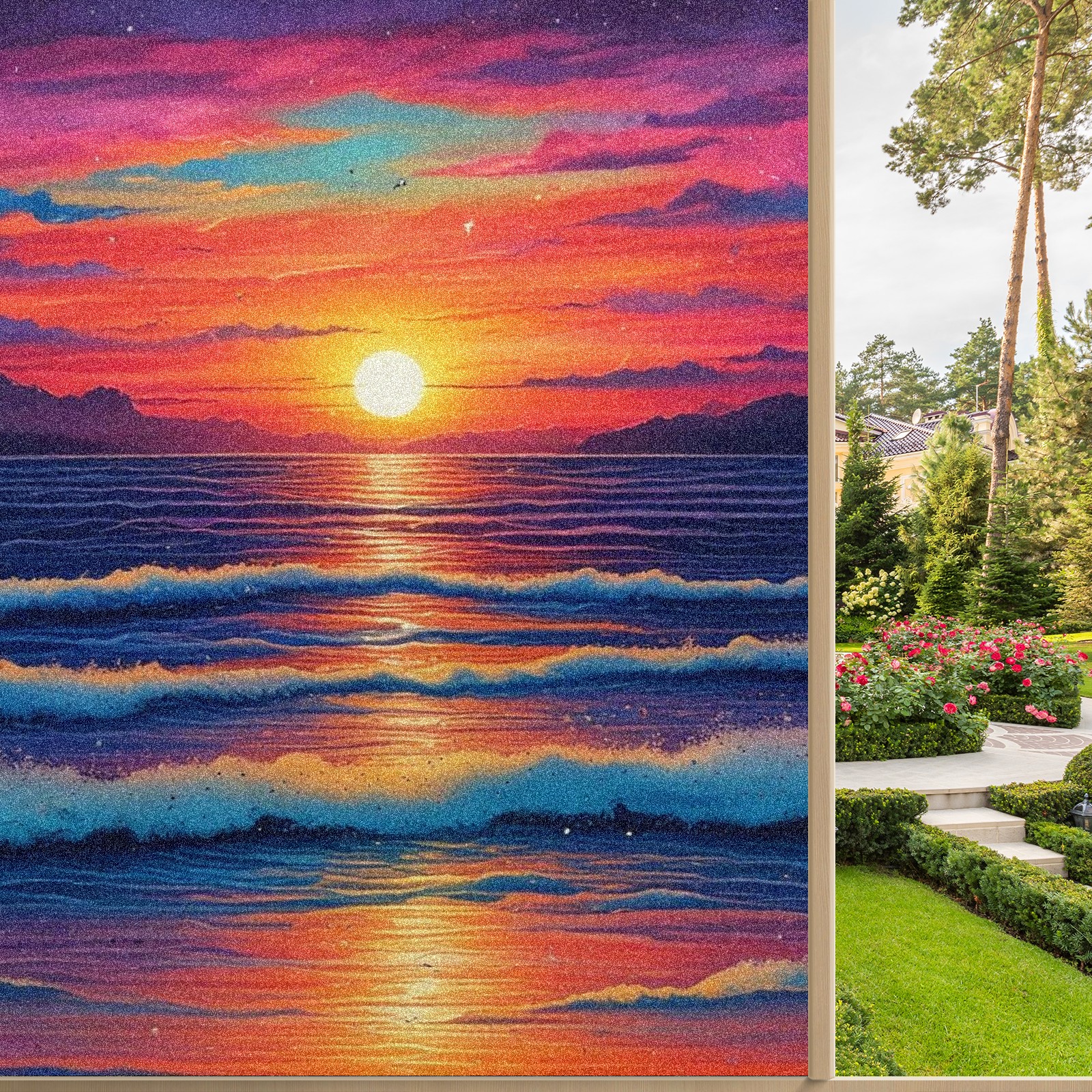 Window Privacy Film Frosted Stained Glass Film Decorative Static Cling for Bathroom Home Office Peel and Stick Window Film Red Sunset Beach(17.7x23.6in)