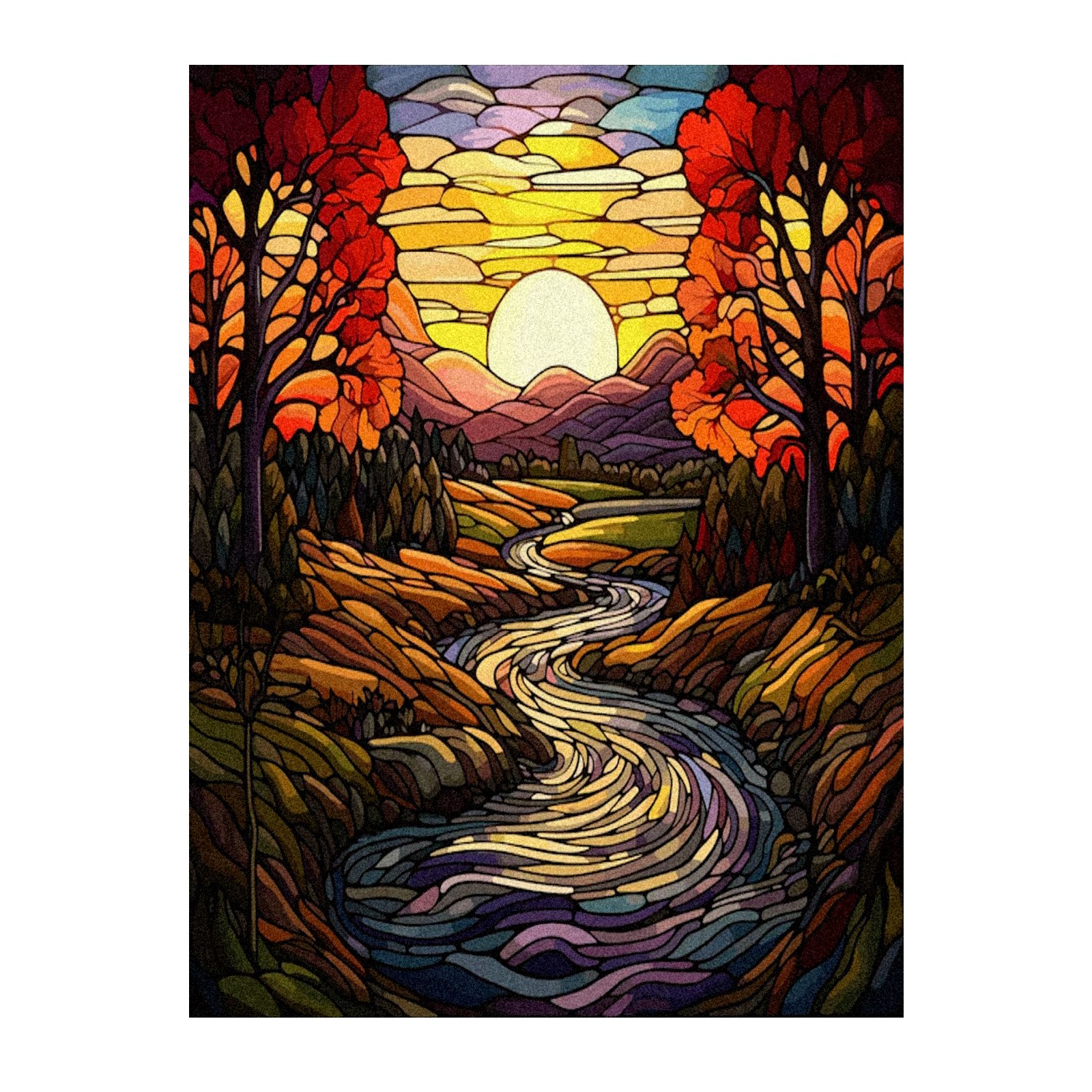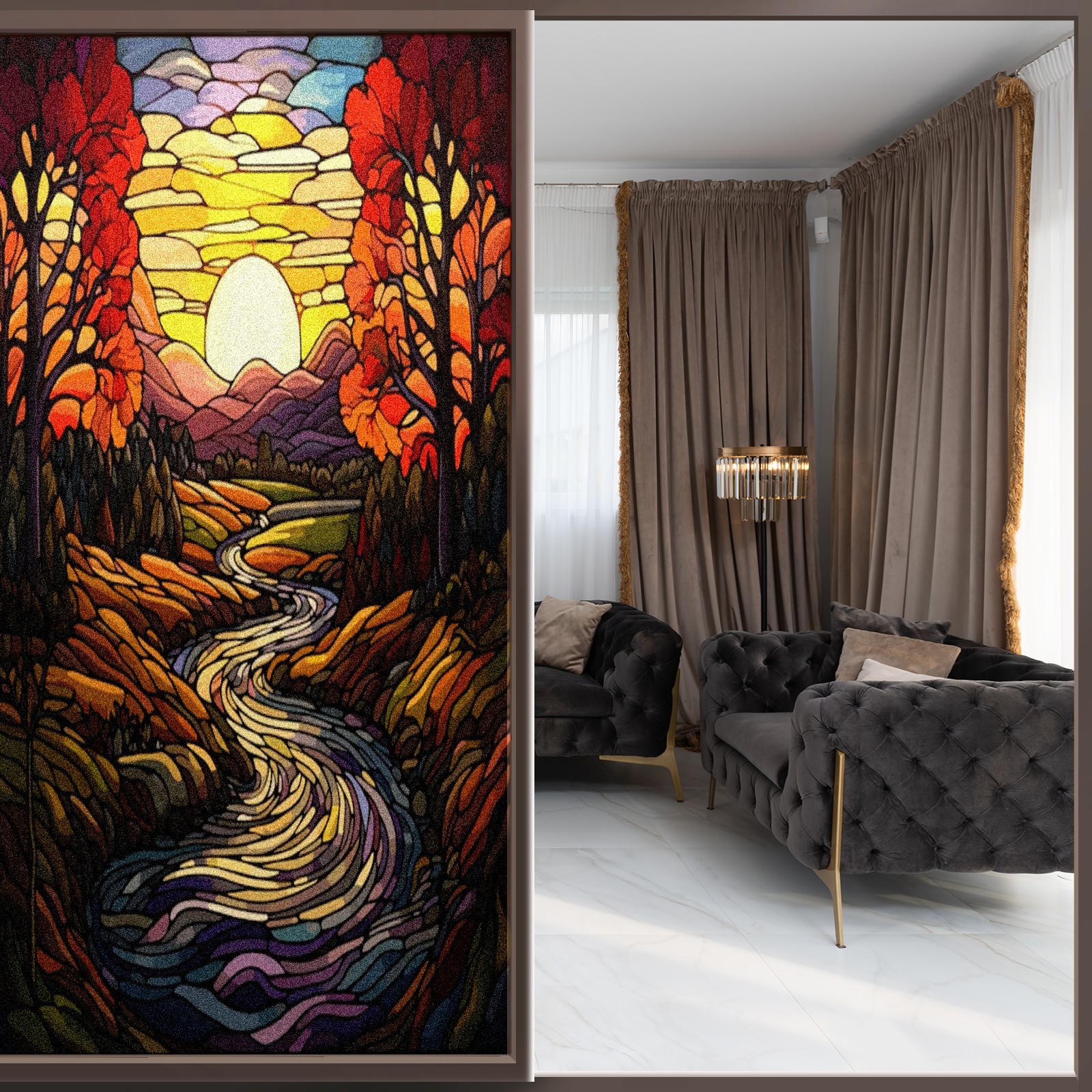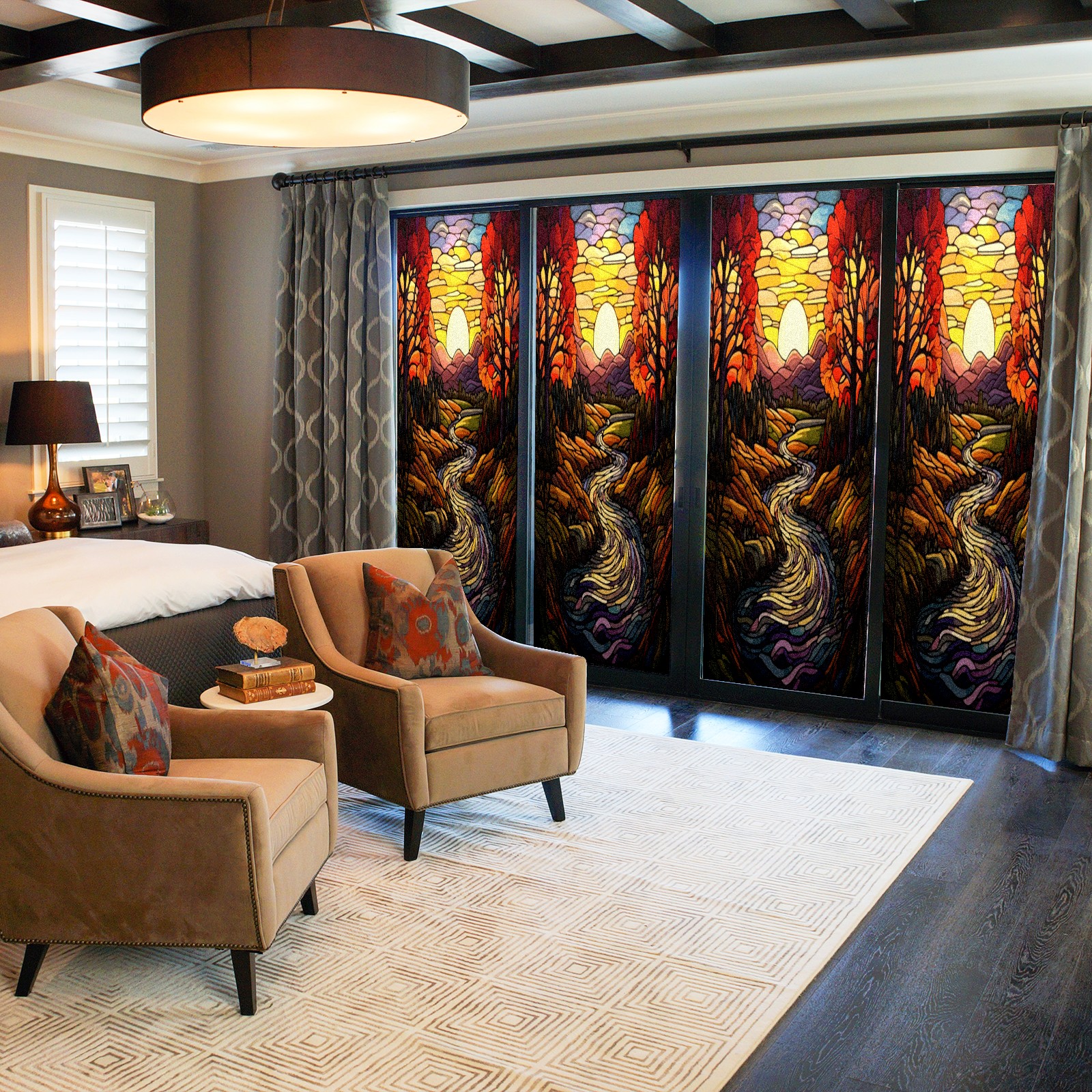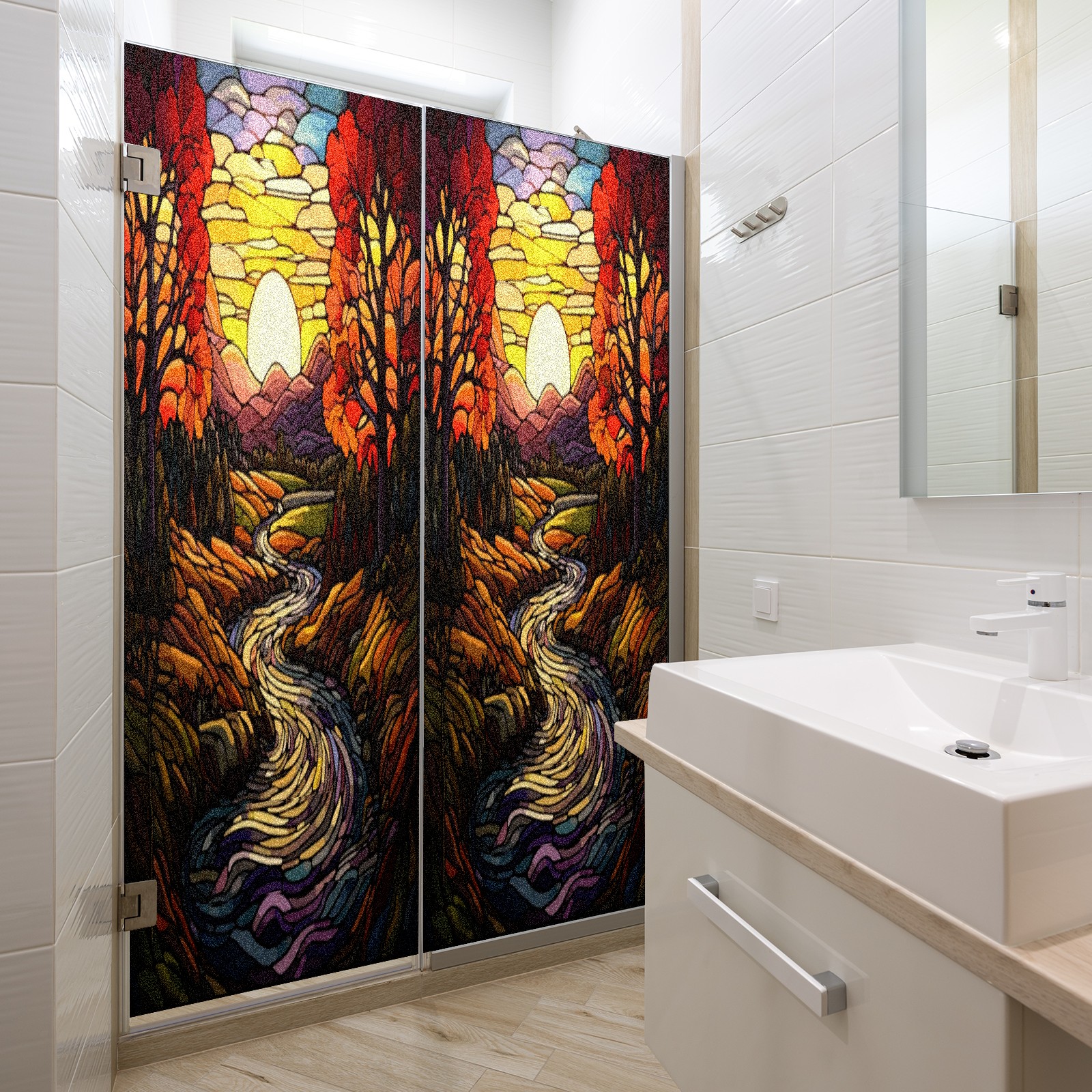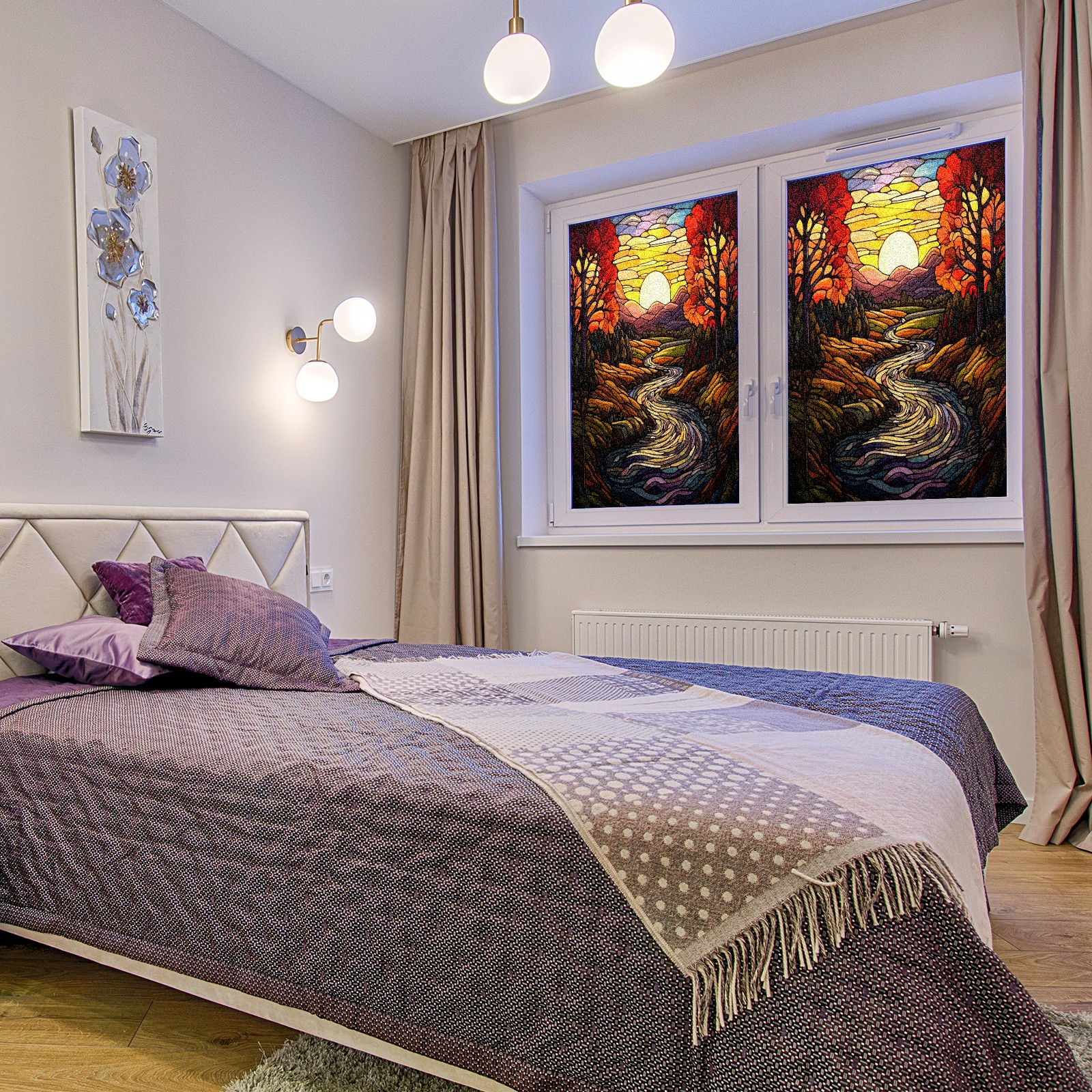 Window Privacy Film Frosted Stained Glass Film Decorative Static Cling for Bathroom Home Office Peel and Stick Window Film Colorful Sunset Forest(17.7x23.6in)