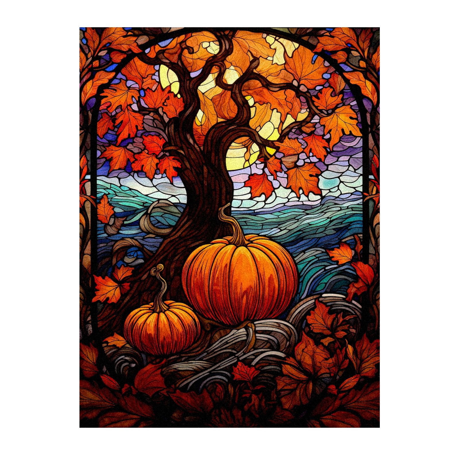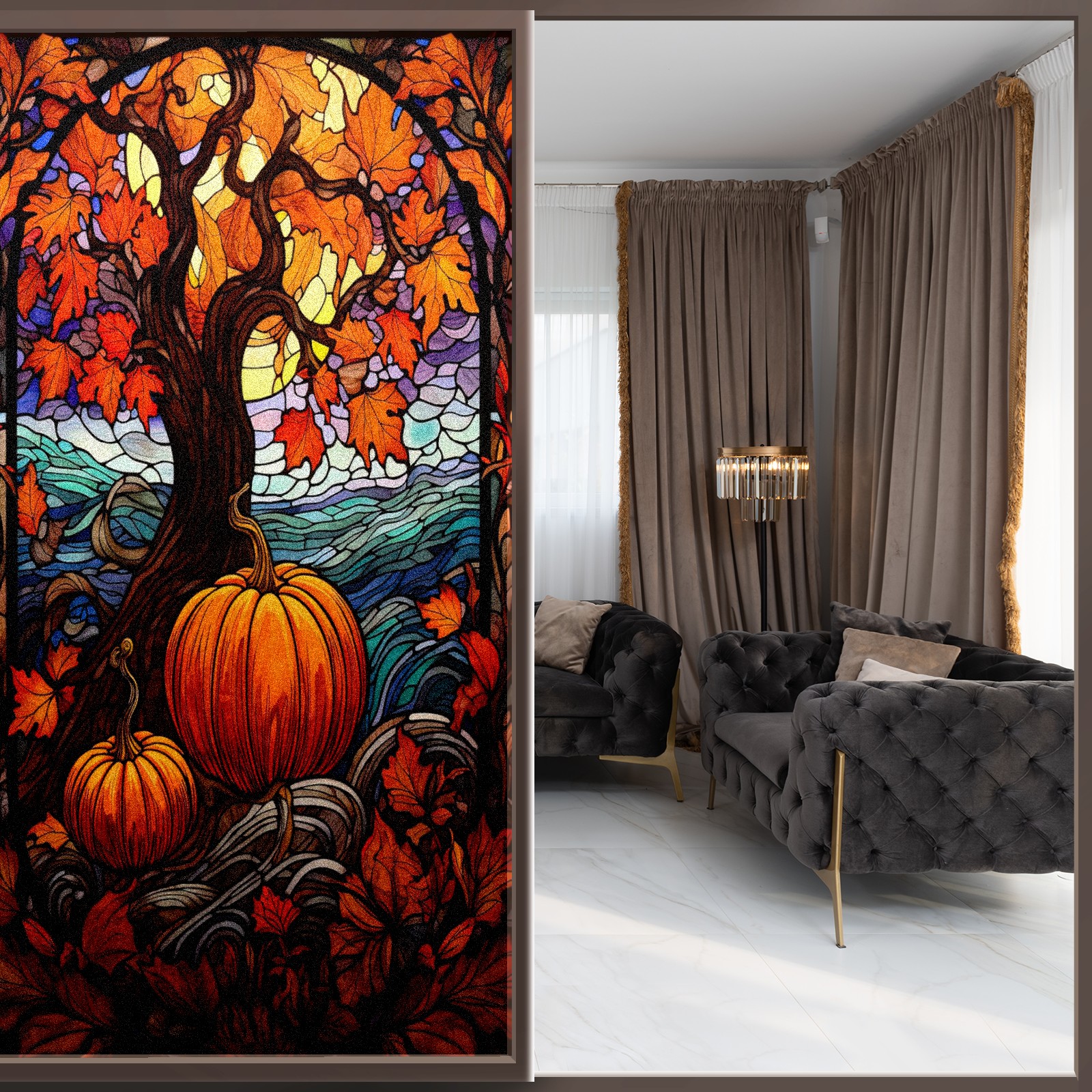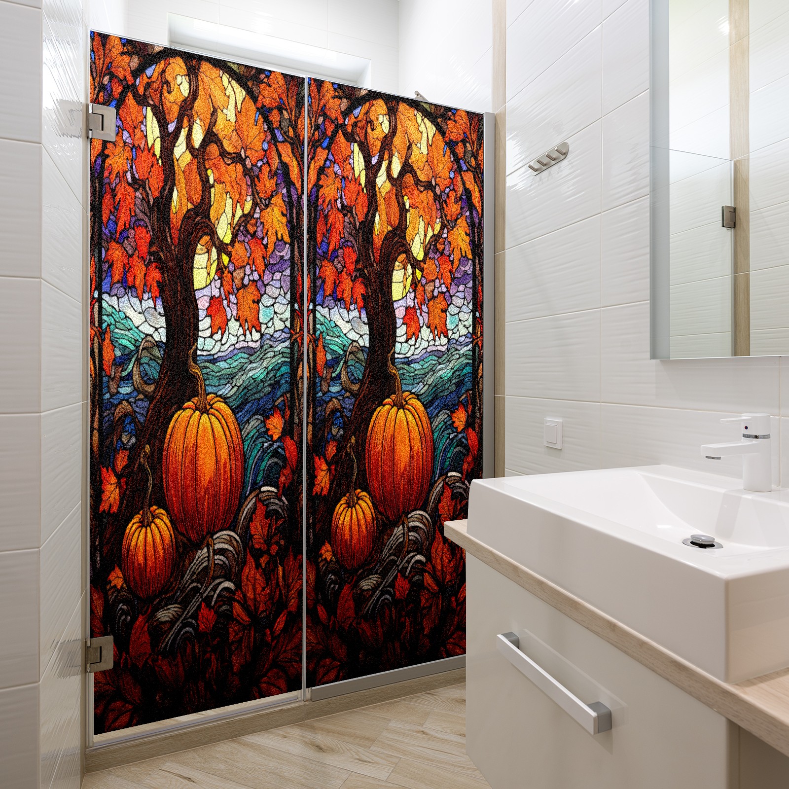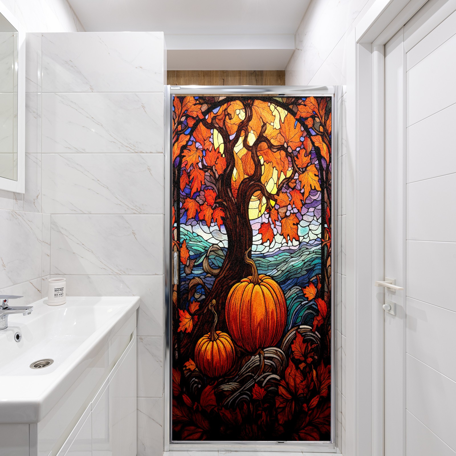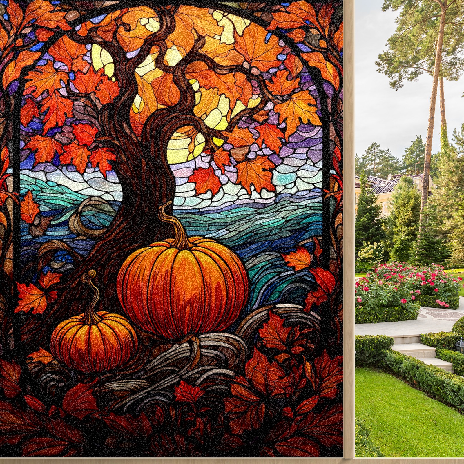 Window Privacy Film Frosted Stained Glass Film Decorative Static Cling for Bathroom Home Office Peel and Stick Window Film Yellow Tree Pumpkin(17.7x23.6in)
