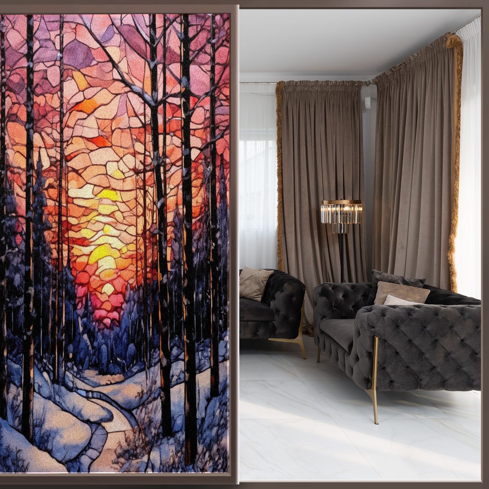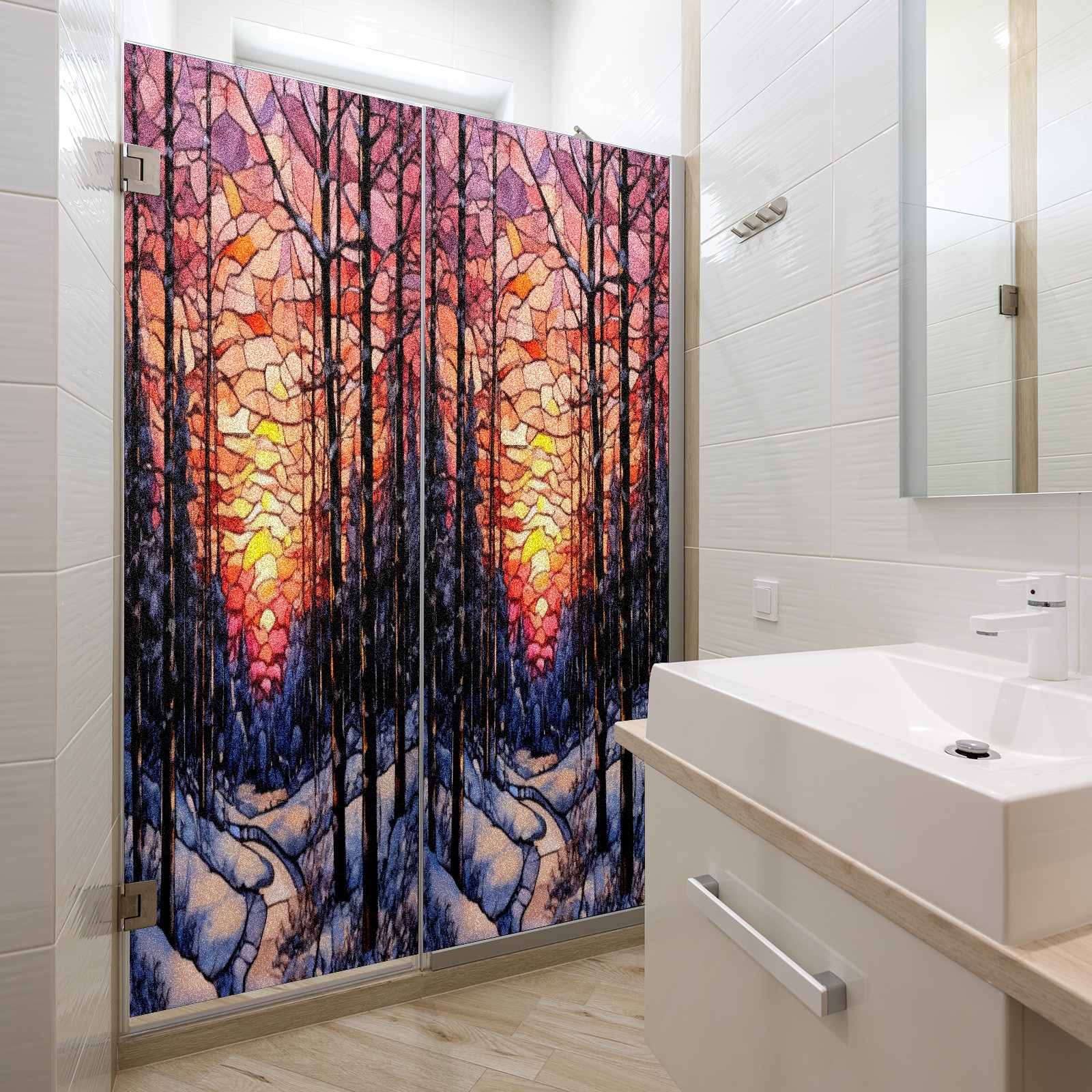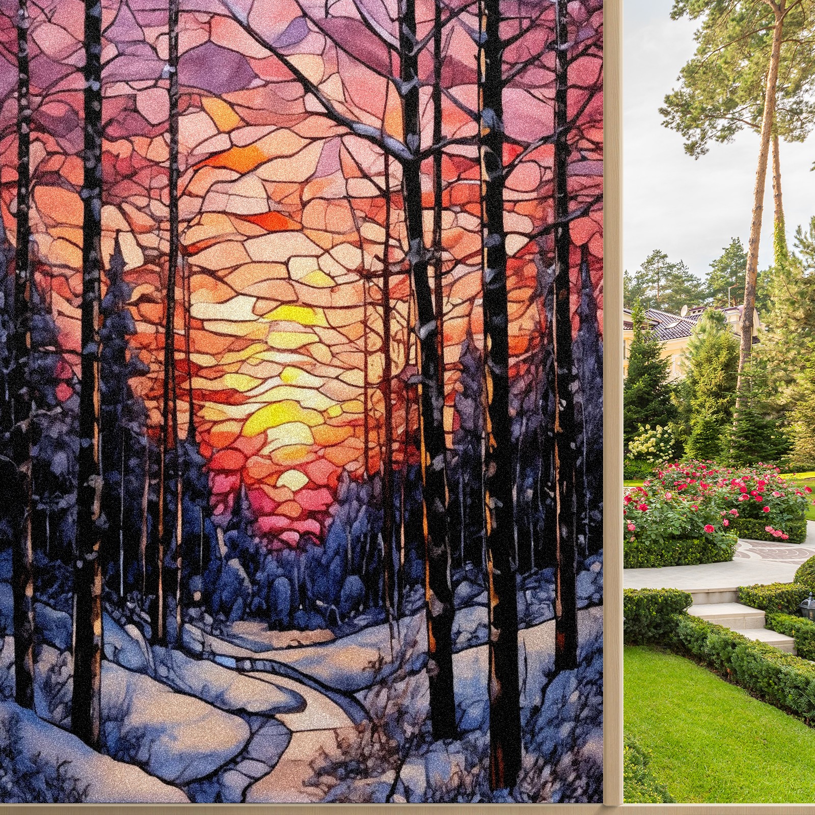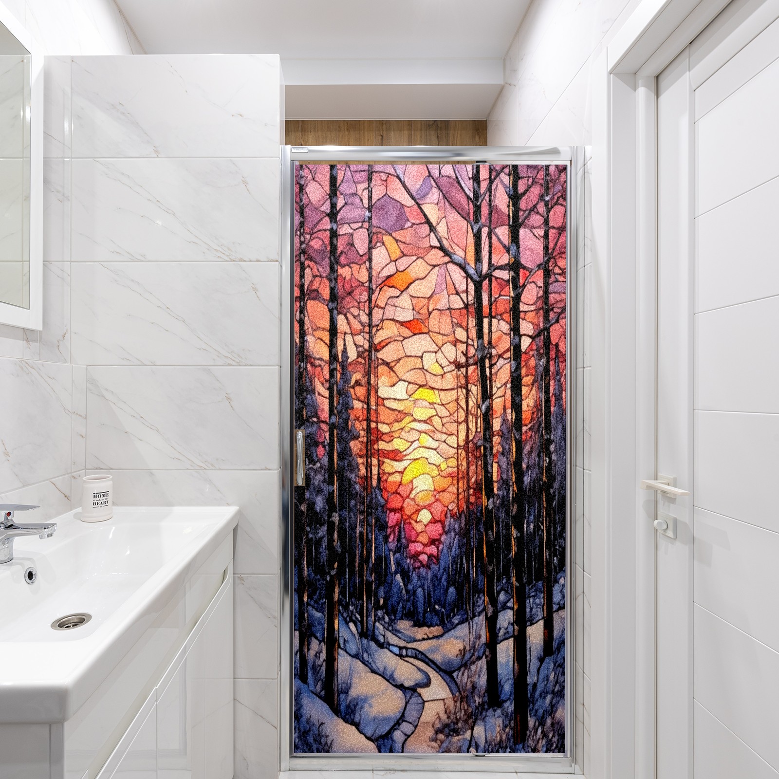 Window Privacy Film Frosted Stained Glass Film Decorative Static Cling for Bathroom Home Office Peel and Stick Window Film Sunset Snow Forest(17.7x23.6in)