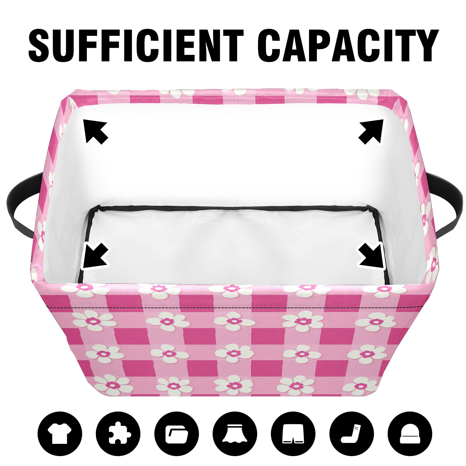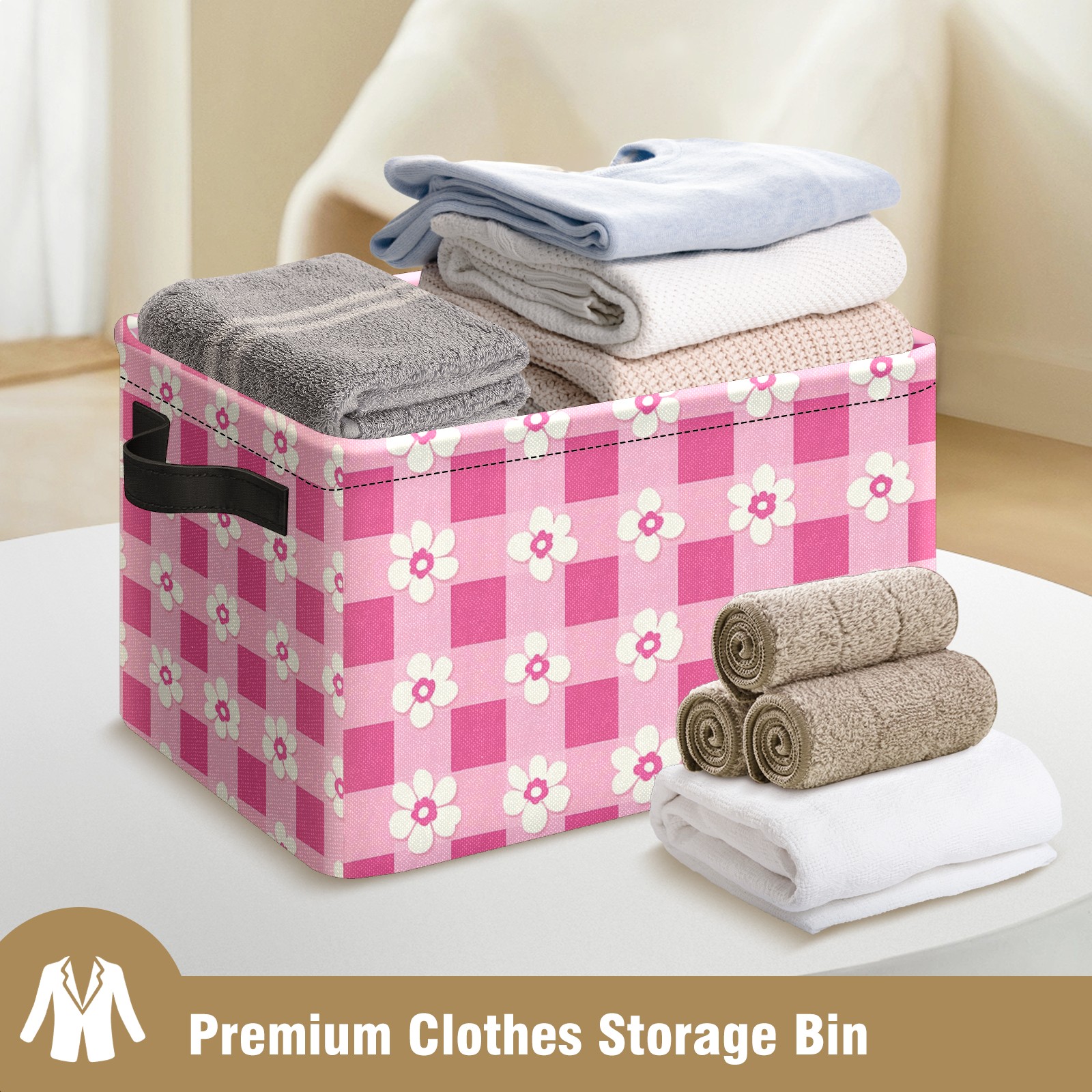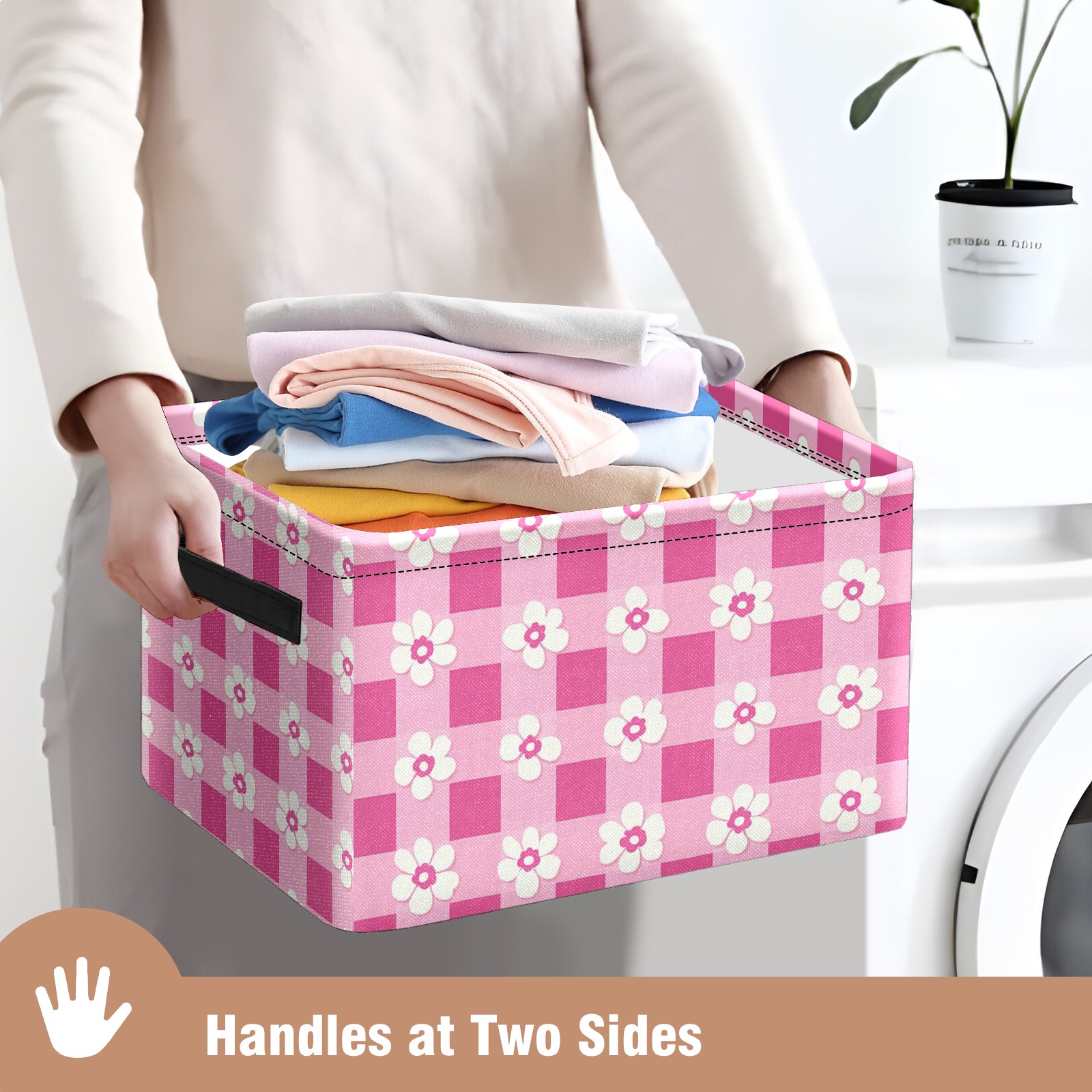 Foldable and Stackable Fabric Storage Basket for Home Organization with Handles, Decorative Closet Bins for Shelves and Laundry Storage( Pink Gingham With Flowers)