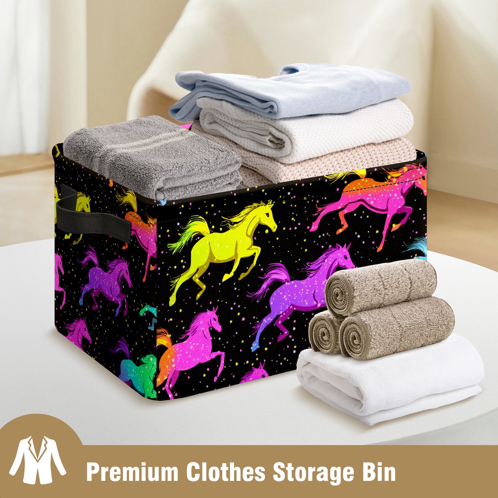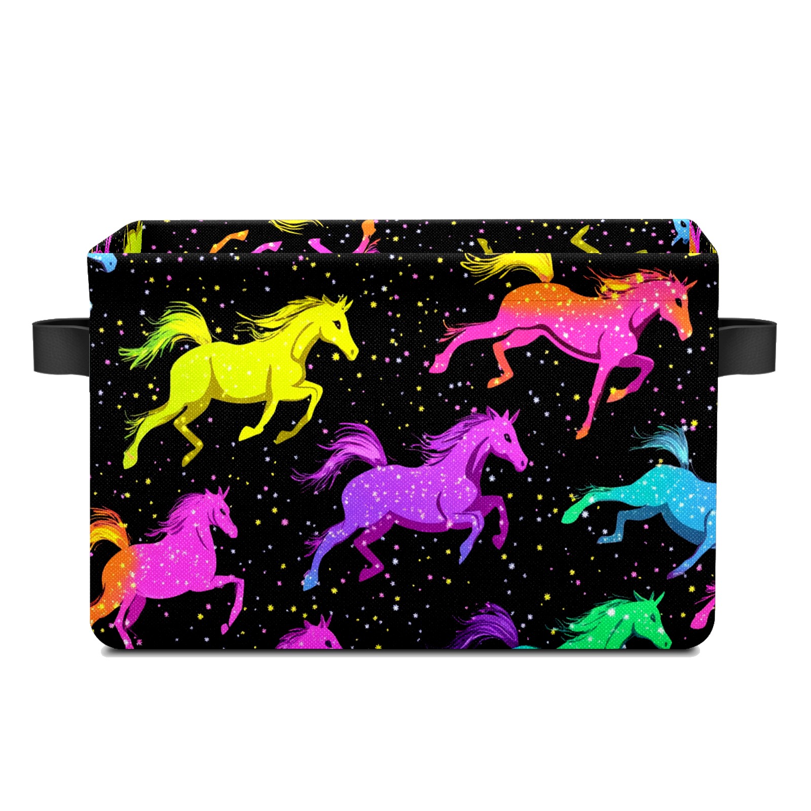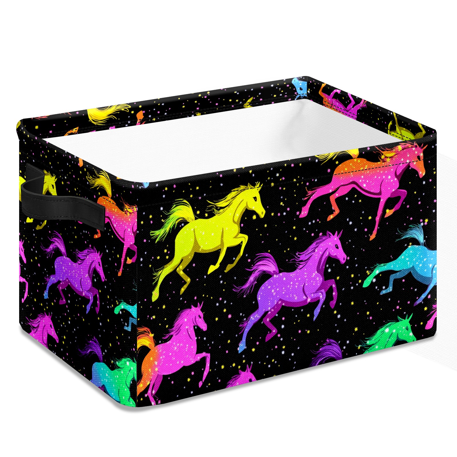 Foldable and Stackable Fabric Storage Basket for Home Organization with Handles, Decorative Closet Bins for Shelves and Laundry Storage( Neon-colored Horses Running)