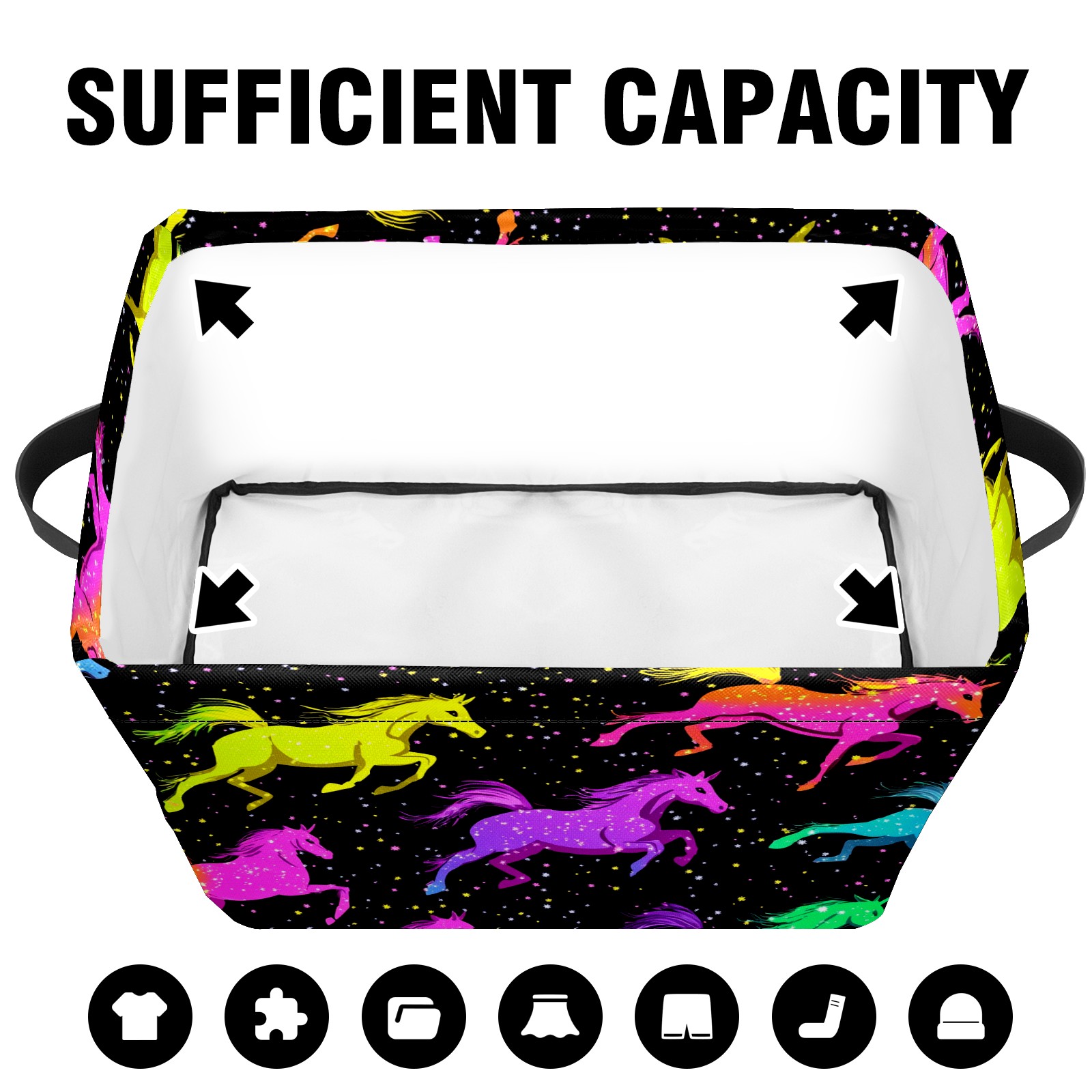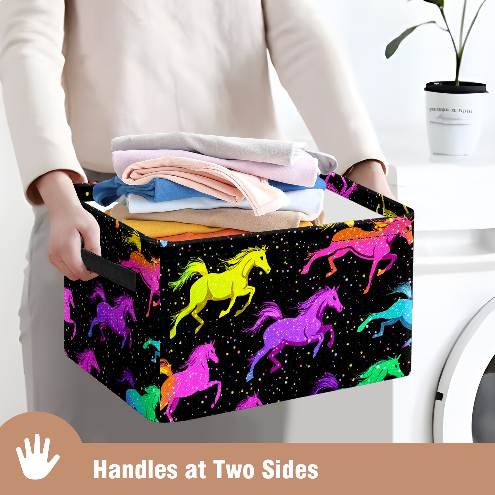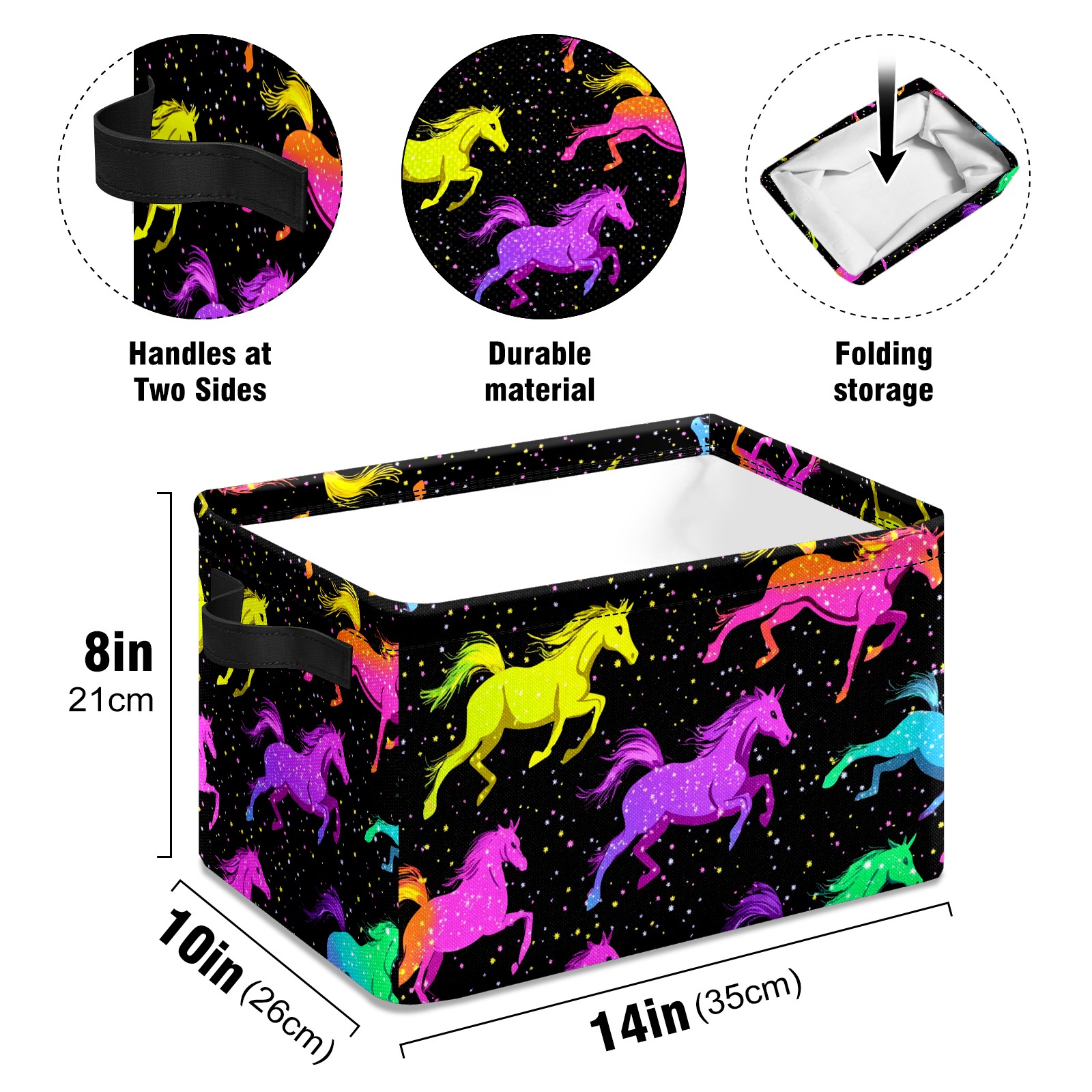 Foldable and Stackable Fabric Storage Basket for Home Organization with Handles, Decorative Closet Bins for Shelves and Laundry Storage( Neon-colored Horses Running)