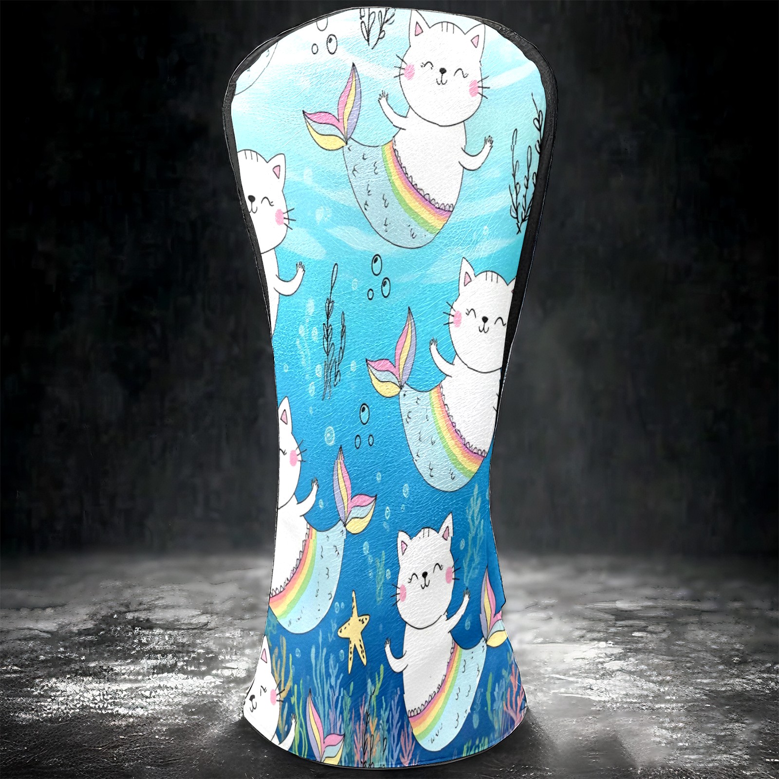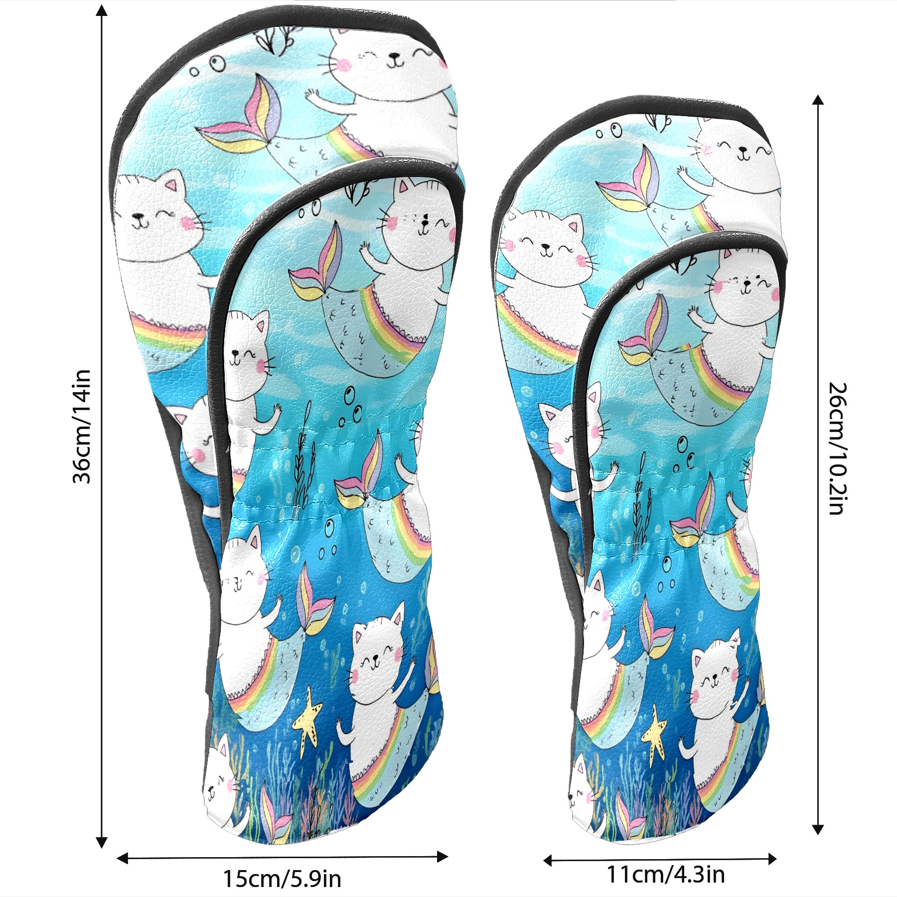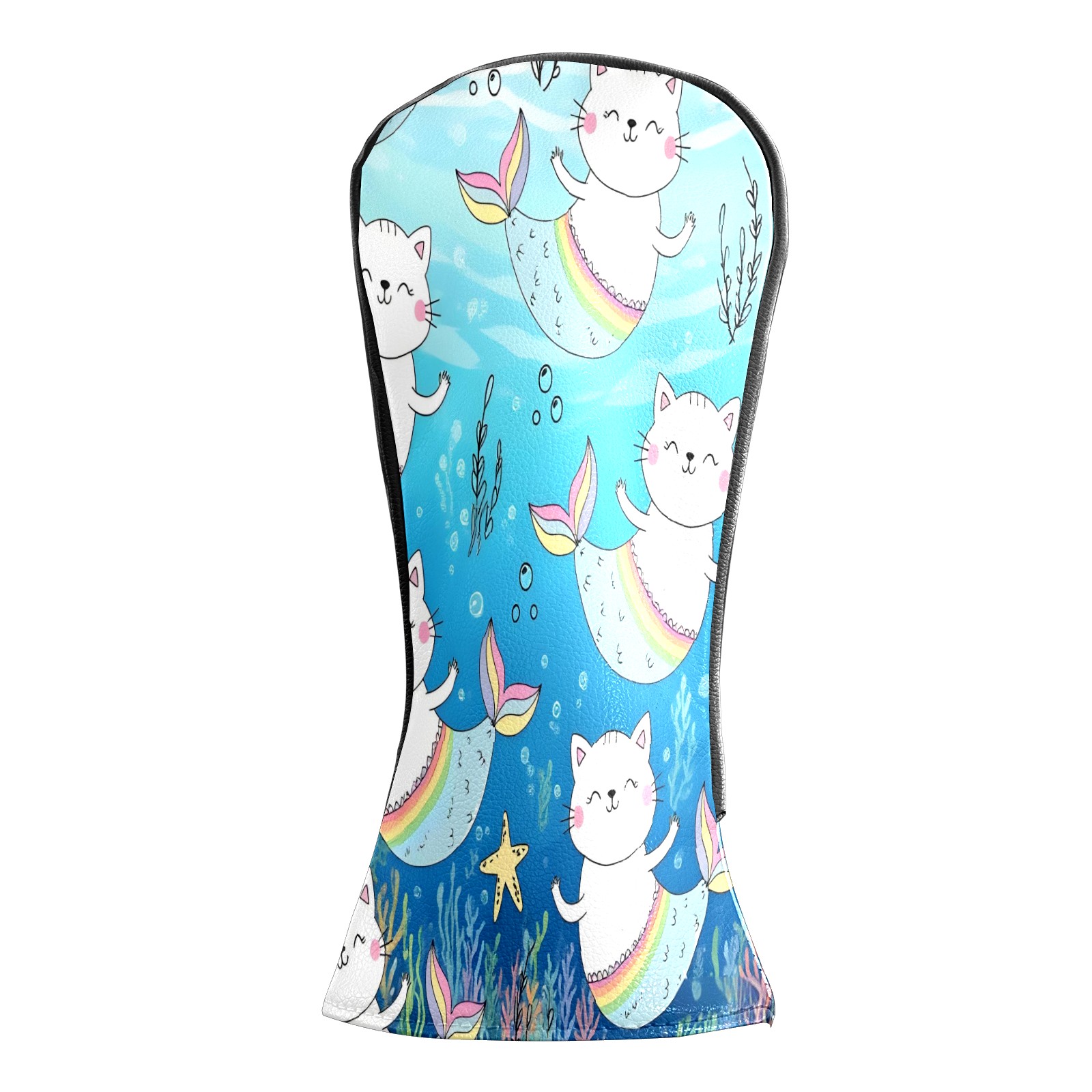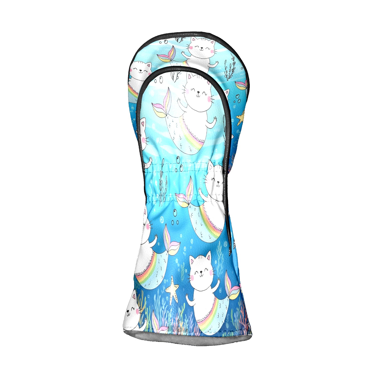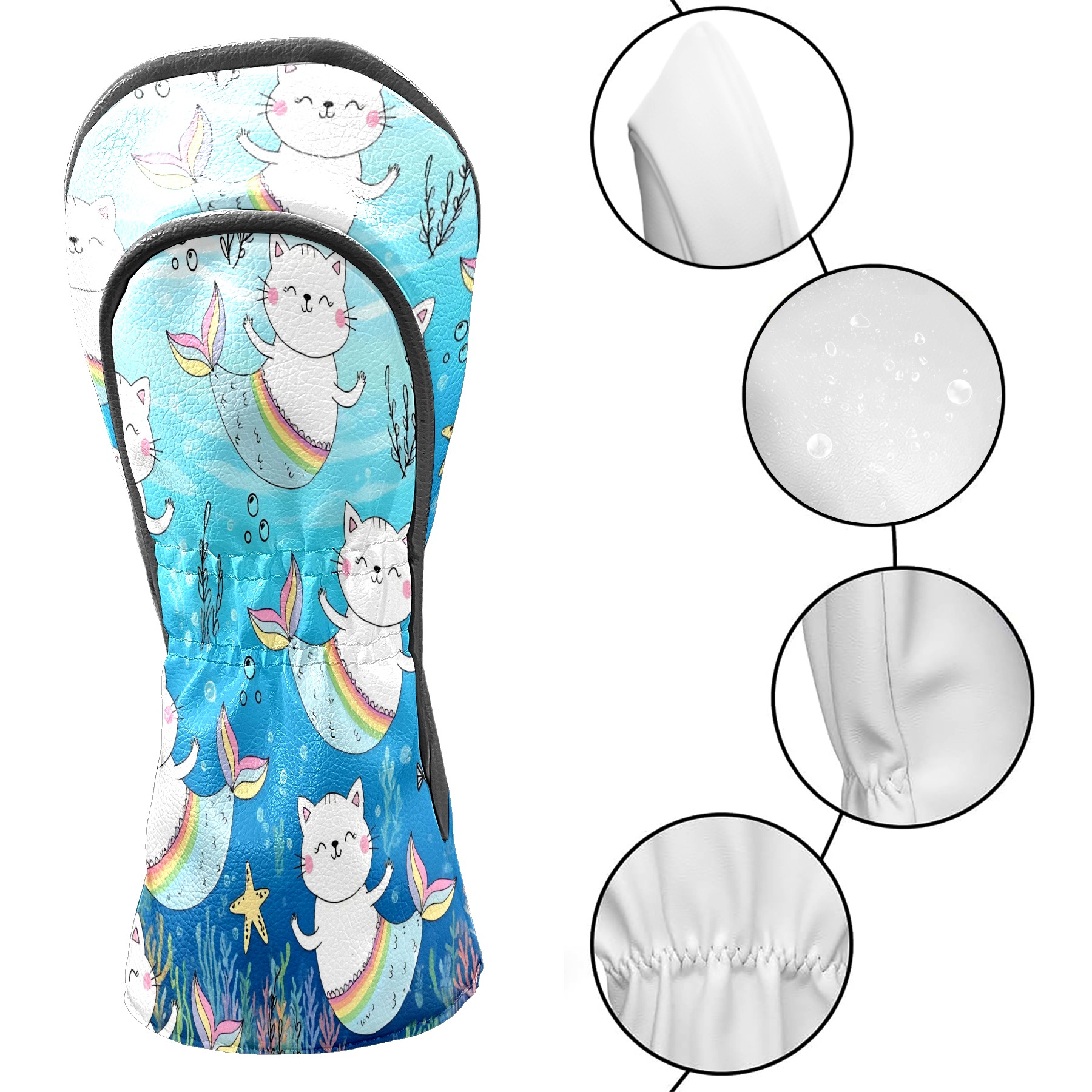 Mermaid Cat Blue Golf Club Head Covers - Mermaid Cat Blue Design, Premium PU Leather Driver Hybrid Headcovers with Velvet Lining, Waterproof Golf Gifts for Men Women