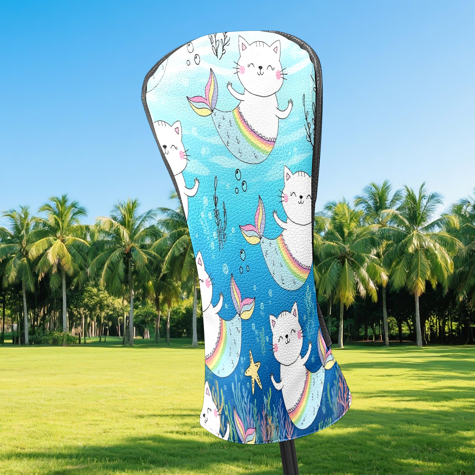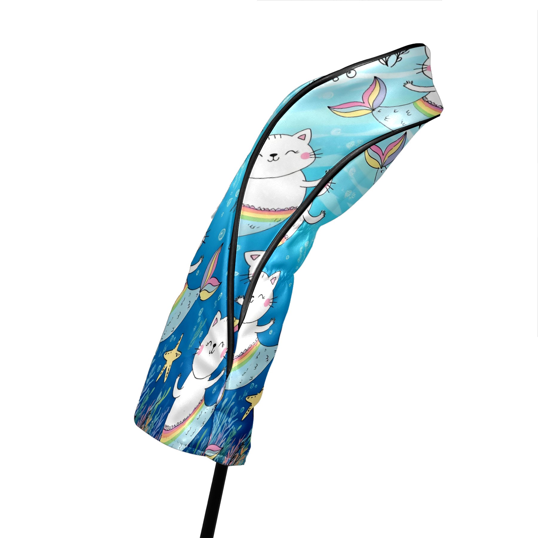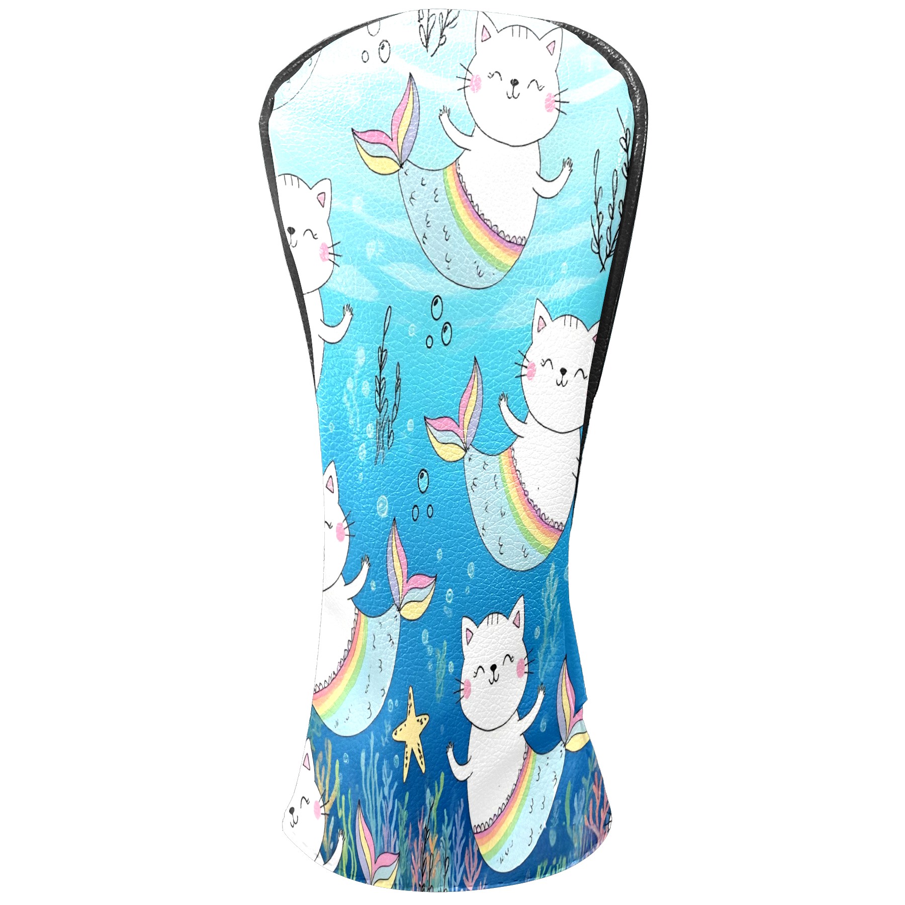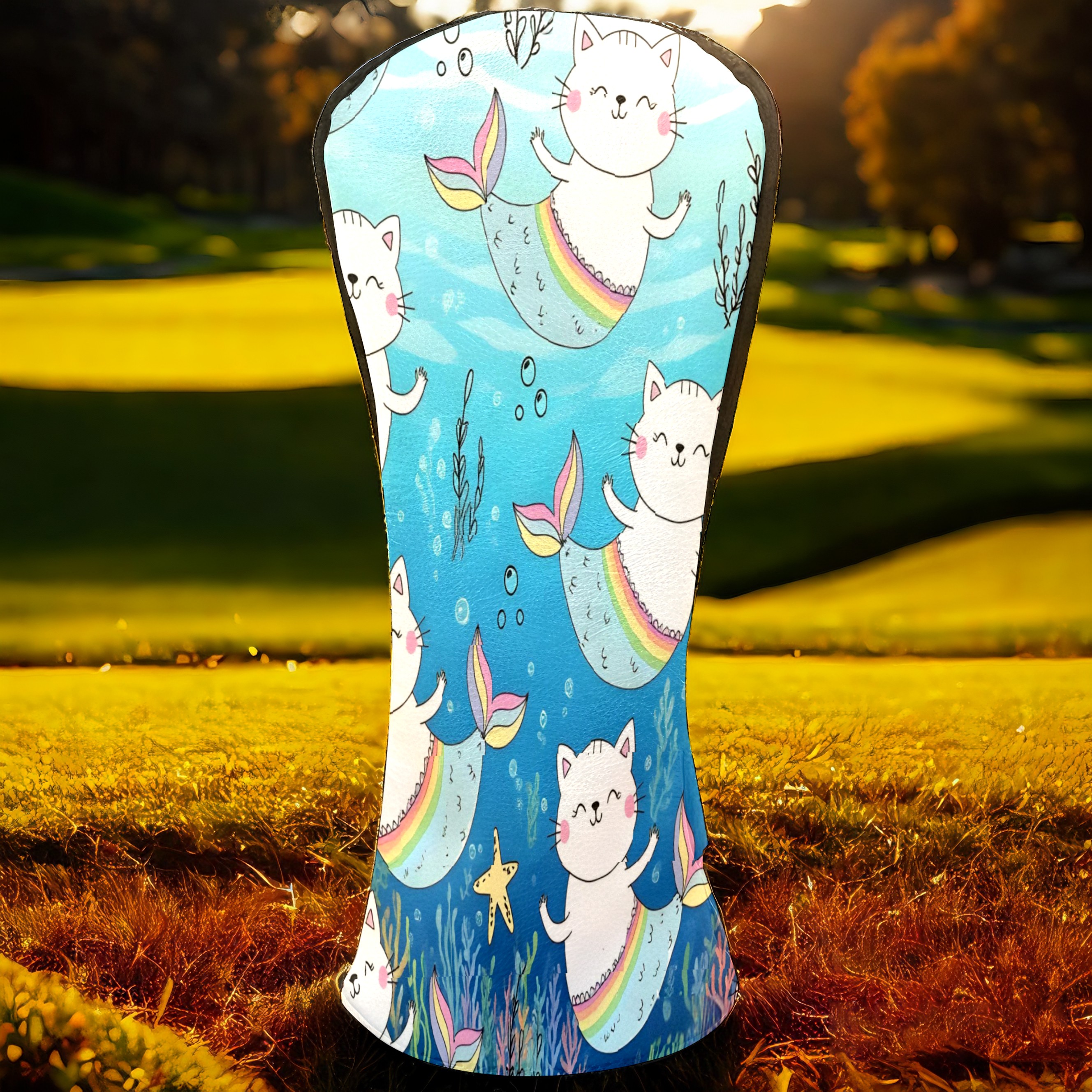 Mermaid Cat Blue Golf Club Head Covers - Mermaid Cat Blue Design, Premium PU Leather Driver Hybrid Headcovers with Velvet Lining, Waterproof Golf Gifts for Men Women