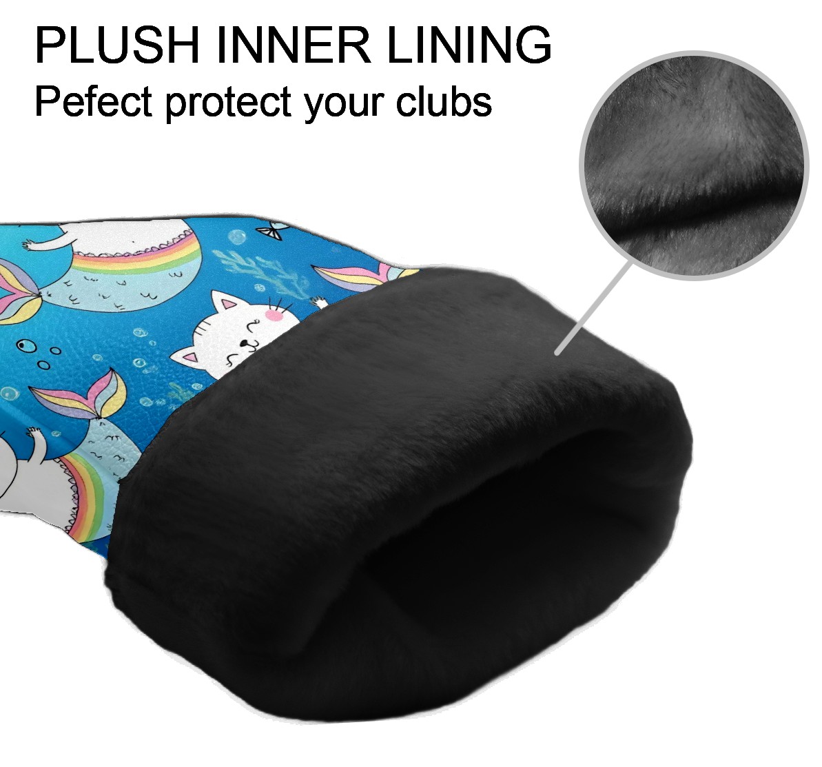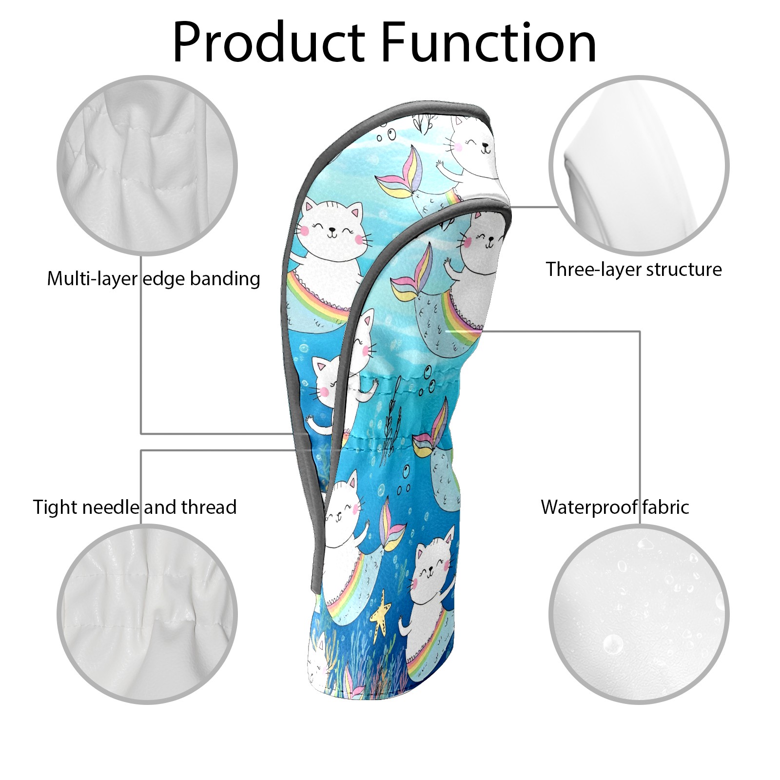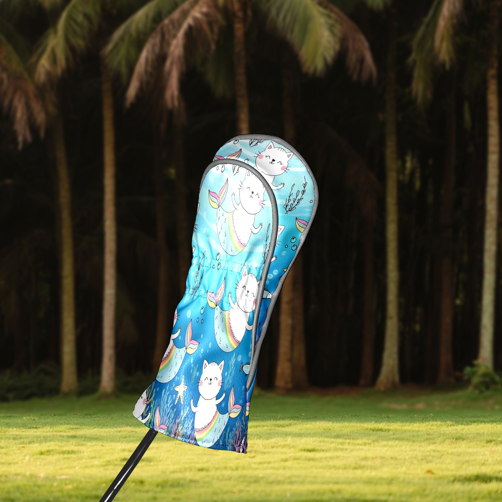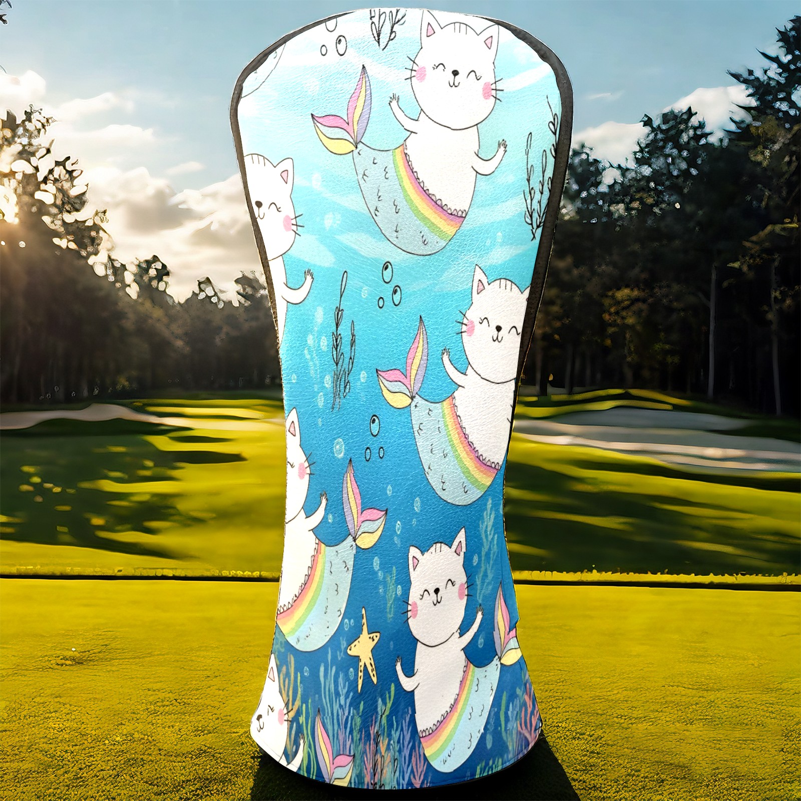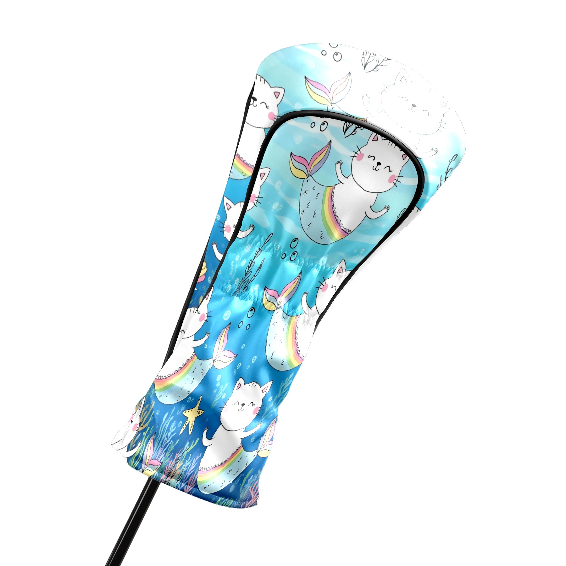 Mermaid Cat Blue Golf Club Head Covers - Mermaid Cat Blue Design, Premium PU Leather Driver Hybrid Headcovers with Velvet Lining, Waterproof Golf Gifts for Men Women