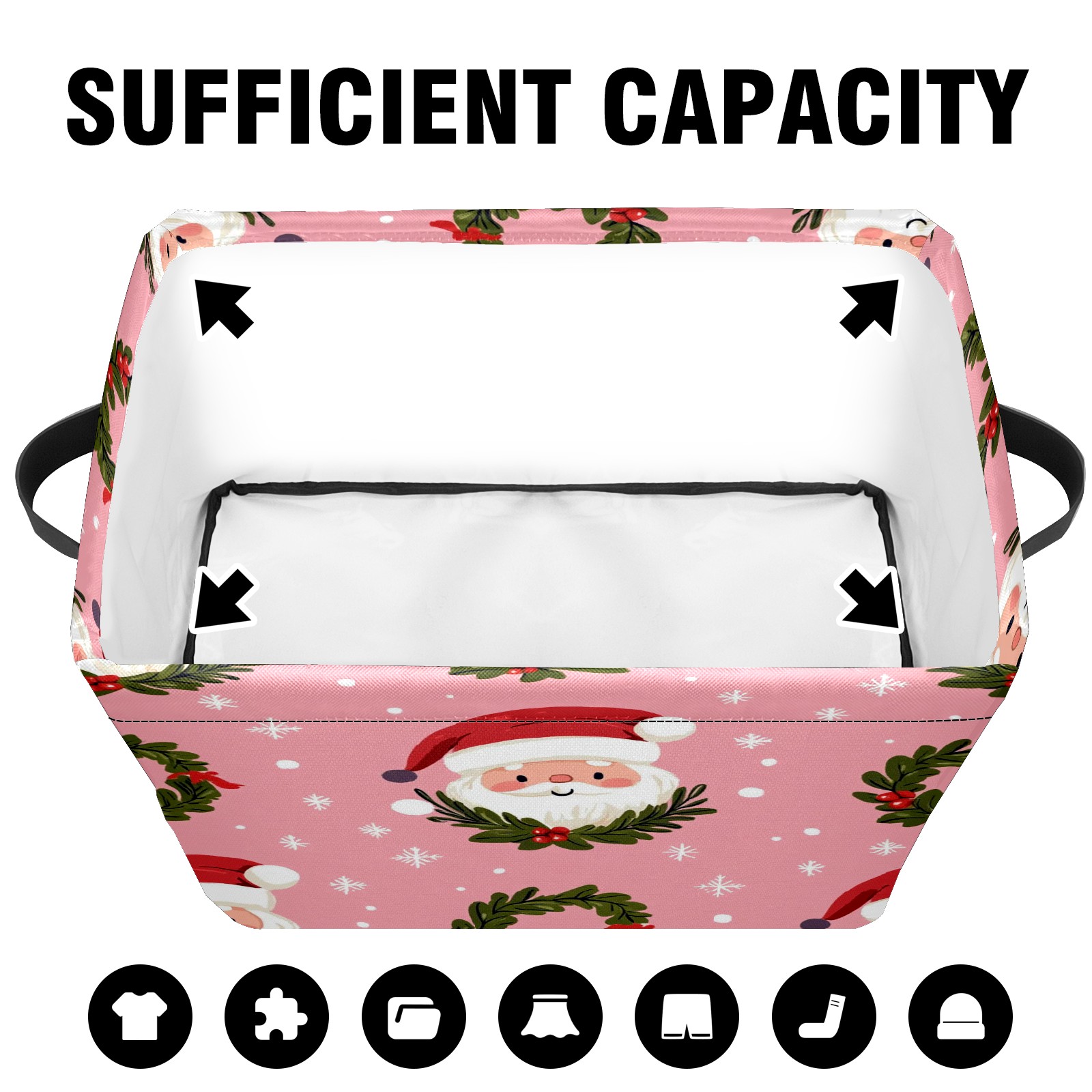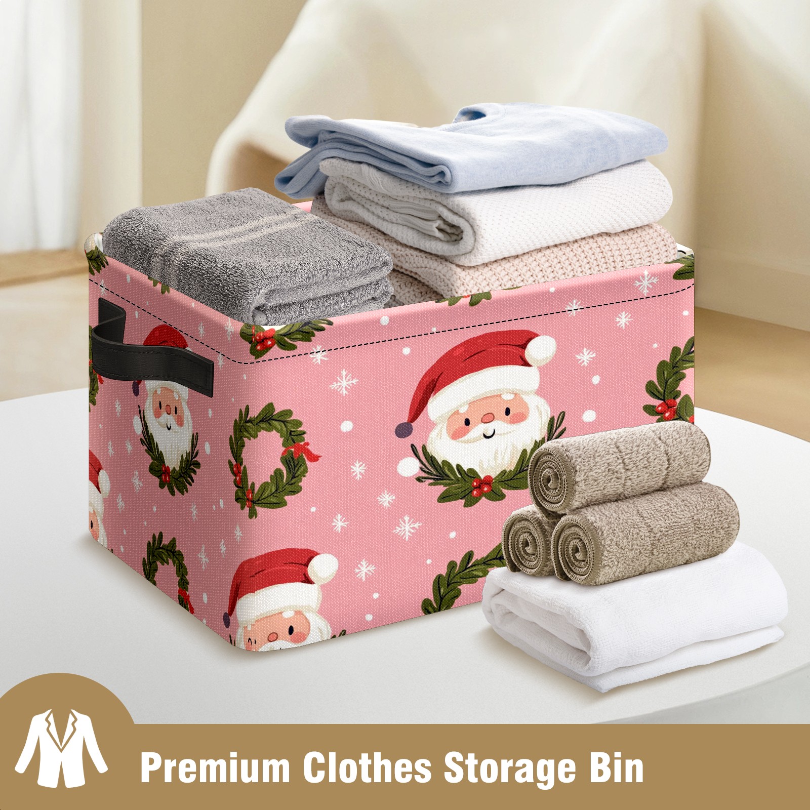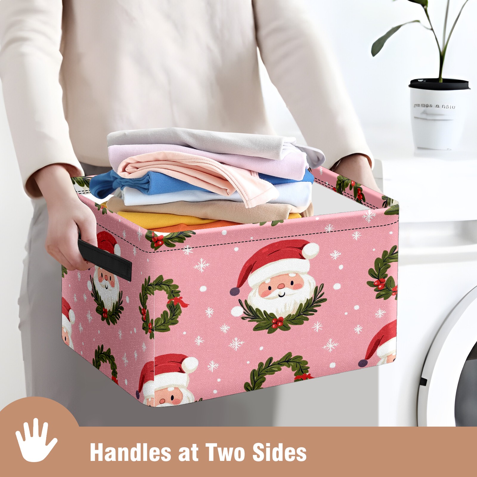 Foldable and Stackable Fabric Storage Basket for Home Organization with Handles, Decorative Closet Bins for Shelves and Laundry Storage( Cute Santa And Wreath)