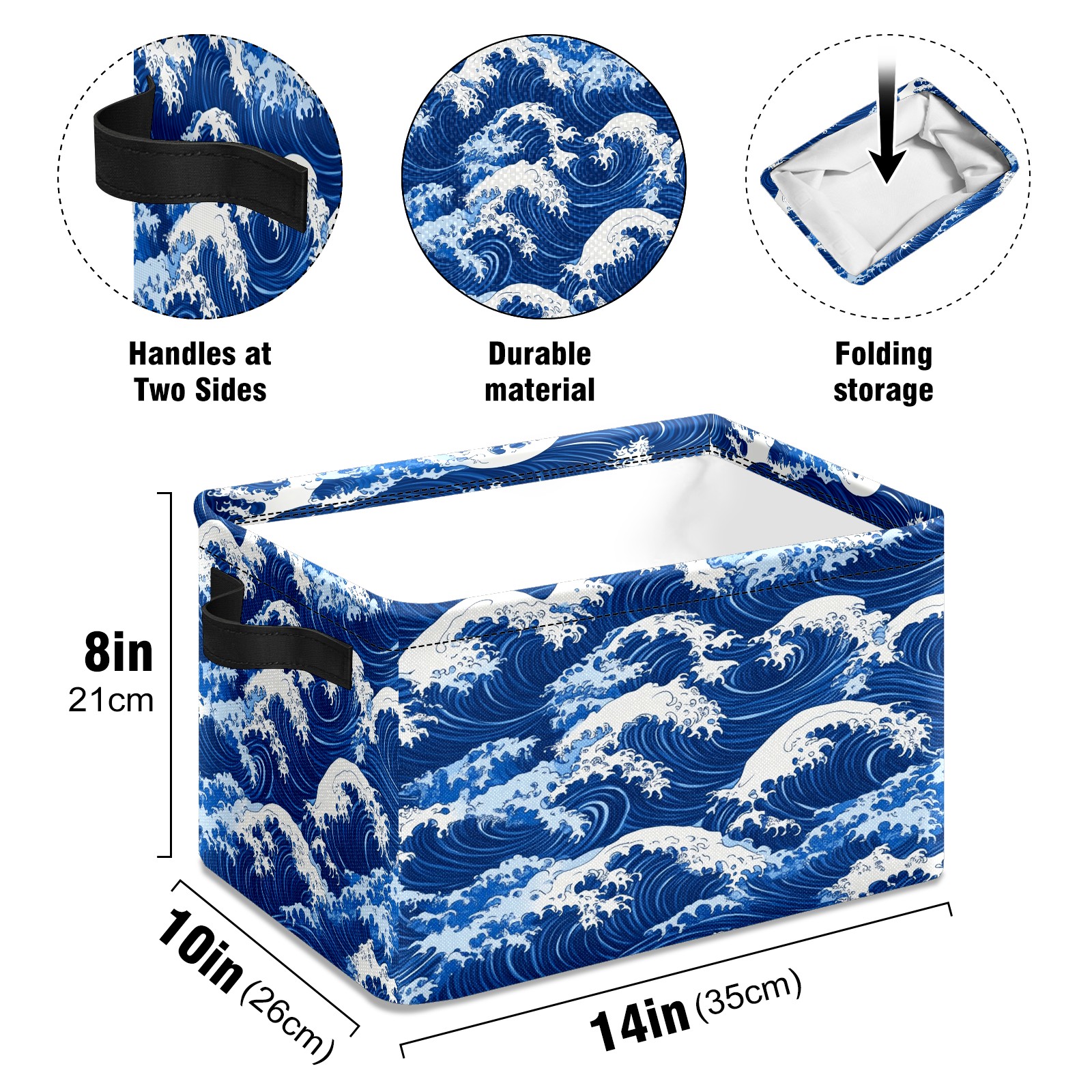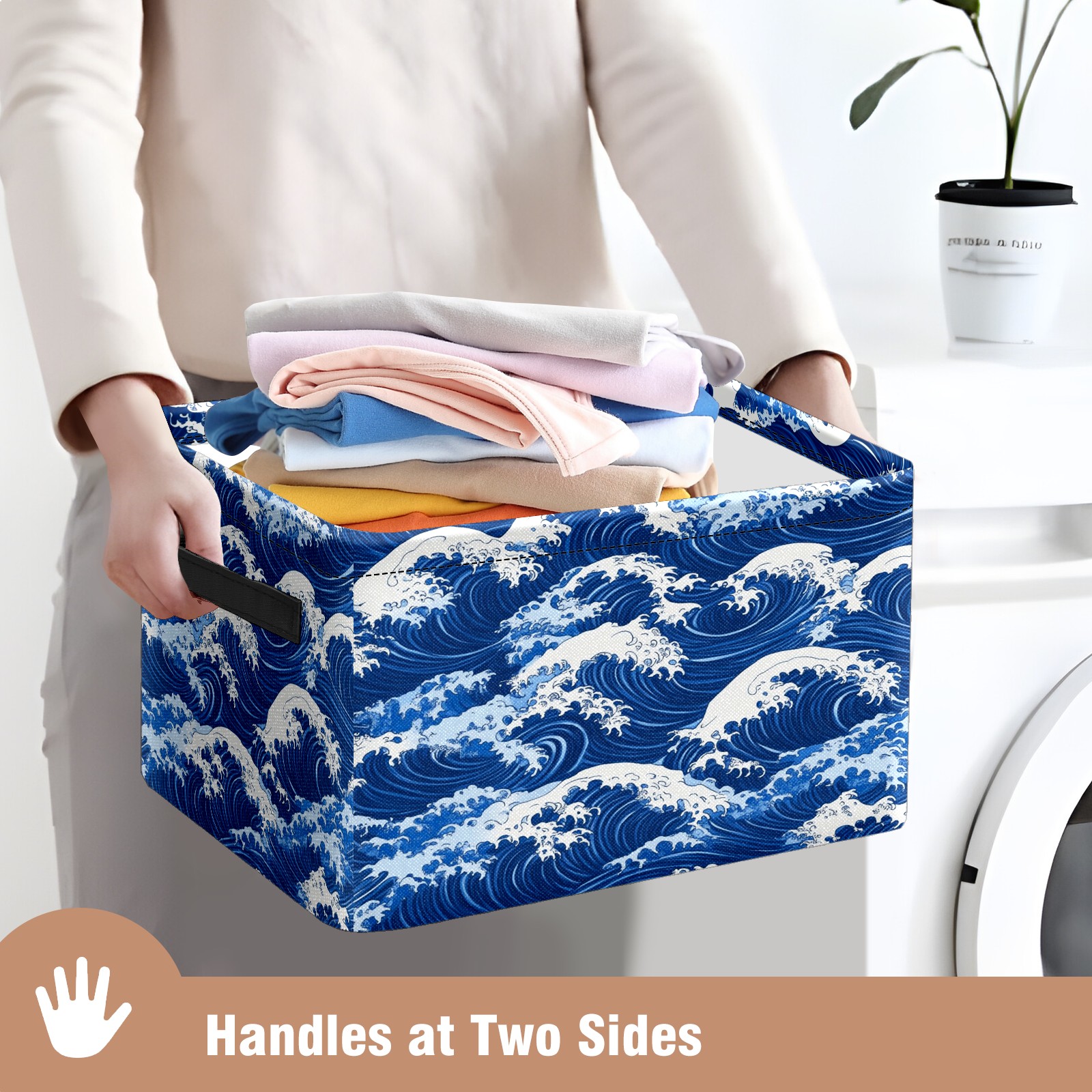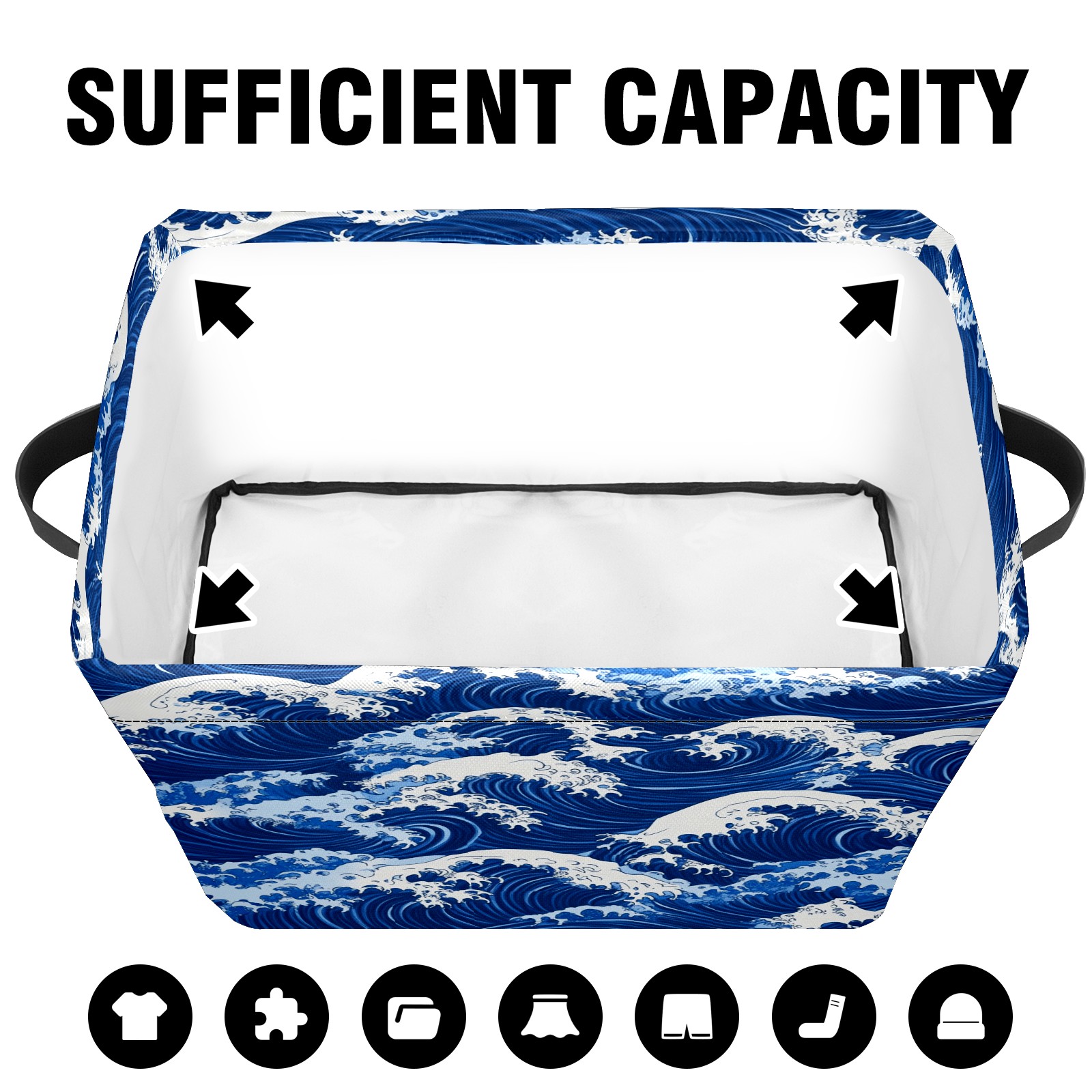 Foldable and Stackable Fabric Storage Basket for Home Organization with Handles, Decorative Closet Bins for Shelves and Laundry Storage( Blue And White Ocean Wave)