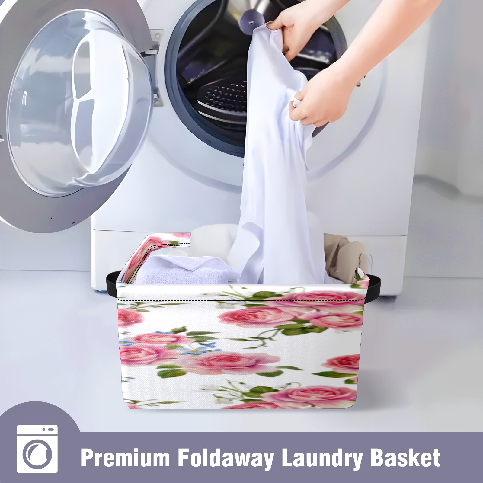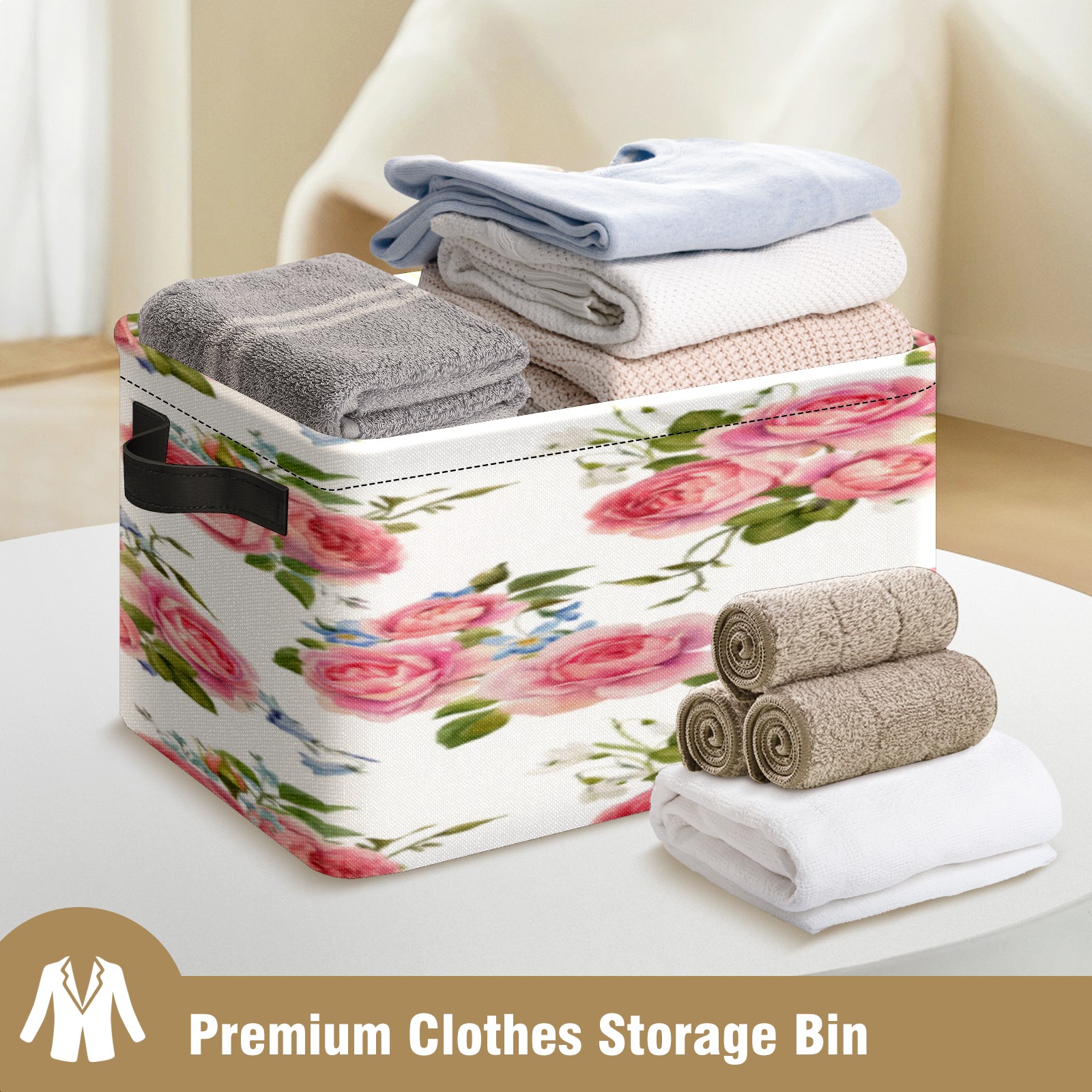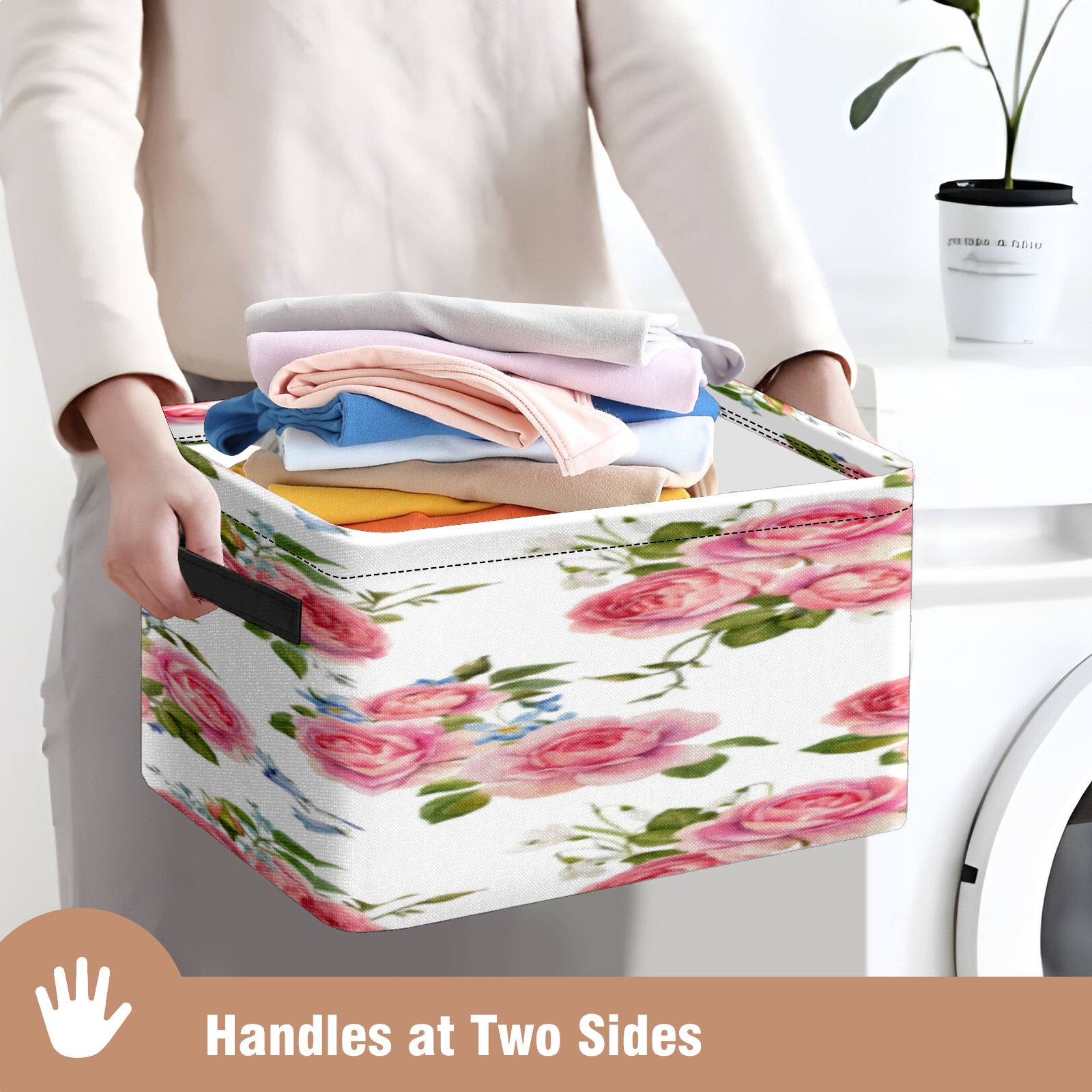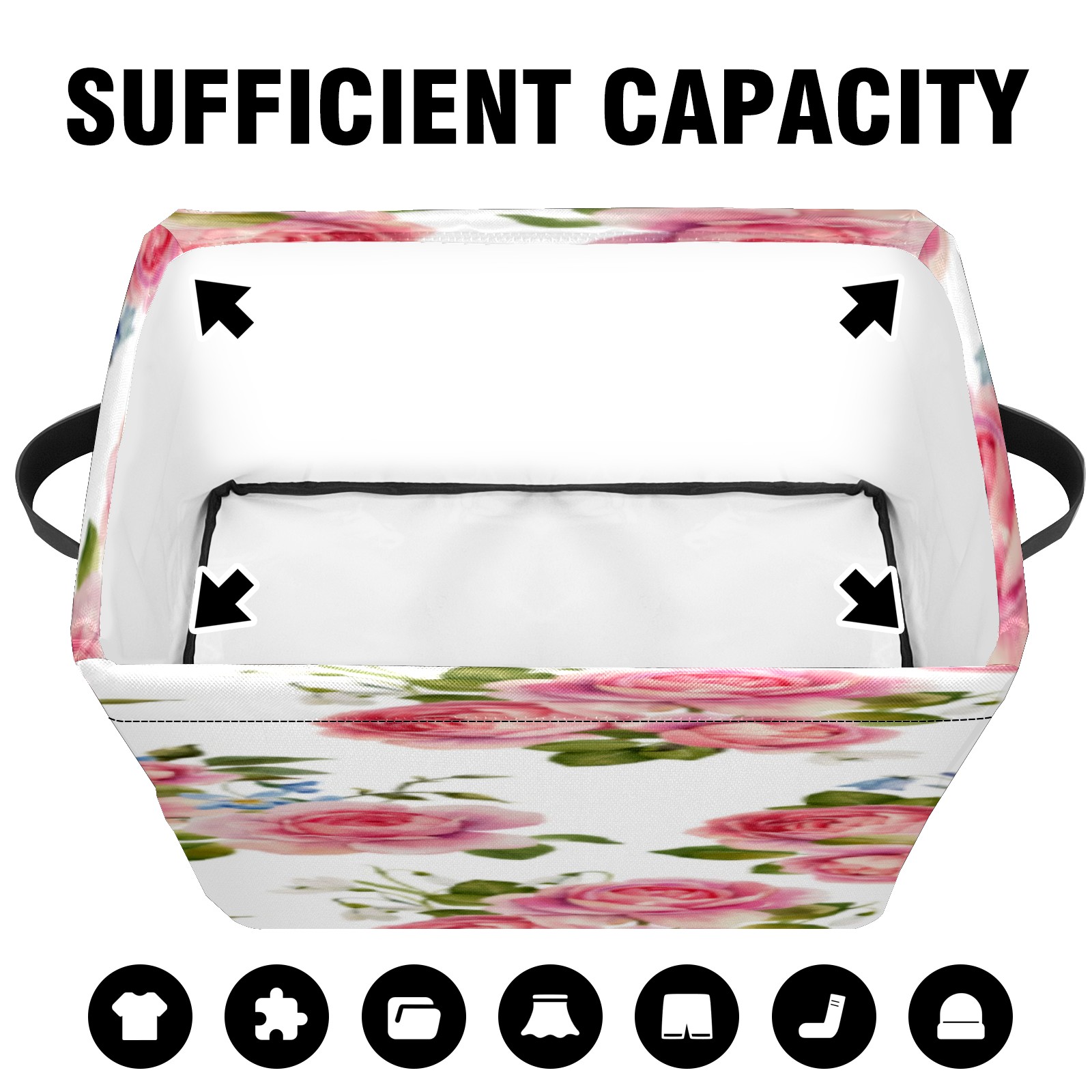 1 Pack Woven Storage Baskets - Natural Seagrass Organizer Bins with Handles, Decorative Foldable Storage Pink Rose Floral
