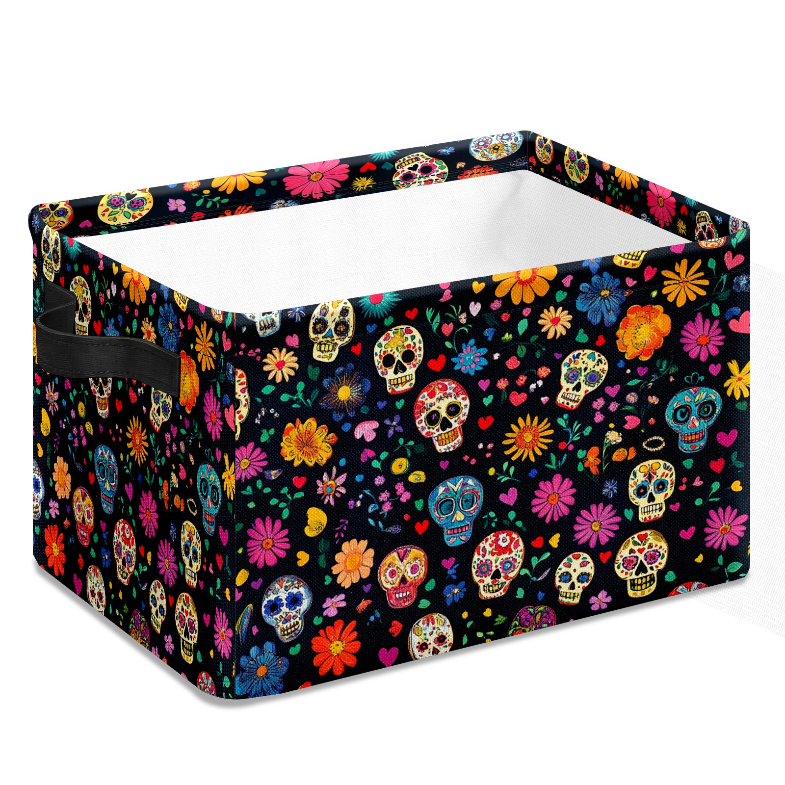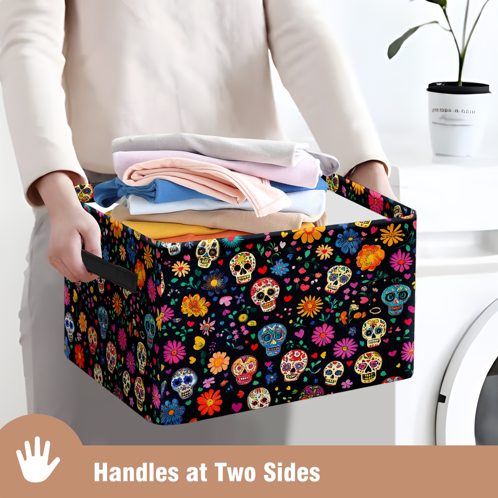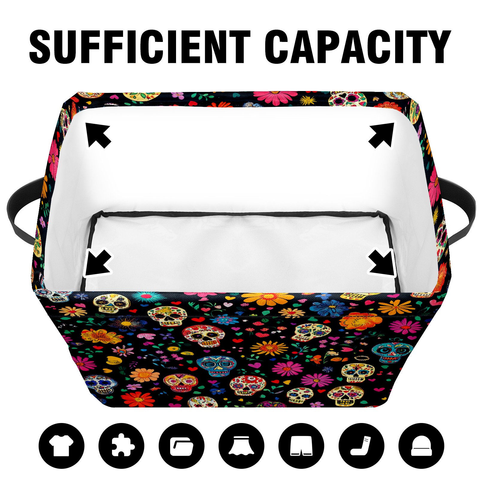 Foldable and Stackable Fabric Storage Basket for Home Organization with Handles, Decorative Closet Bins for Shelves and Laundry Storage( Colorful Sugar Skulls And Flowers)