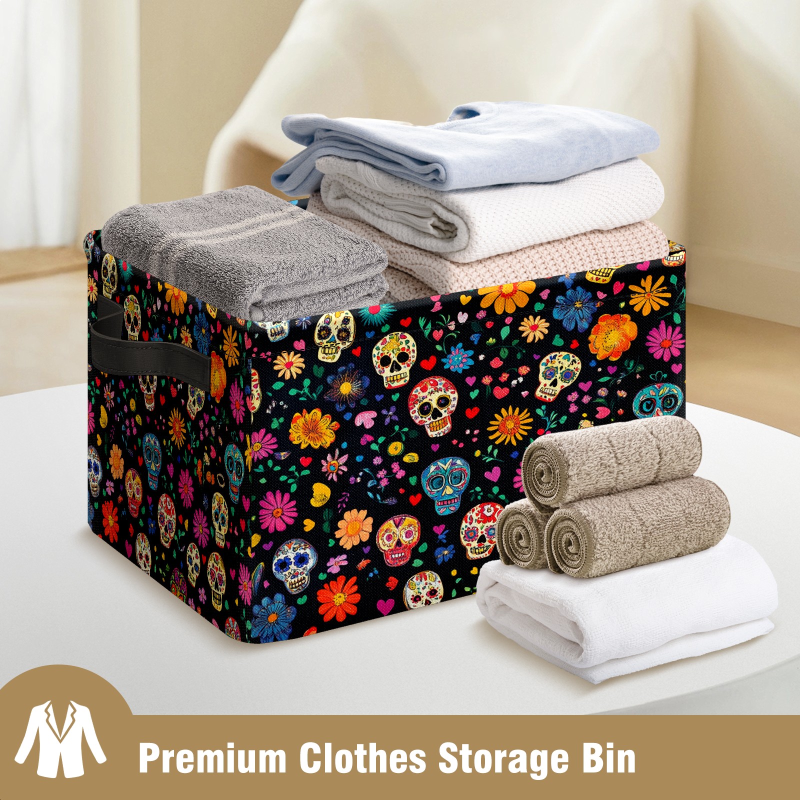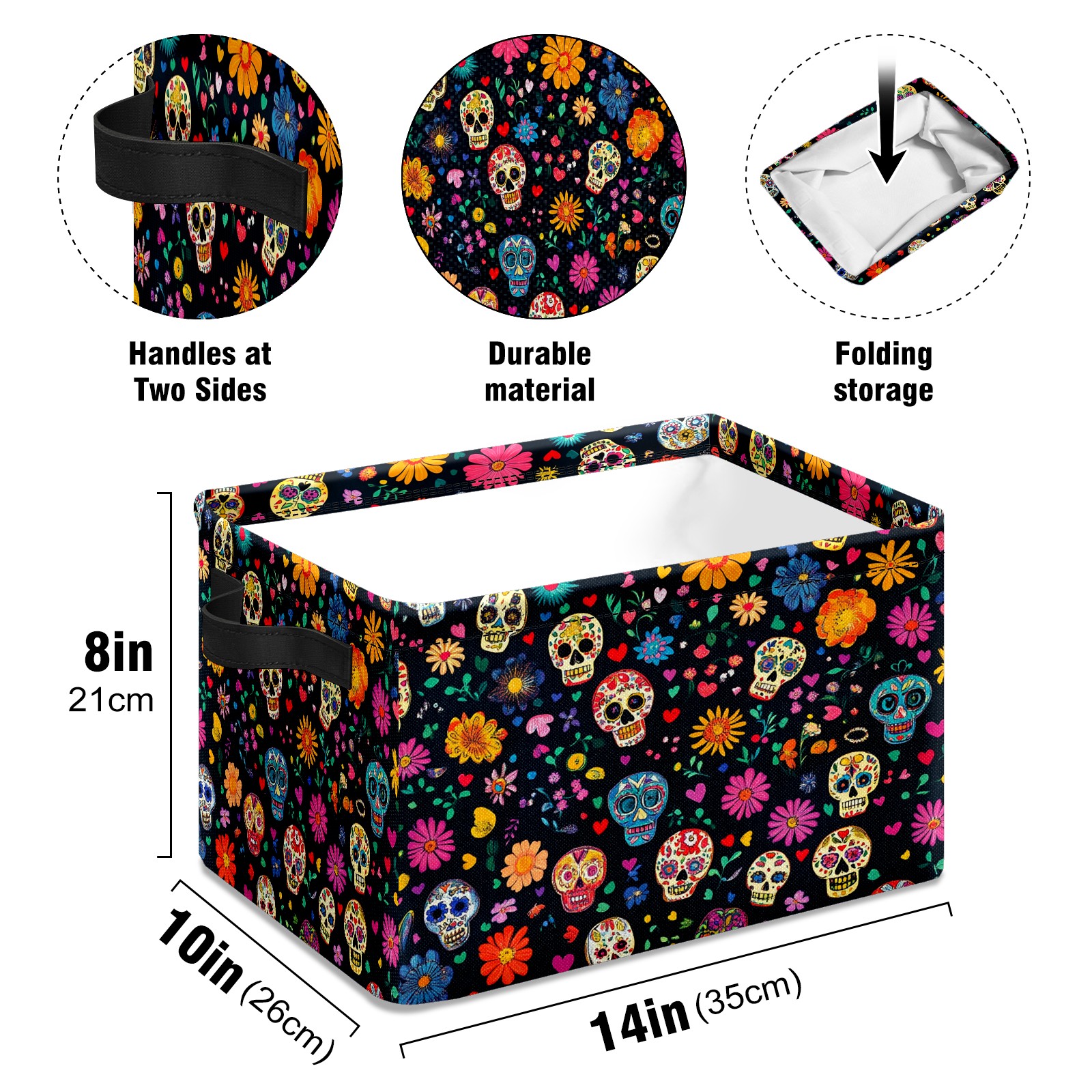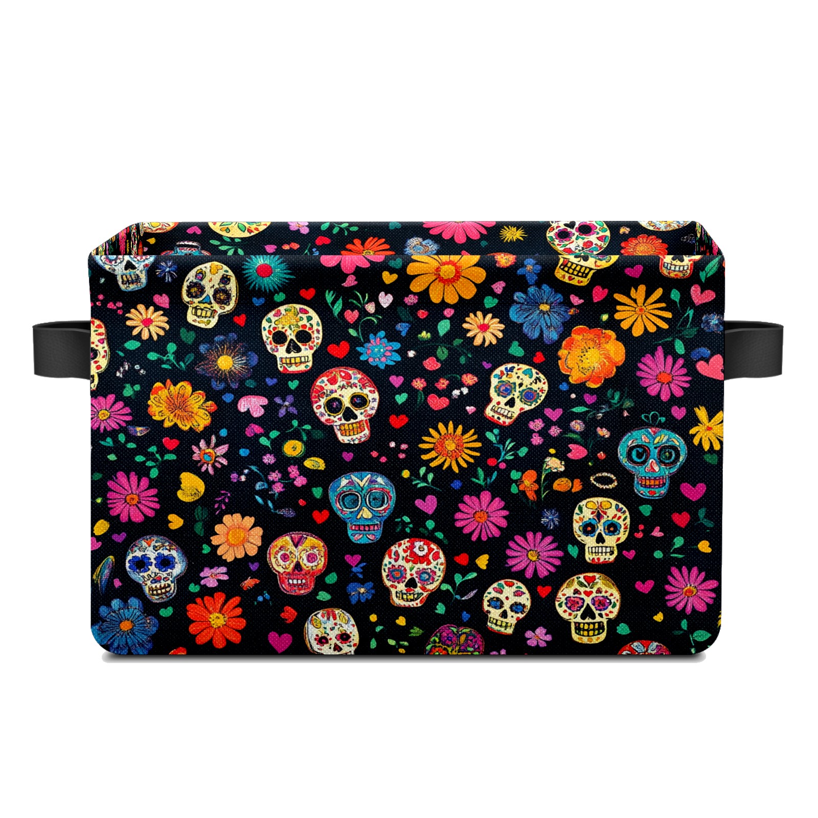 Foldable and Stackable Fabric Storage Basket for Home Organization with Handles, Decorative Closet Bins for Shelves and Laundry Storage( Colorful Sugar Skulls And Flowers)