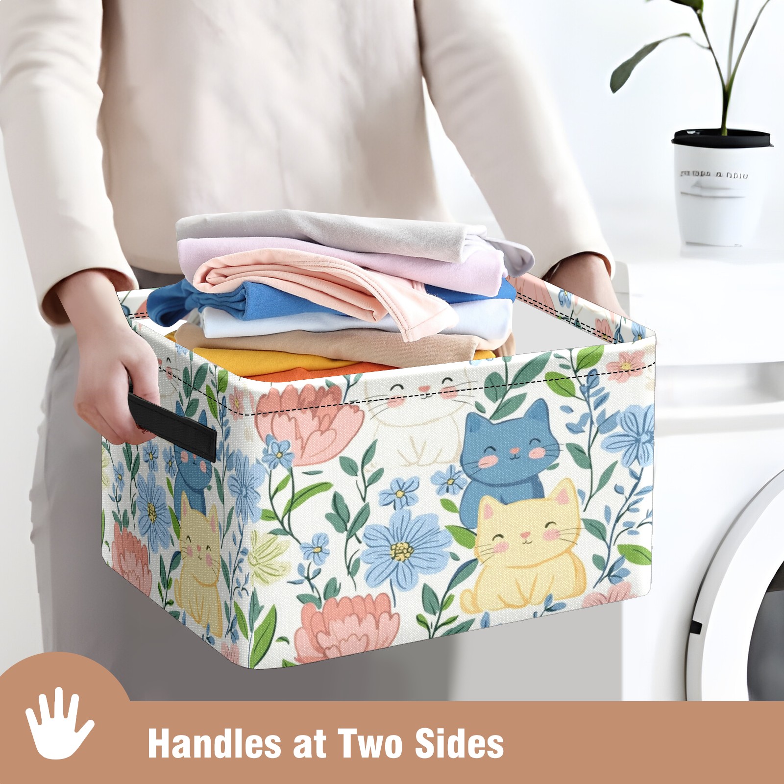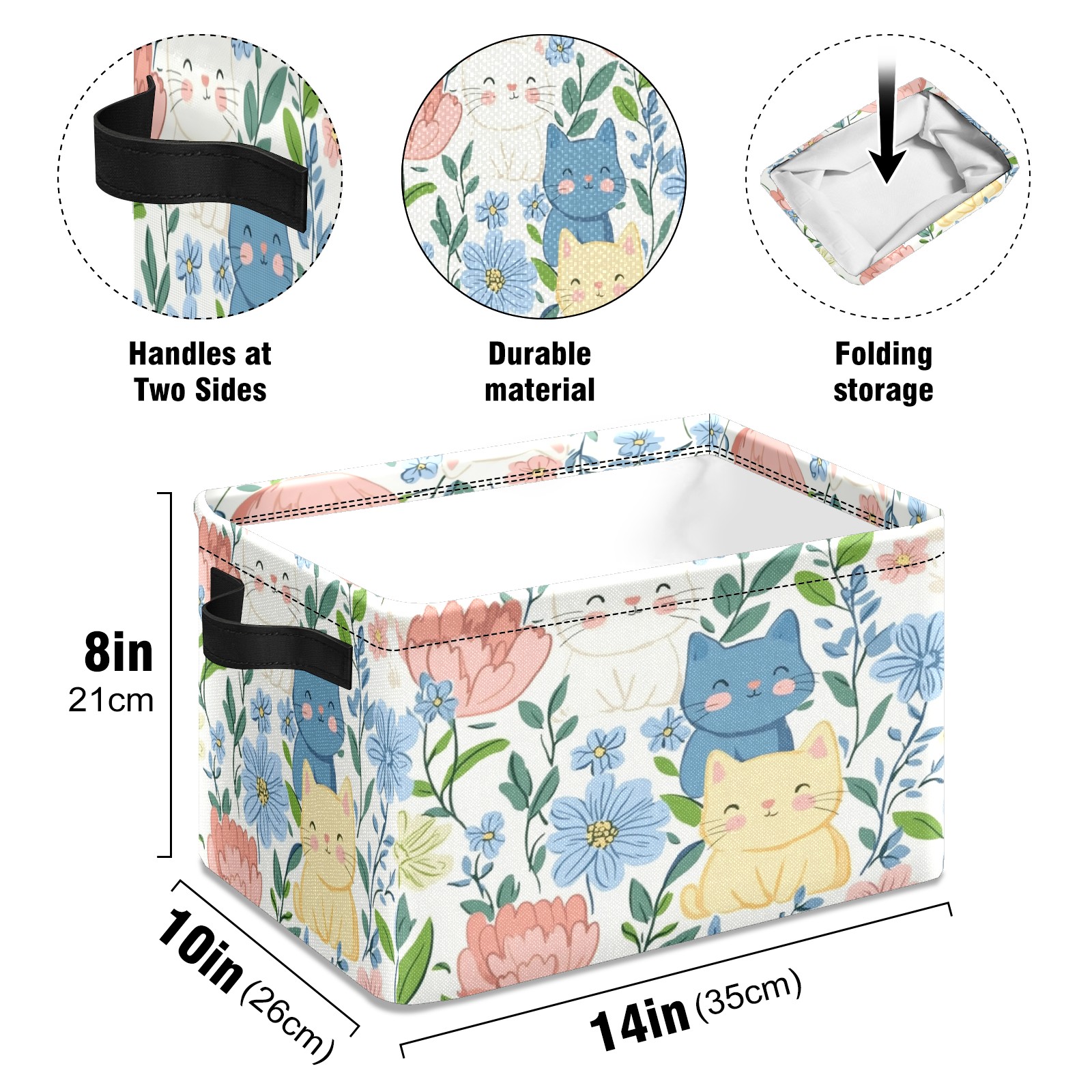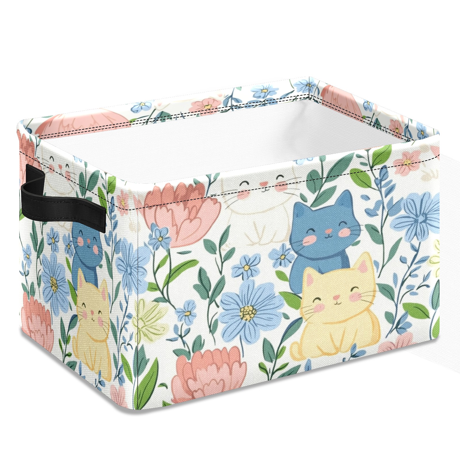 Foldable and Stackable Fabric Storage Basket for Home Organization with Handles, Decorative Closet Bins for Shelves and Laundry Storage( Cats In Flowers)