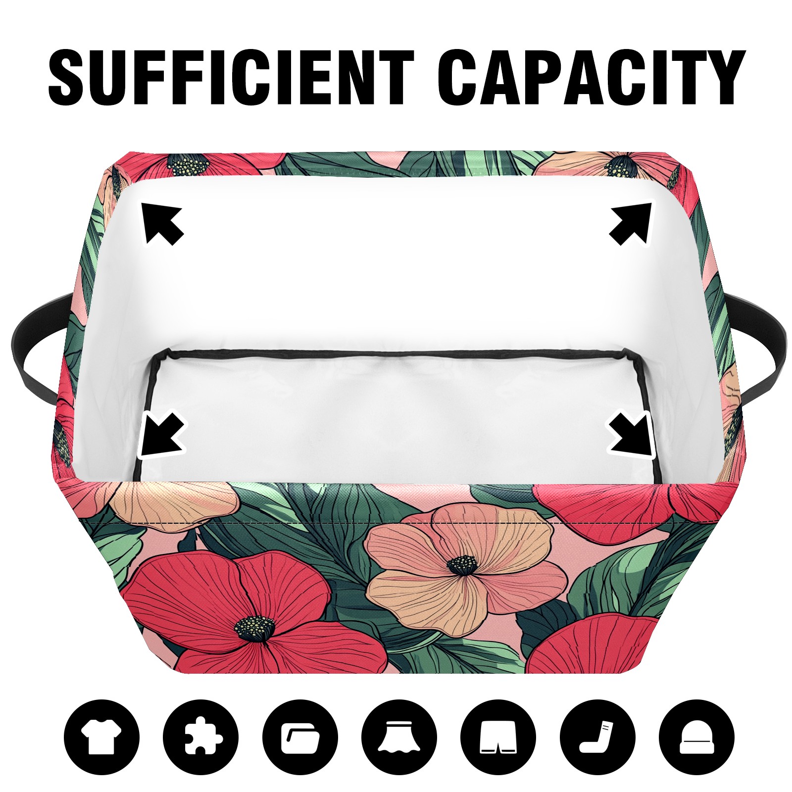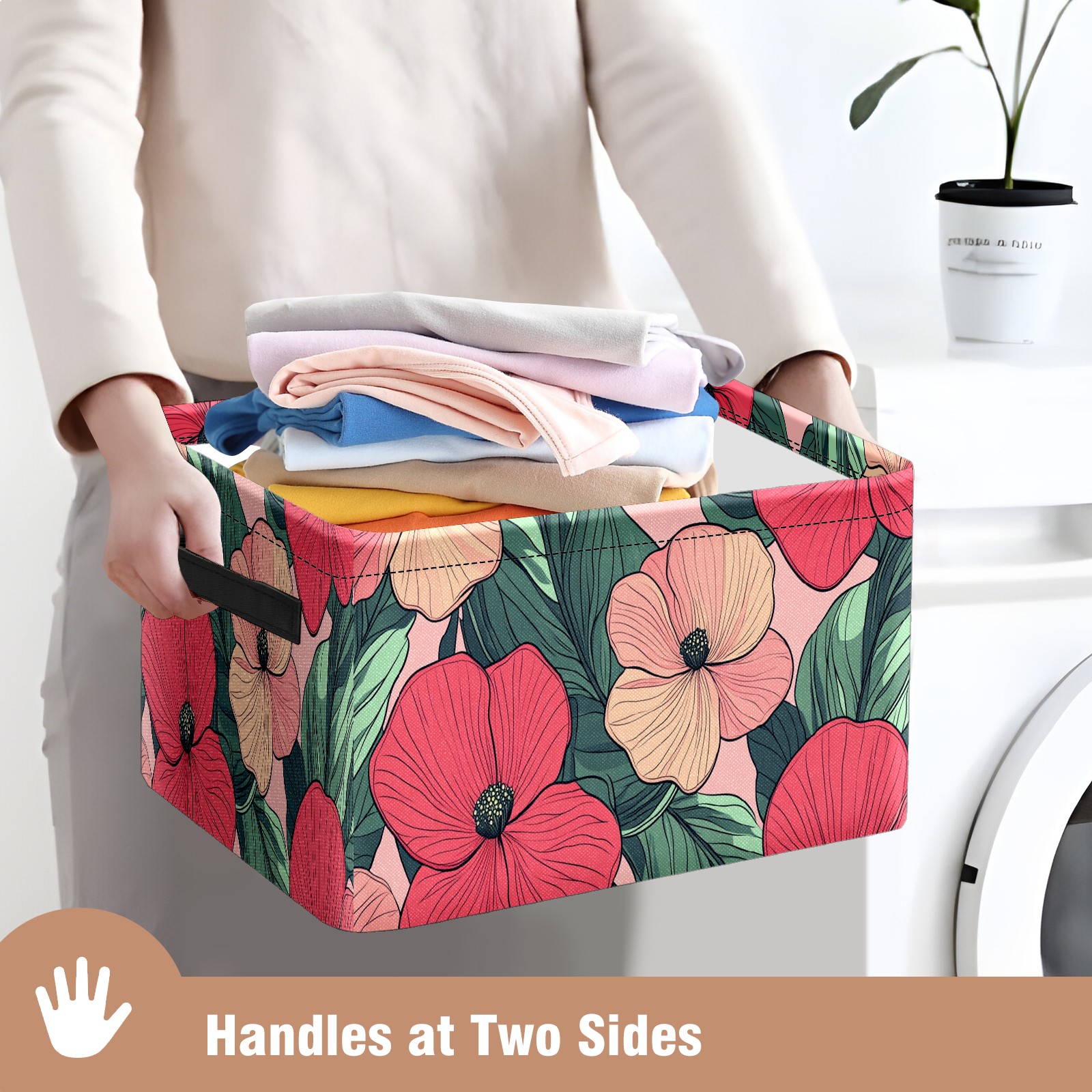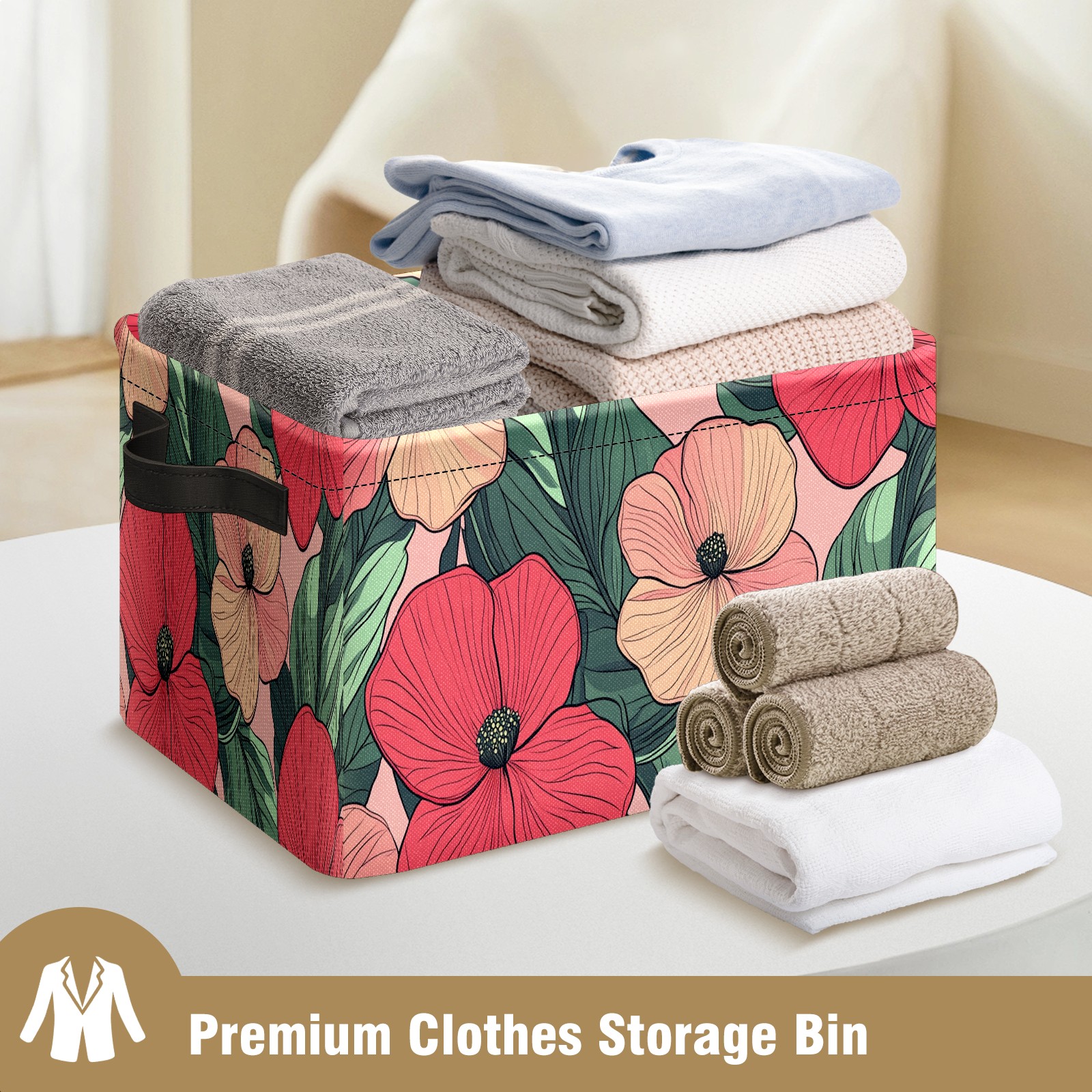 Foldable and Stackable Fabric Storage Basket for Home Organization with Handles, Decorative Closet Bins for Shelves and Laundry Storage( Red Pink Flowers)