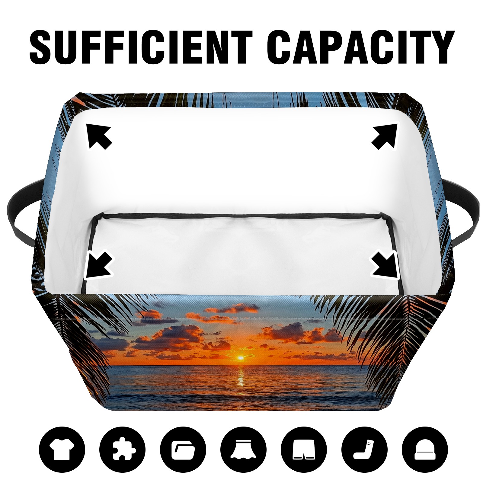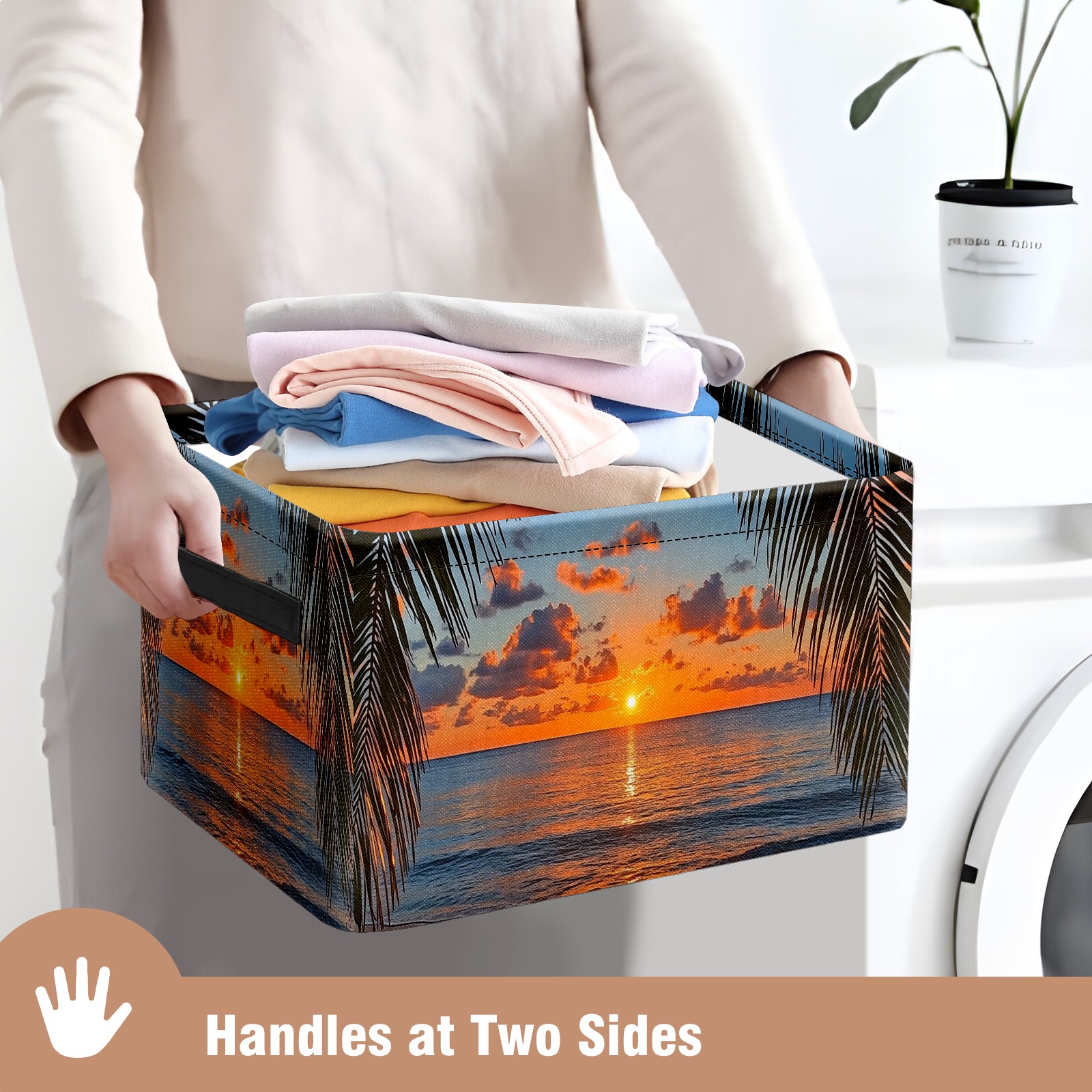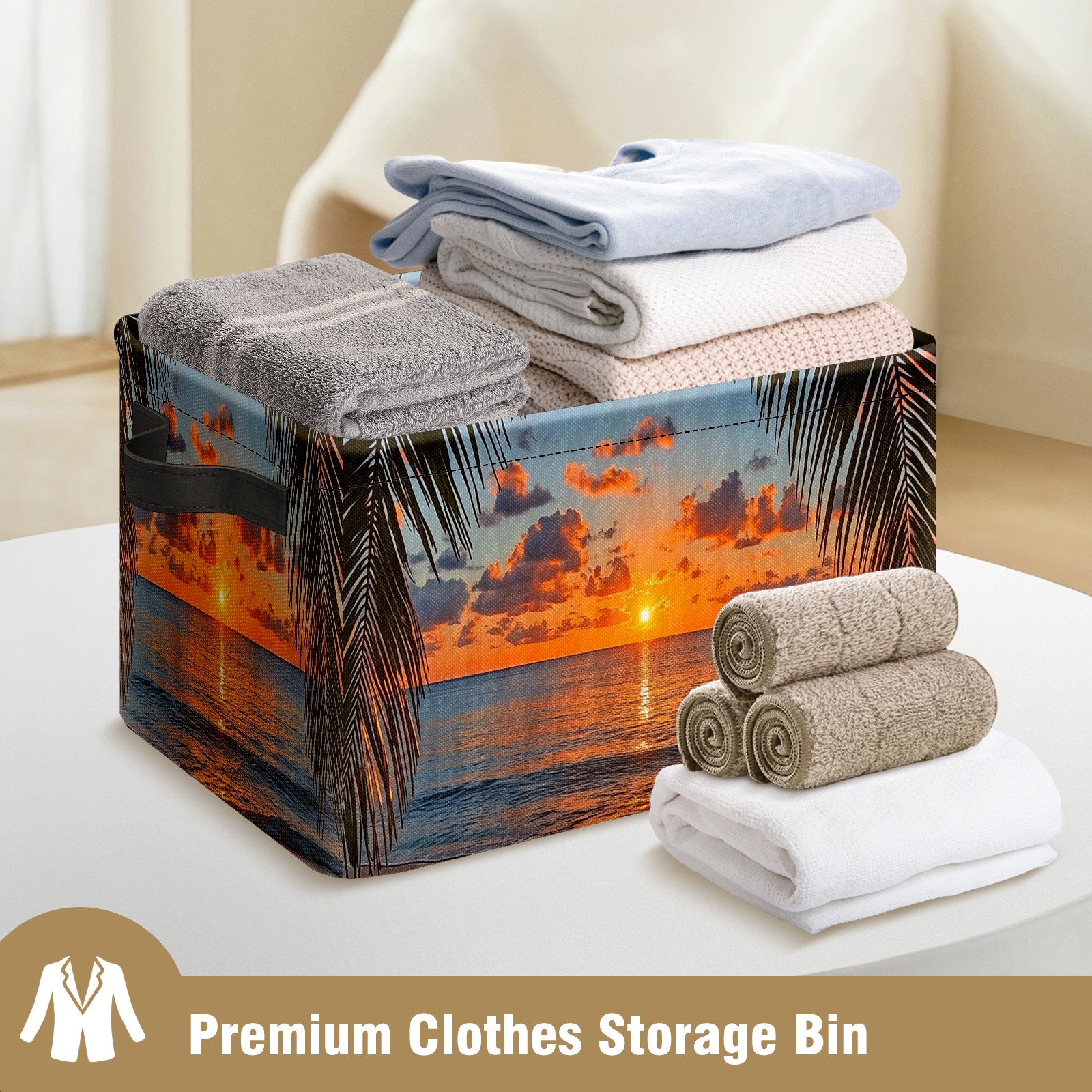 Foldable and Stackable Fabric Storage Basket for Home Organization with Handles, Decorative Closet Bins for Shelves and Laundry Storage( Sunset Beach Palm Leaves)