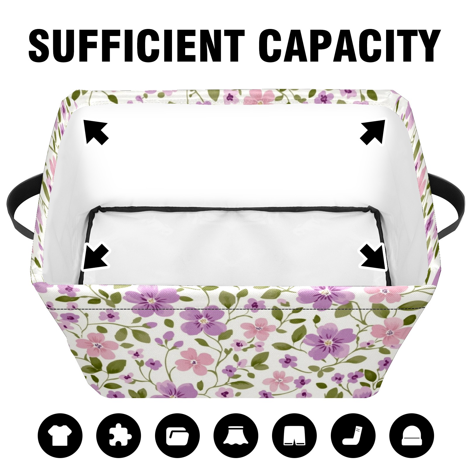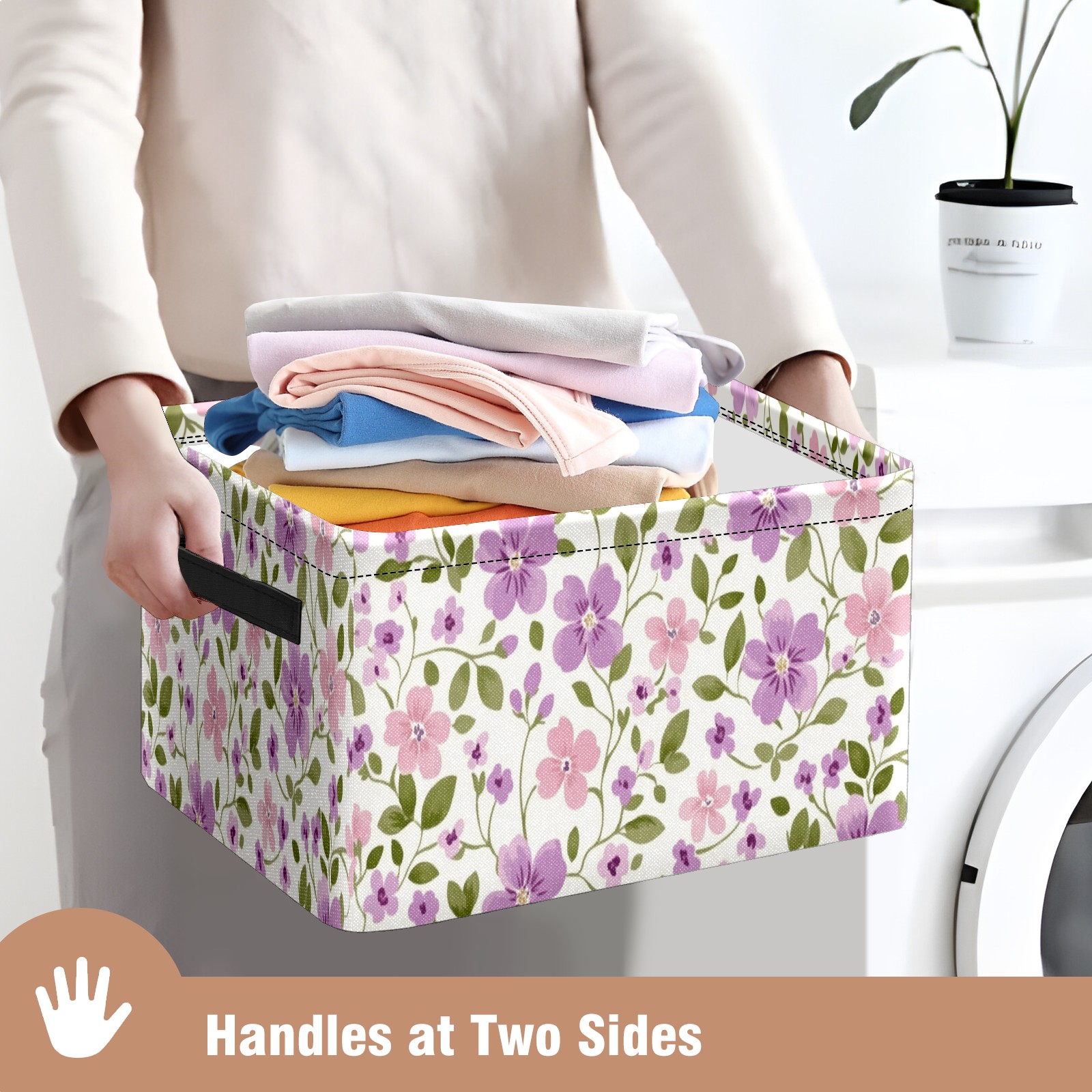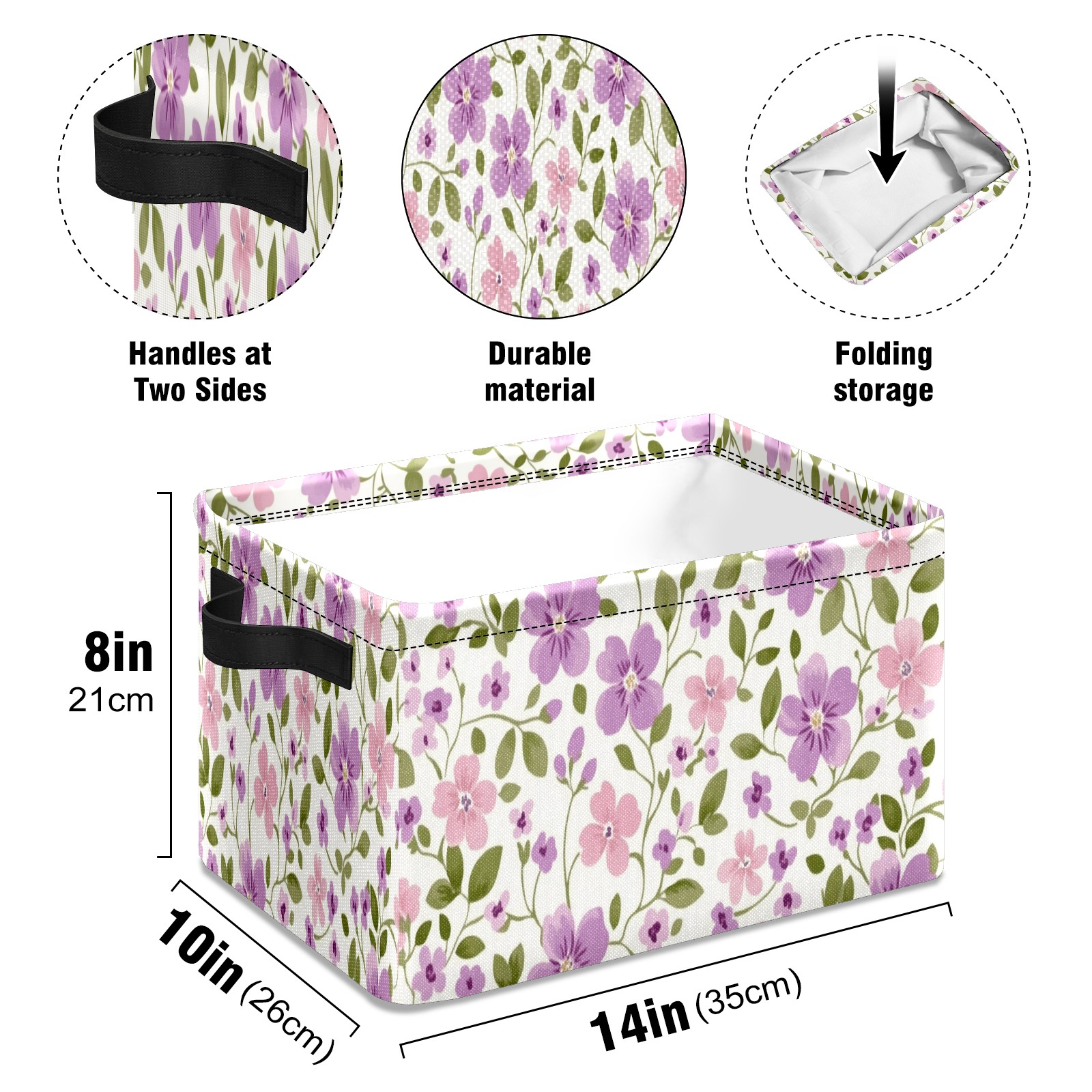 Foldable and Stackable Fabric Storage Basket for Home Organization with Handles, Decorative Closet Bins for Shelves and Laundry Storage( Small Purple Flowers)