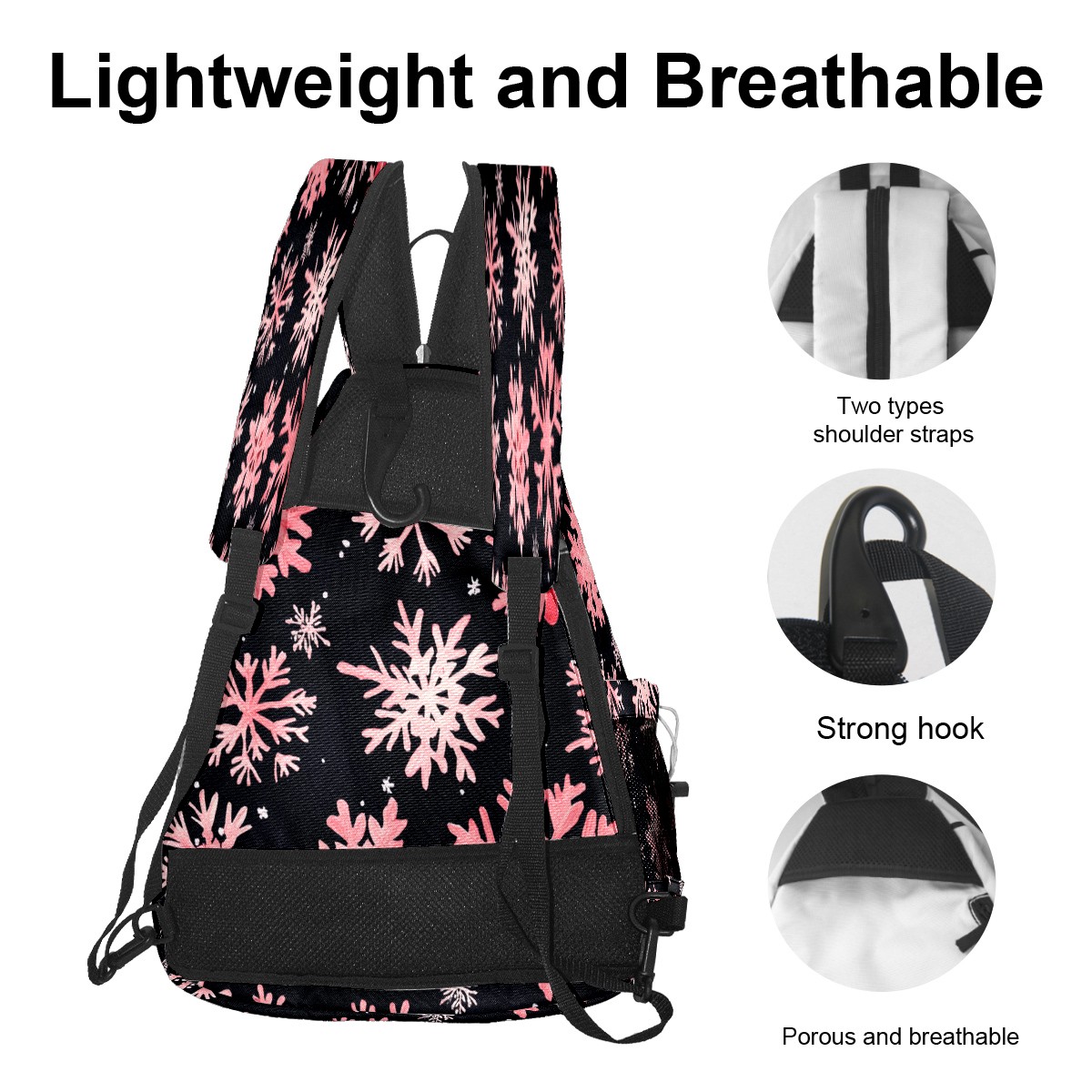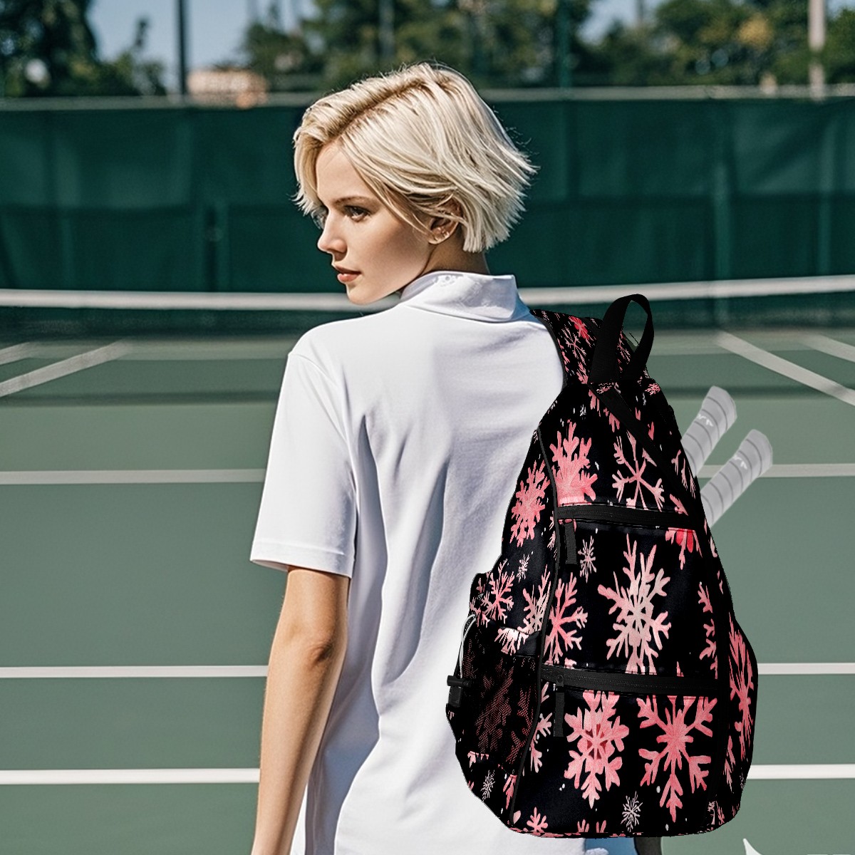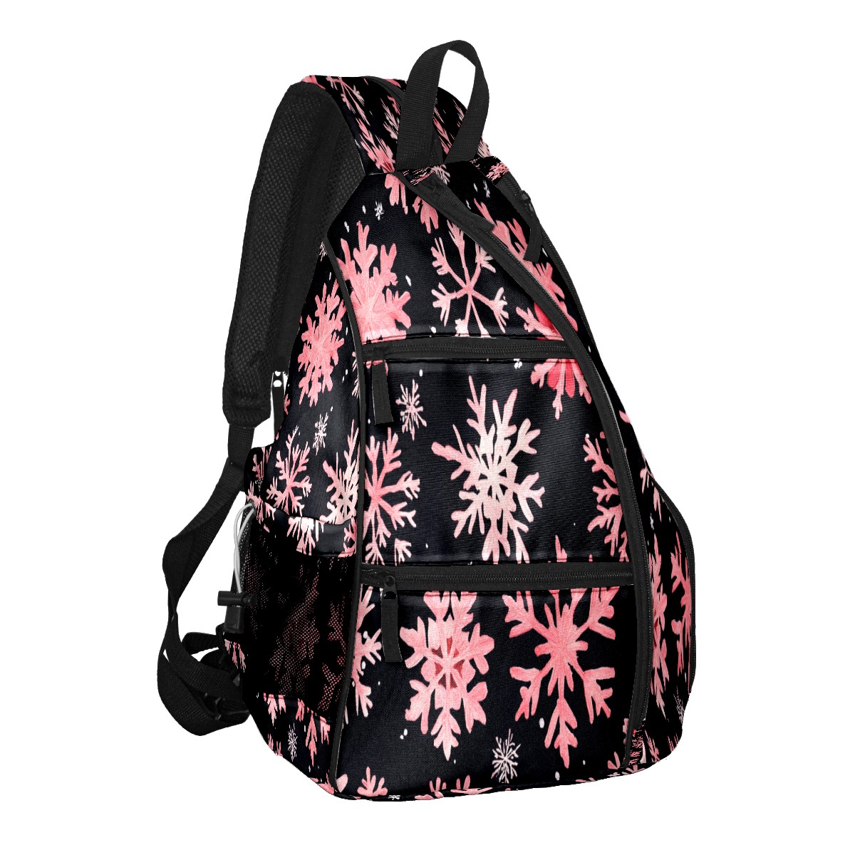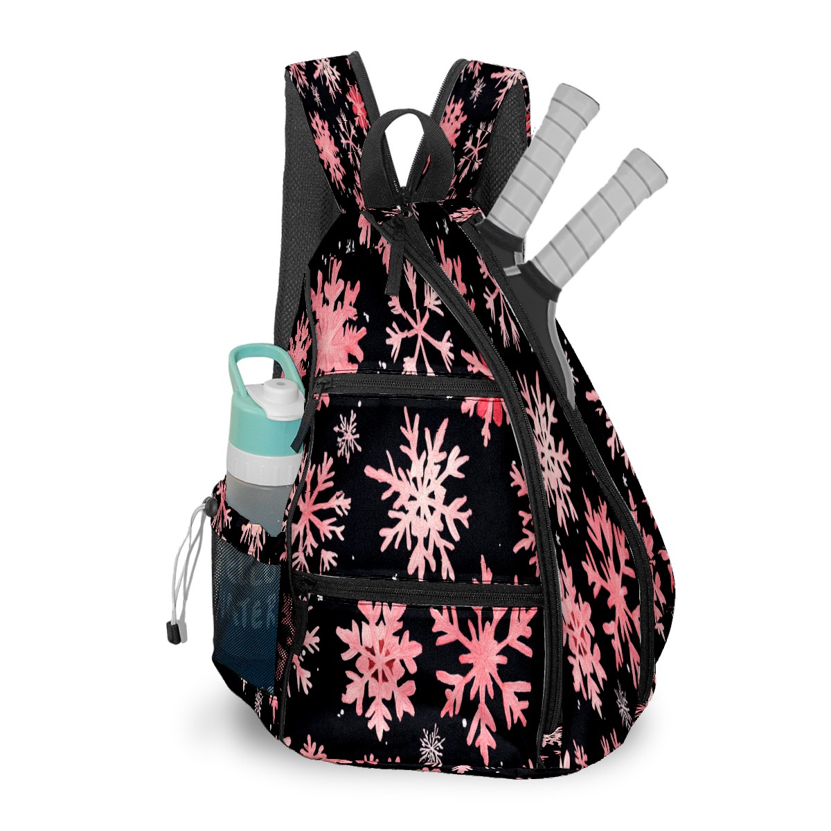 Pickleball Sling Bag for Women and Men - Backpack with Nylon Fabric/Woven Strap/Mesh Pocket/Fence Hook/Adjustable Bag Pink Snowflake Pattern