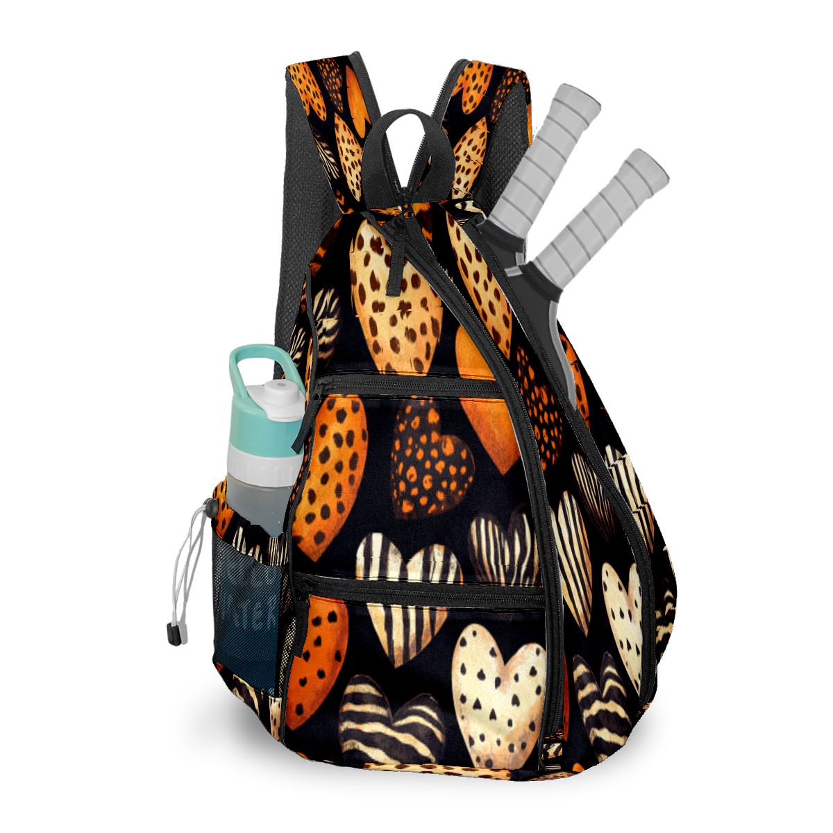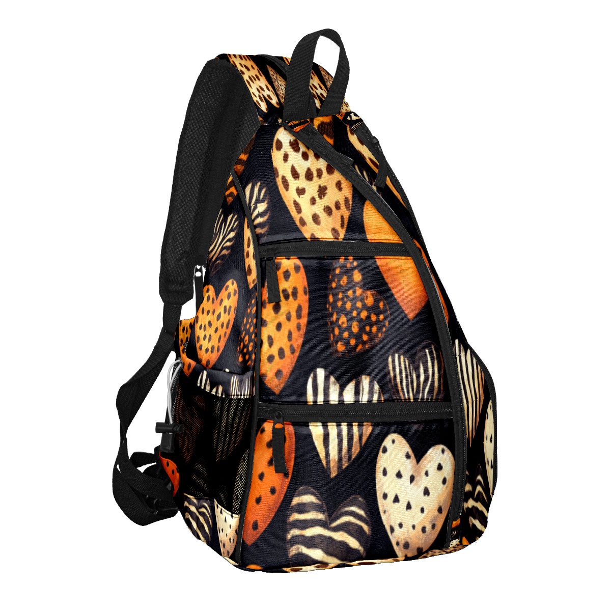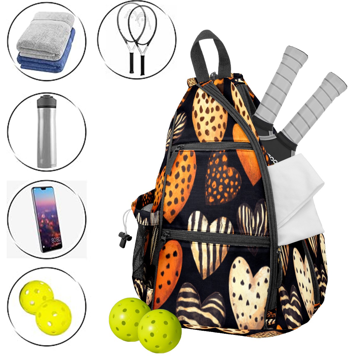 Pickleball Sling Bag for Women and Men - Backpack with Nylon Fabric/Woven Strap/Mesh Pocket/Fence Hook/Adjustable Bag Brown Heart Pattern1