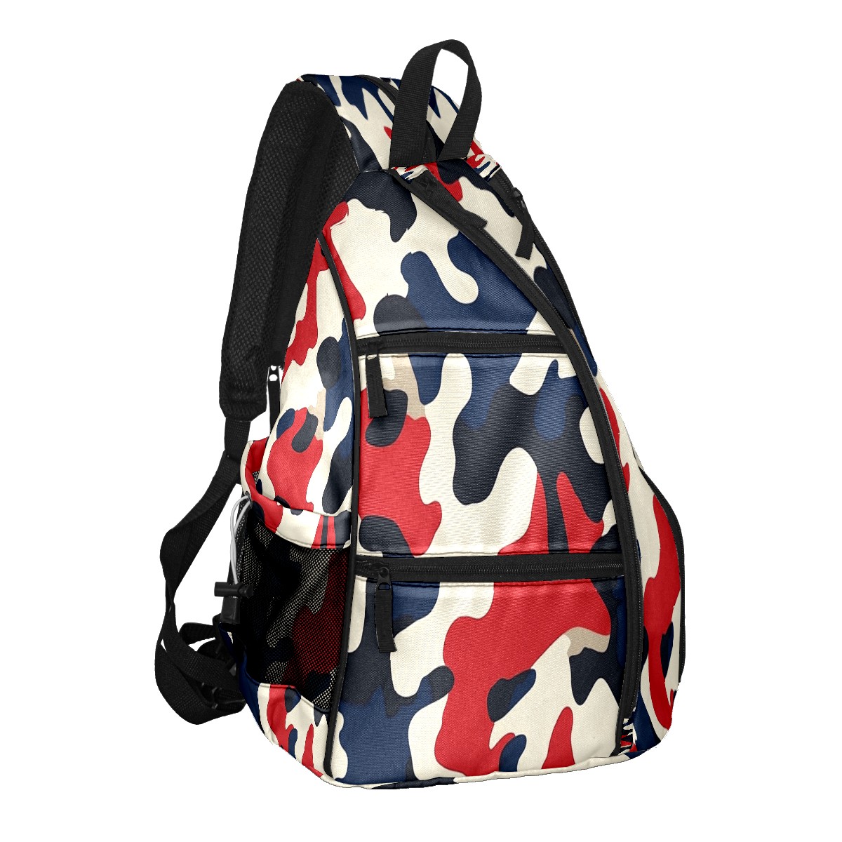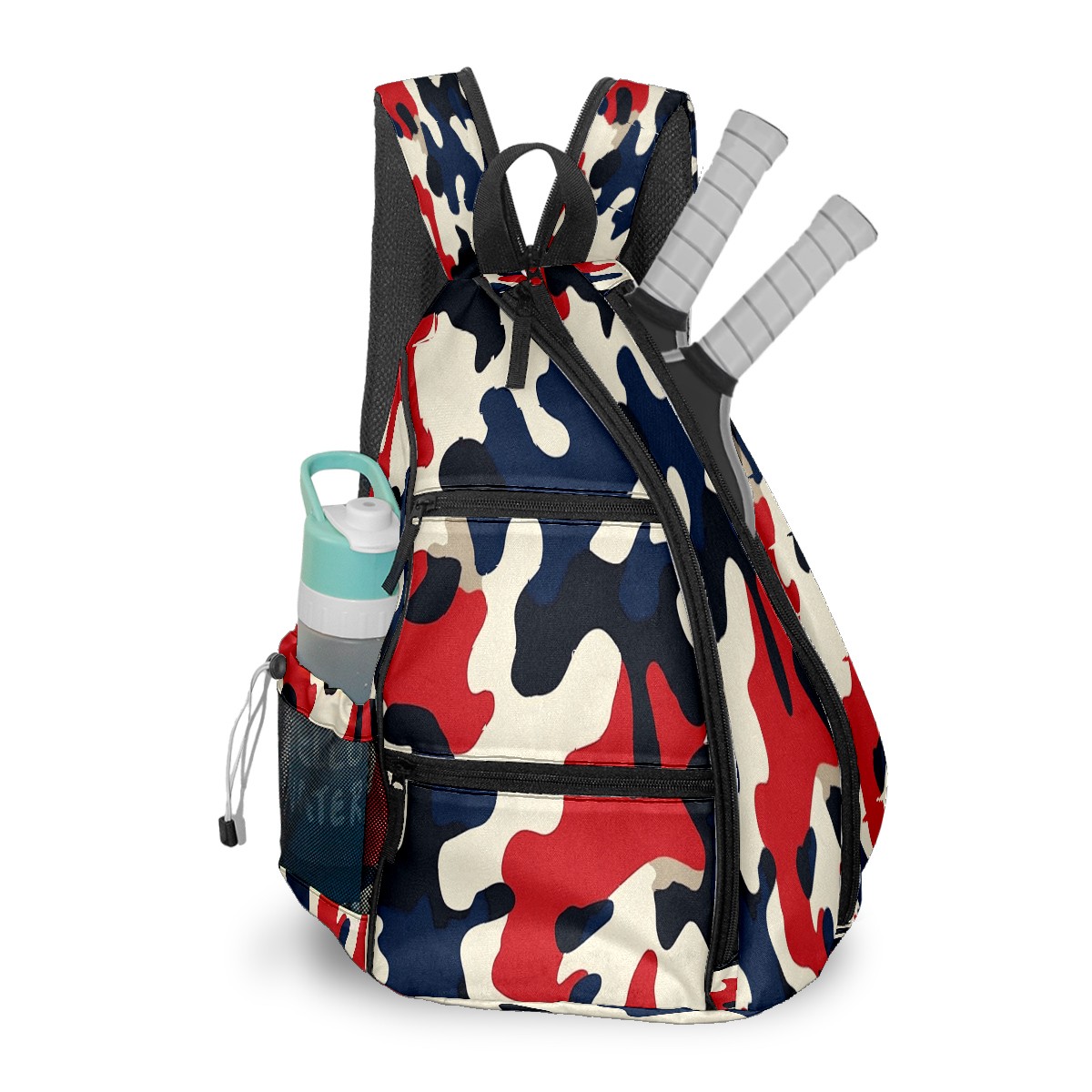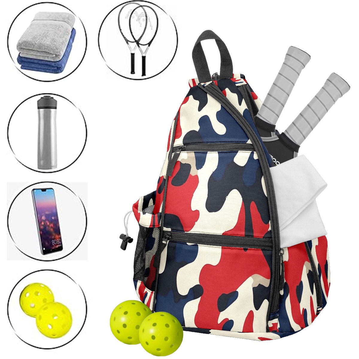 Pickleball Sling Bag for Women and Men - Backpack with Nylon Fabric/Woven Strap/Mesh Pocket/Fence Hook/Adjustable Bag Red Blue Camouflage Pattern