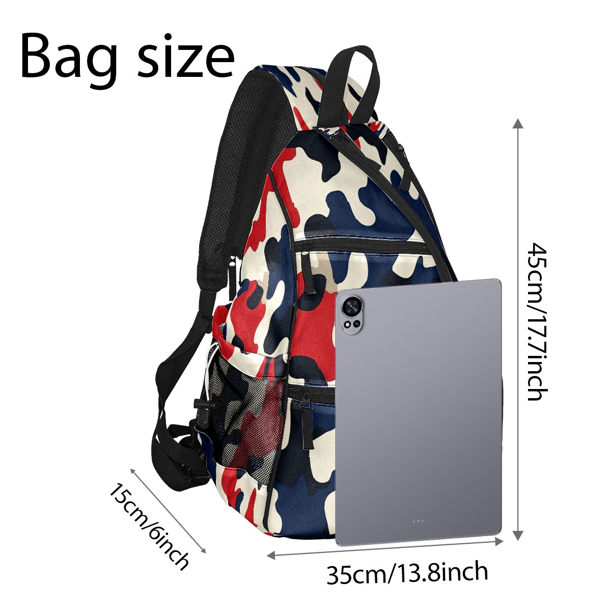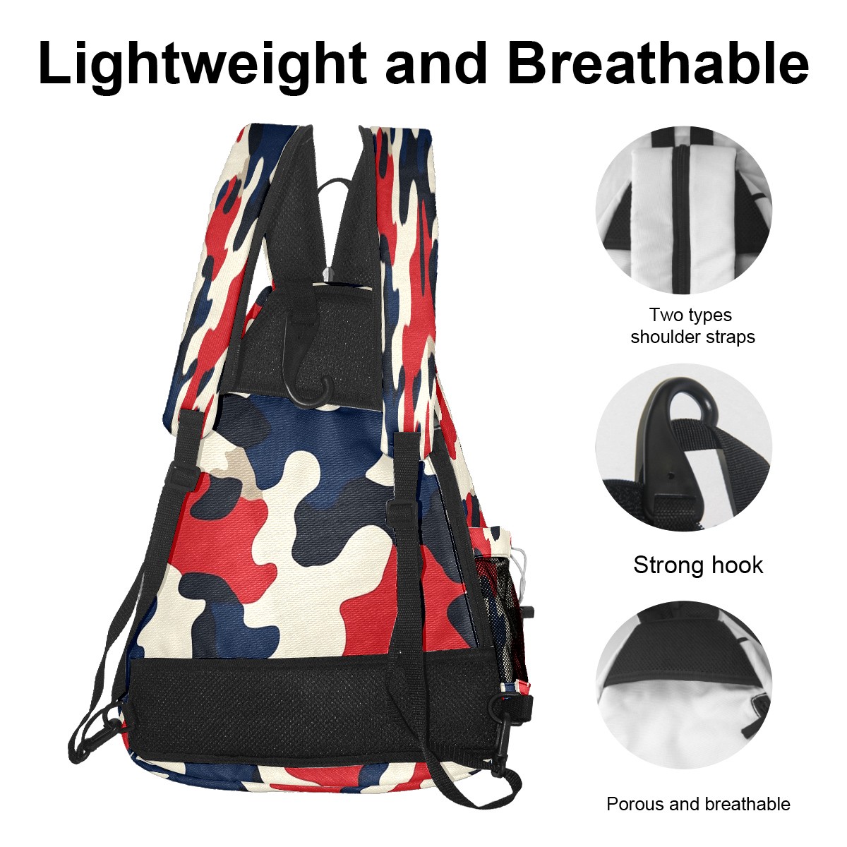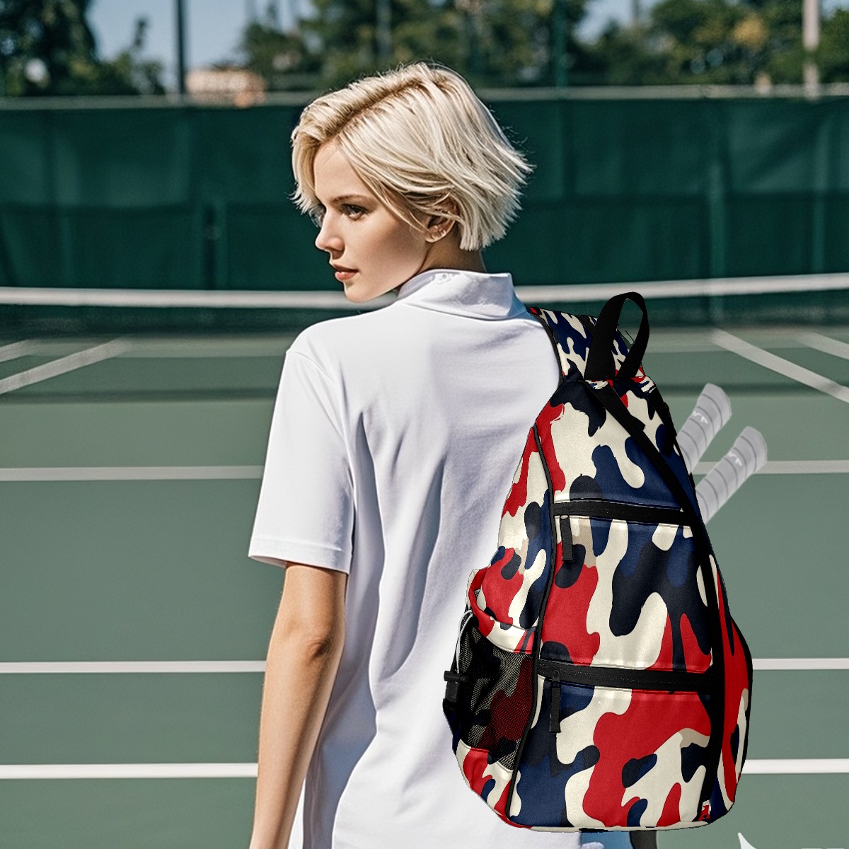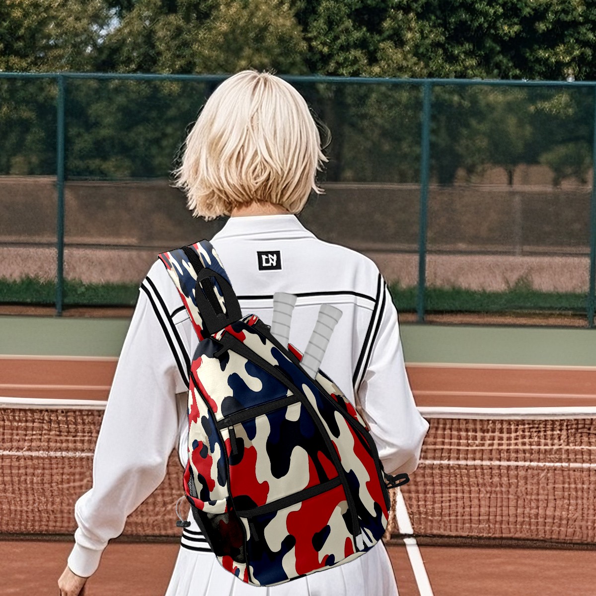 Pickleball Sling Bag for Women and Men - Backpack with Nylon Fabric/Woven Strap/Mesh Pocket/Fence Hook/Adjustable Bag Red Blue Camouflage Pattern