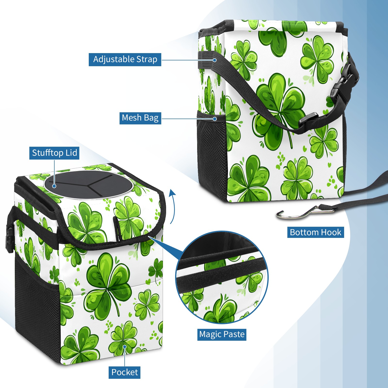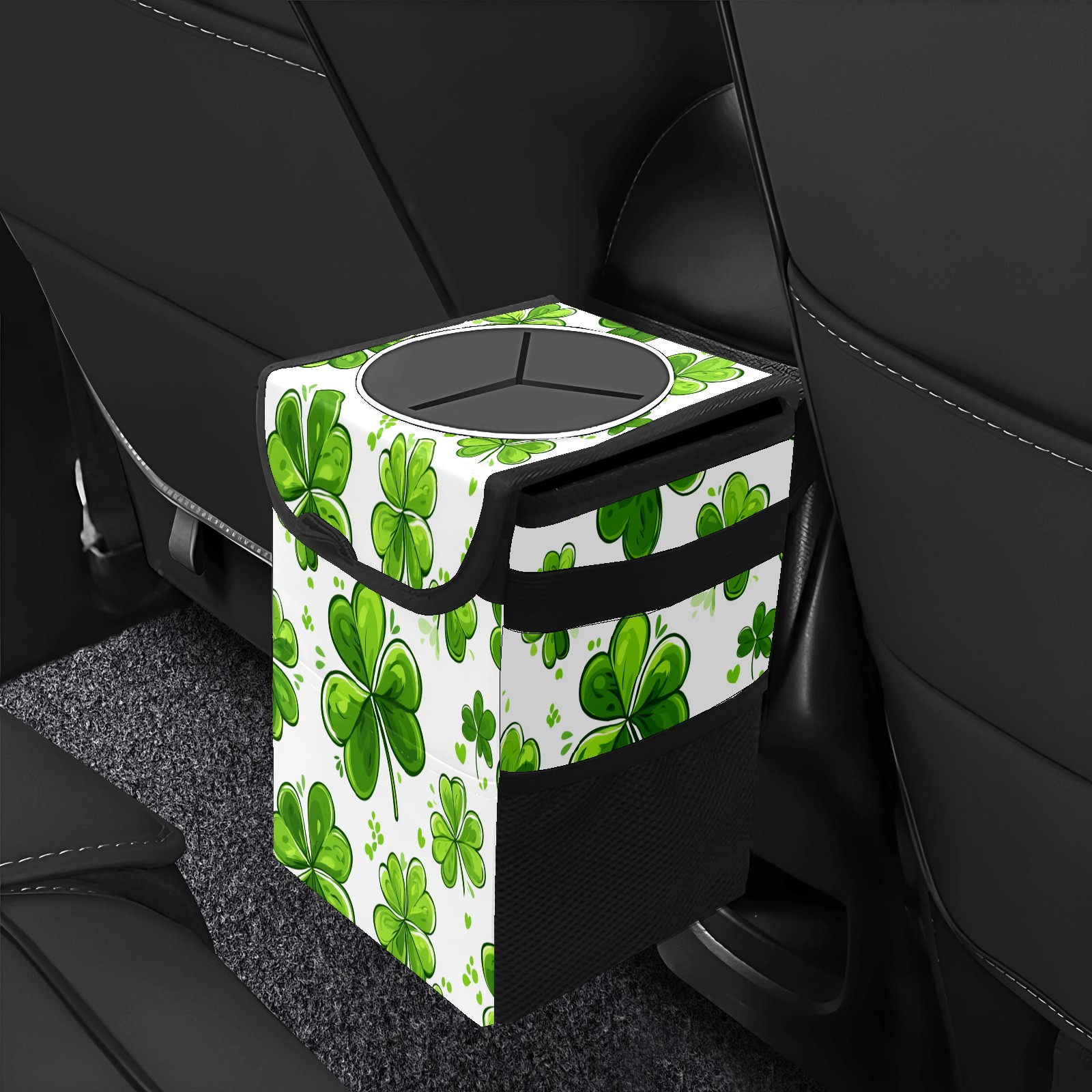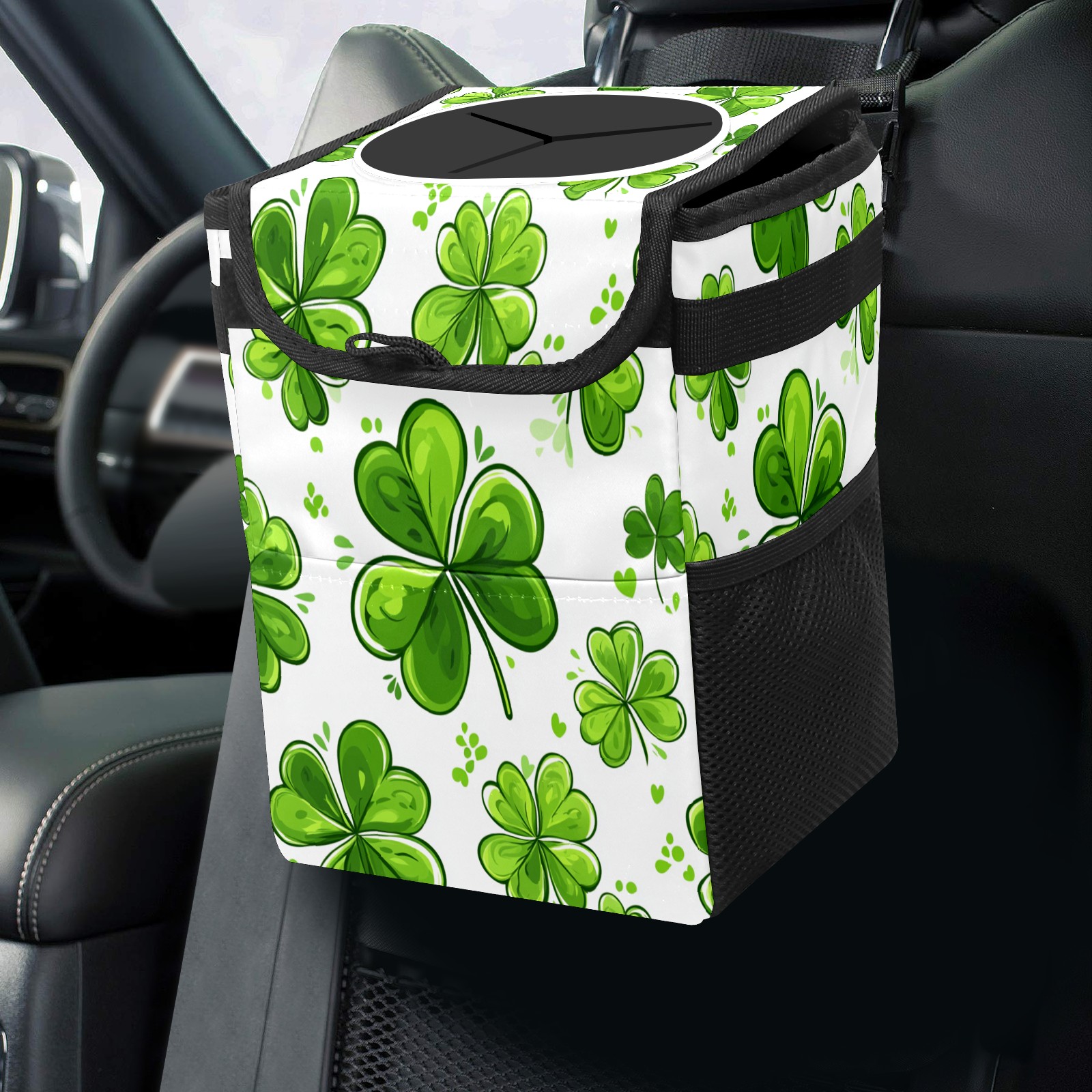 Car Trash Can with Lid & Multiple Pockets ,Foldable Vehicle Garbage Bin Waterproof & Leak Proof Automotive Garbage Cans Car Accessories for Women Men Road Trip Essentials Repeating Shamrock Pattern