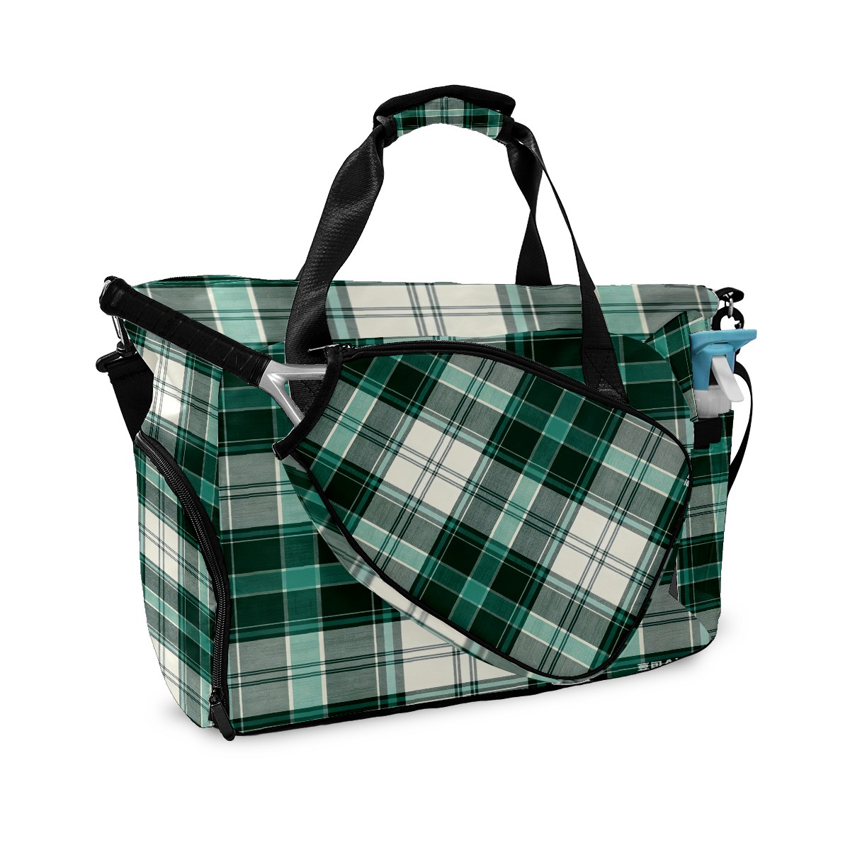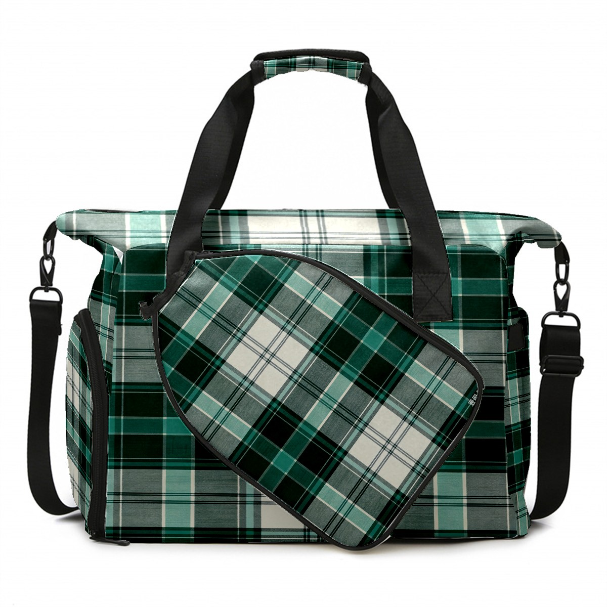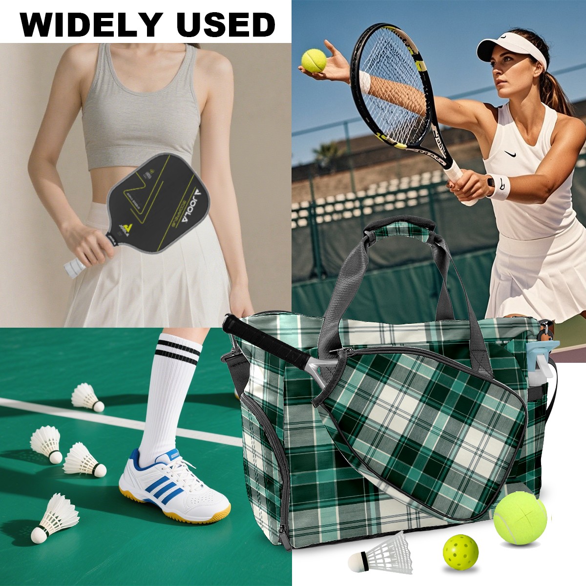 Lightweight Pickleball Tote Bag with Large Capacity, Shoe Compartment, Large Paddle Storage, Water Bottle Holder & Fence Hook for Women & Men Green White Checkered