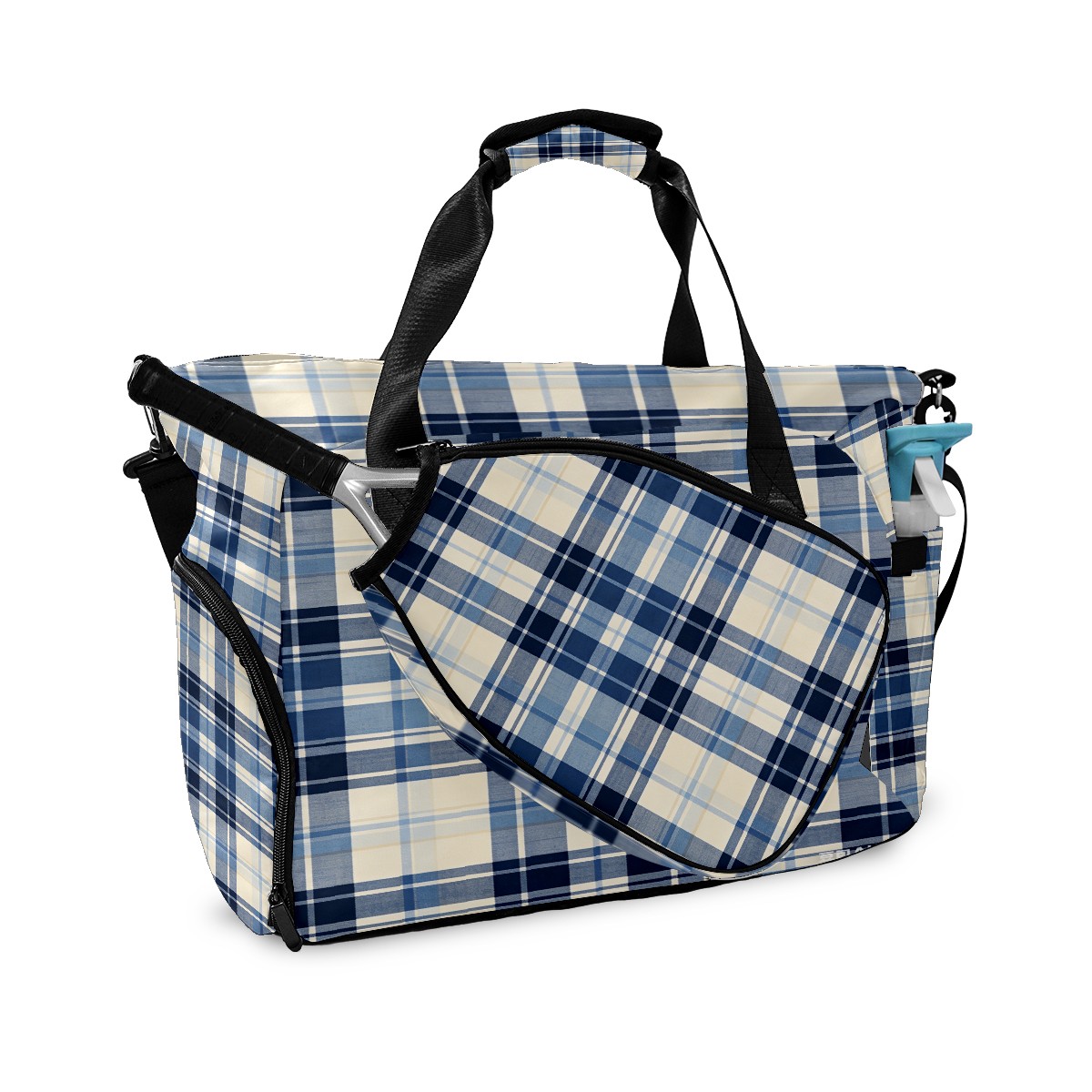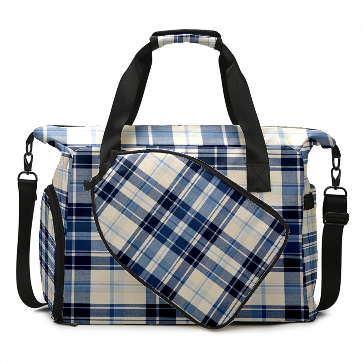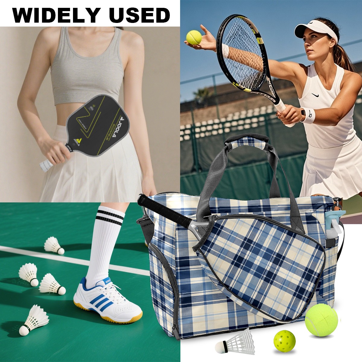 Lightweight Pickleball Tote Bag with Large Capacity, Shoe Compartment, Large Paddle Storage, Water Bottle Holder & Fence Hook for Women & Men Blue White Checkered