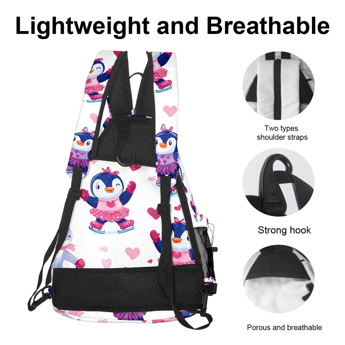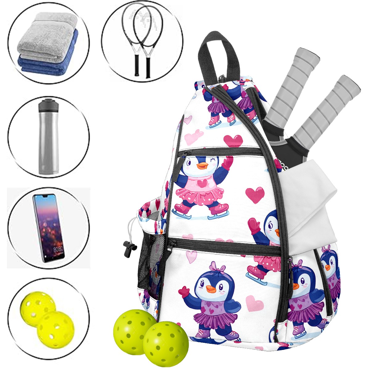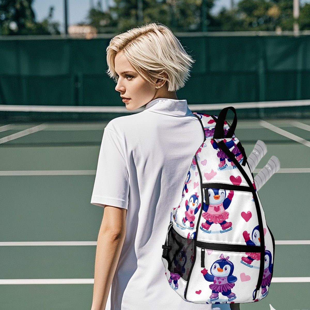 Pickleball Backpack - Convertible Shoulder Straps, Lightweight Breathable Pink Heart Penguins Bag, Fits 2 Paddles, Balls & Gear (45x35x15cm)