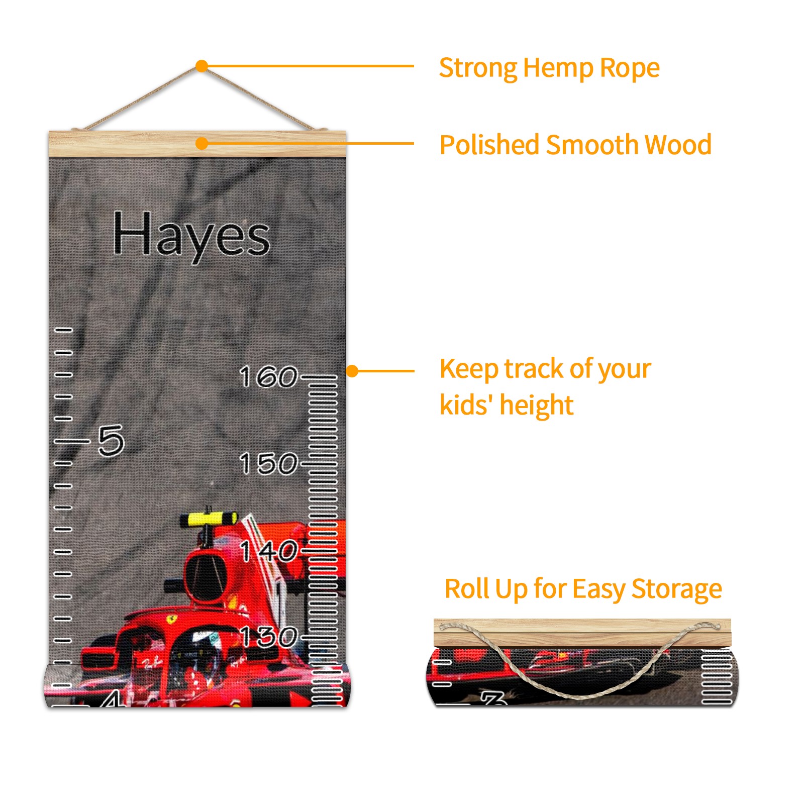 Personalized Kids Name Growth Chart Ruler for Wall Wood Frame Canvas Height Measure Chart 13.4x56 in Hanging Growth Chart RACE CAR12.23 Boys Girls Room Decor