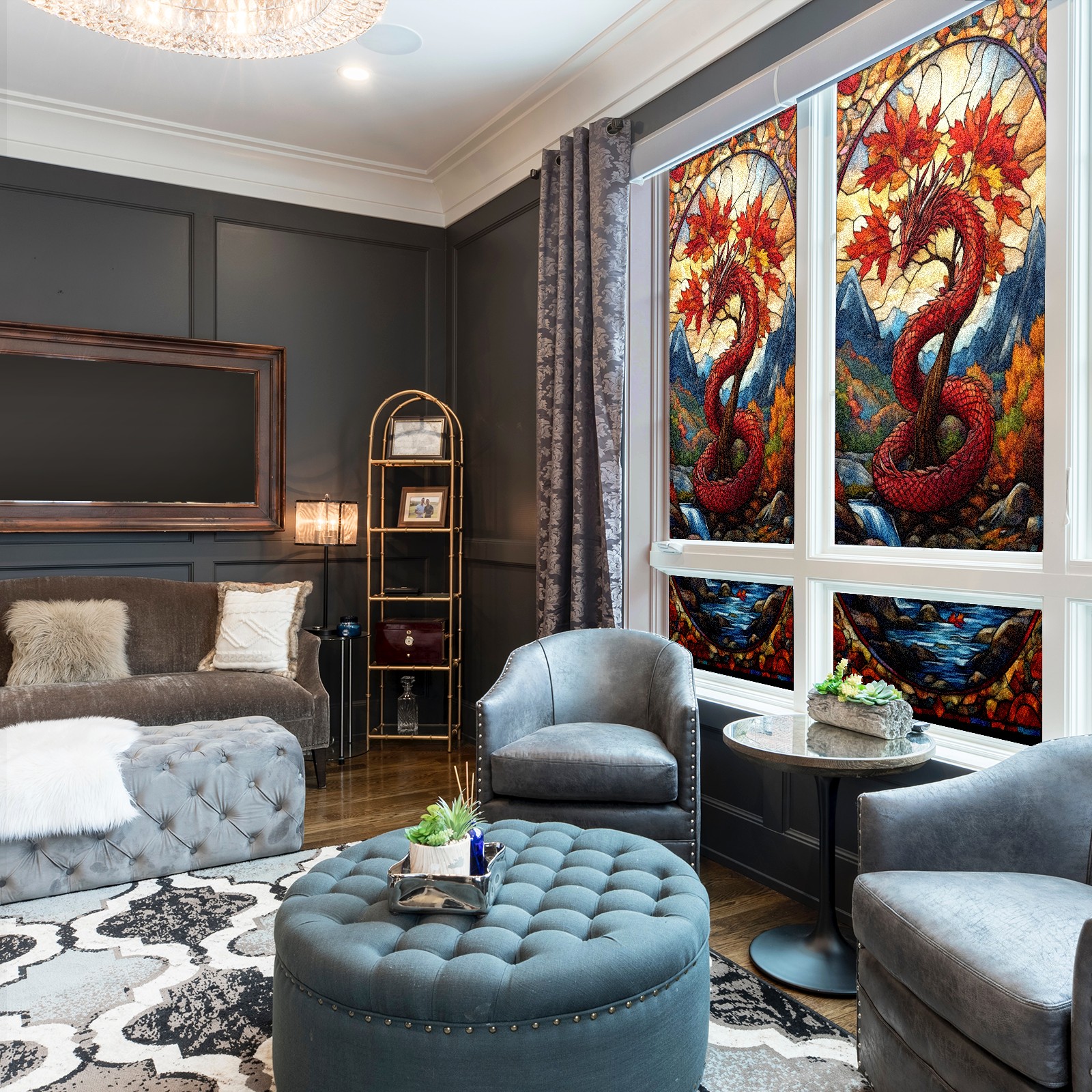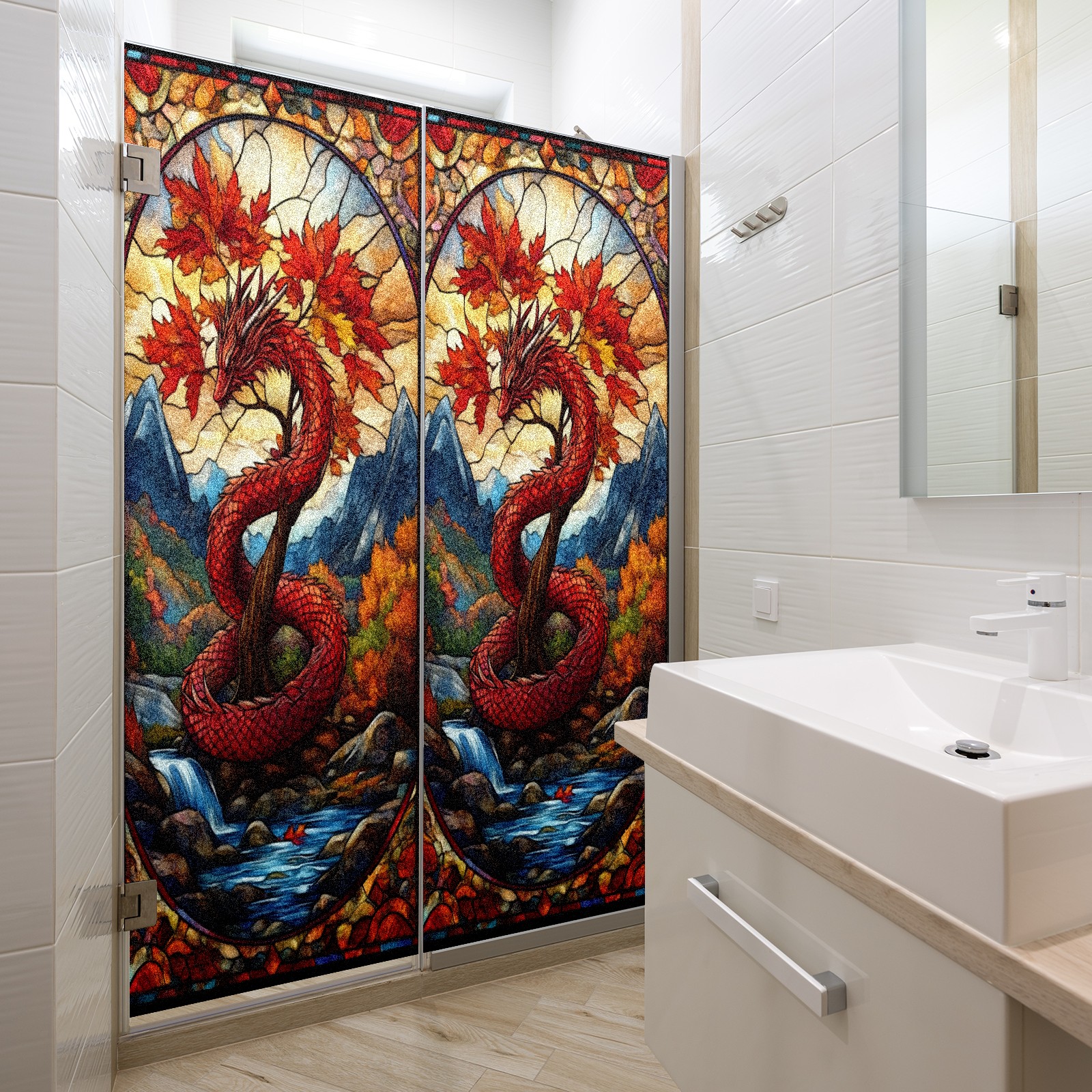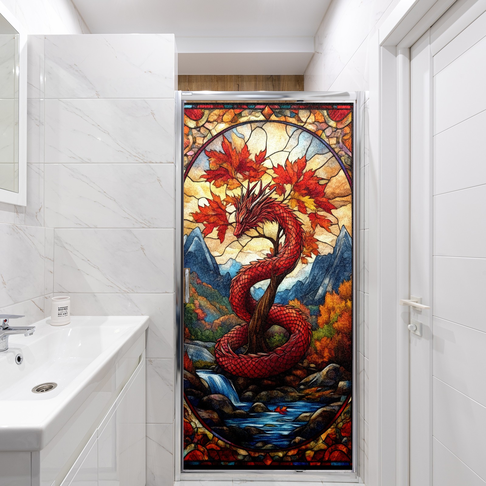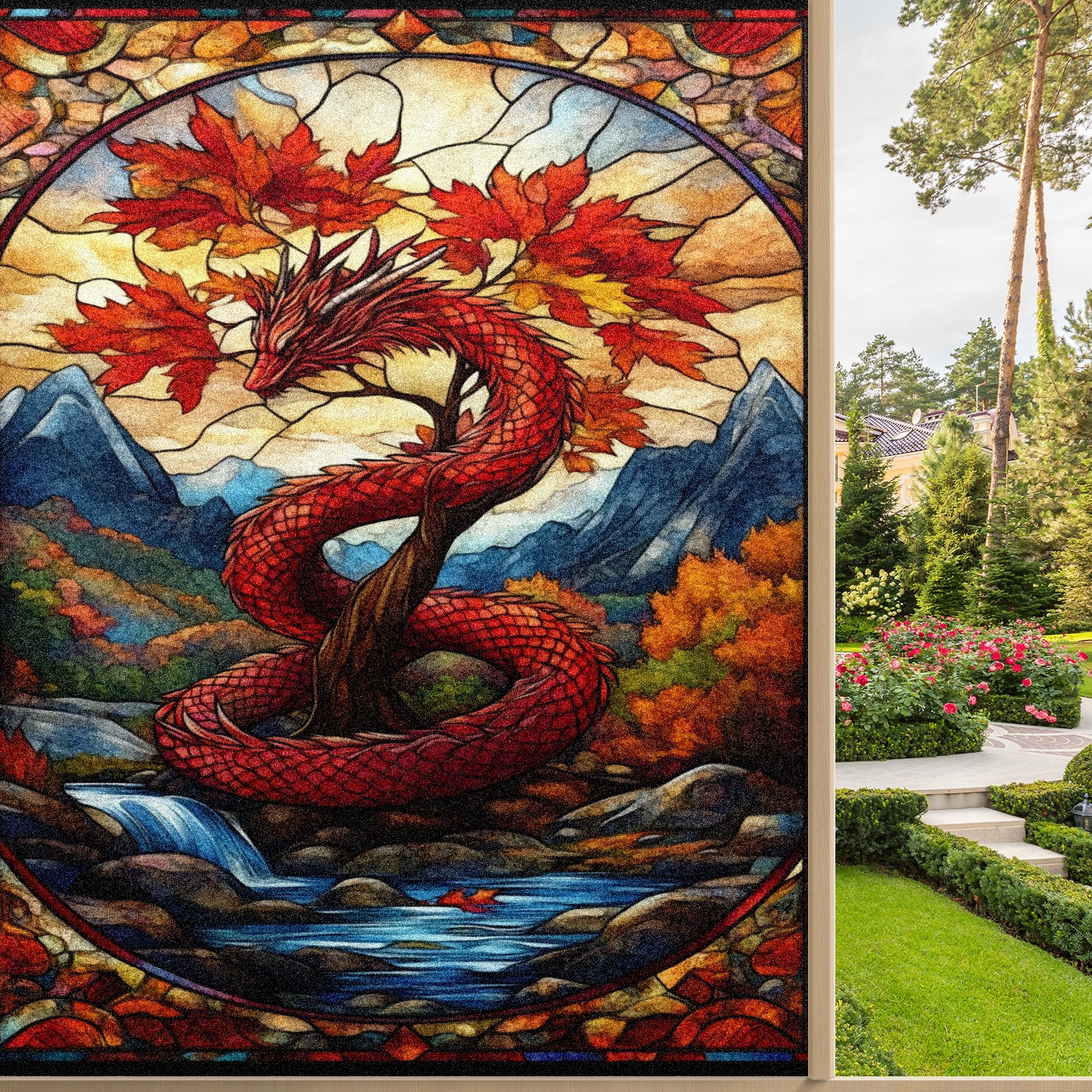 Stained Glass Window Film - Decorative Privacy Film for Windows, Peel and Stick Window Film for Bathroom/Office/Shower, Reusable and Easy to Cut 17.7"x23.6" (Red Dragon And Maple Tree)