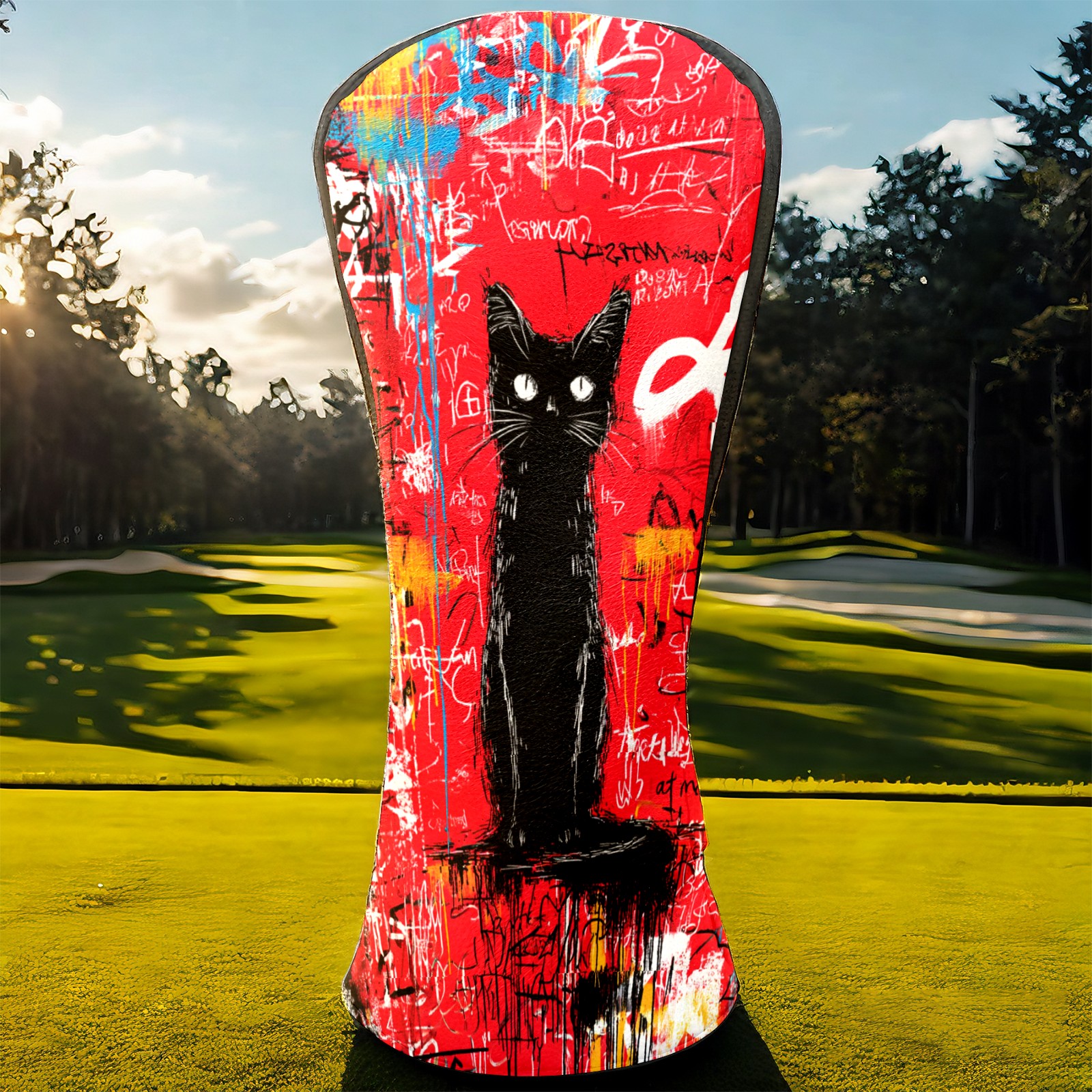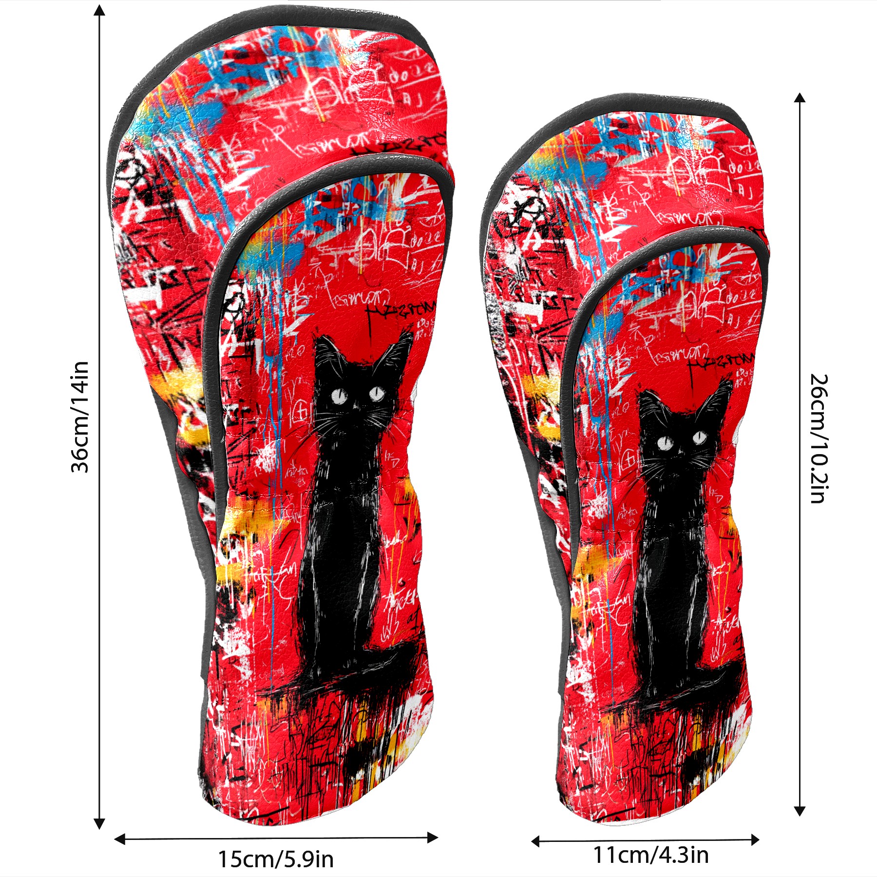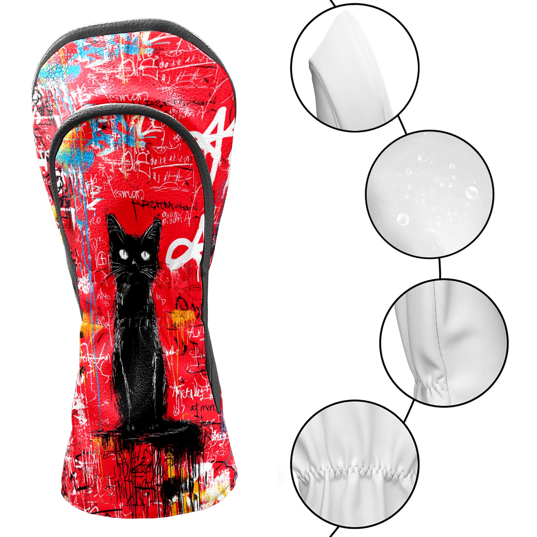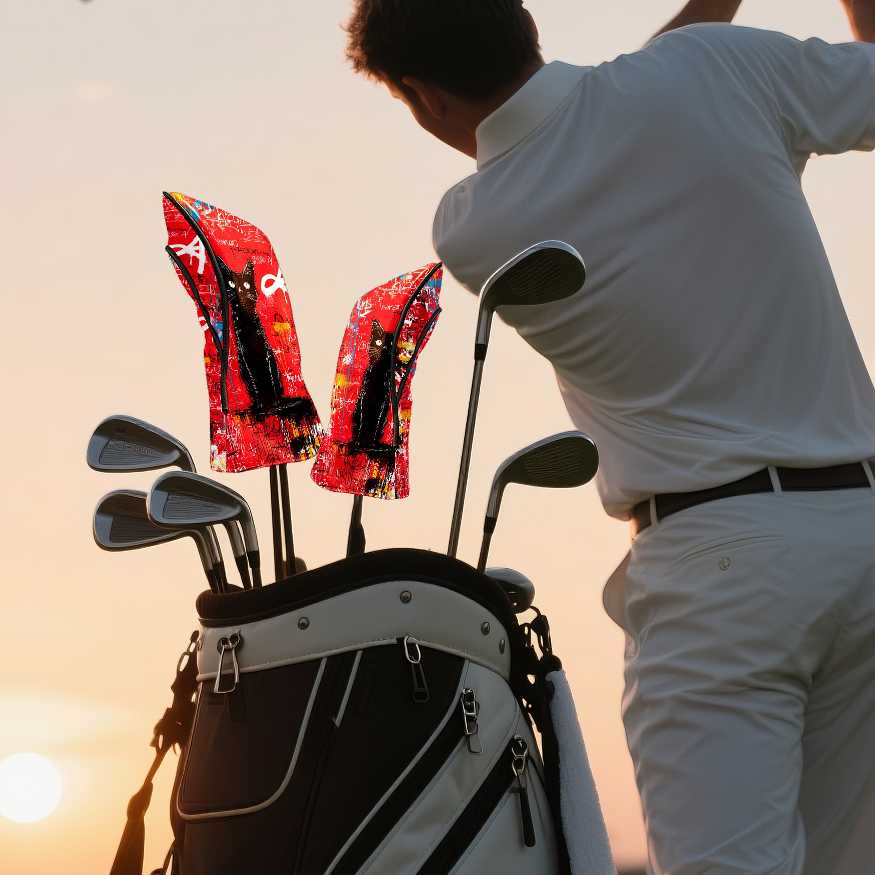 Golf Head Covers Artistic Black Cat Red for Driver & Fairway Woods | Waterproof PU Leather & Plush Lining | Stylish Gift for Men/Women