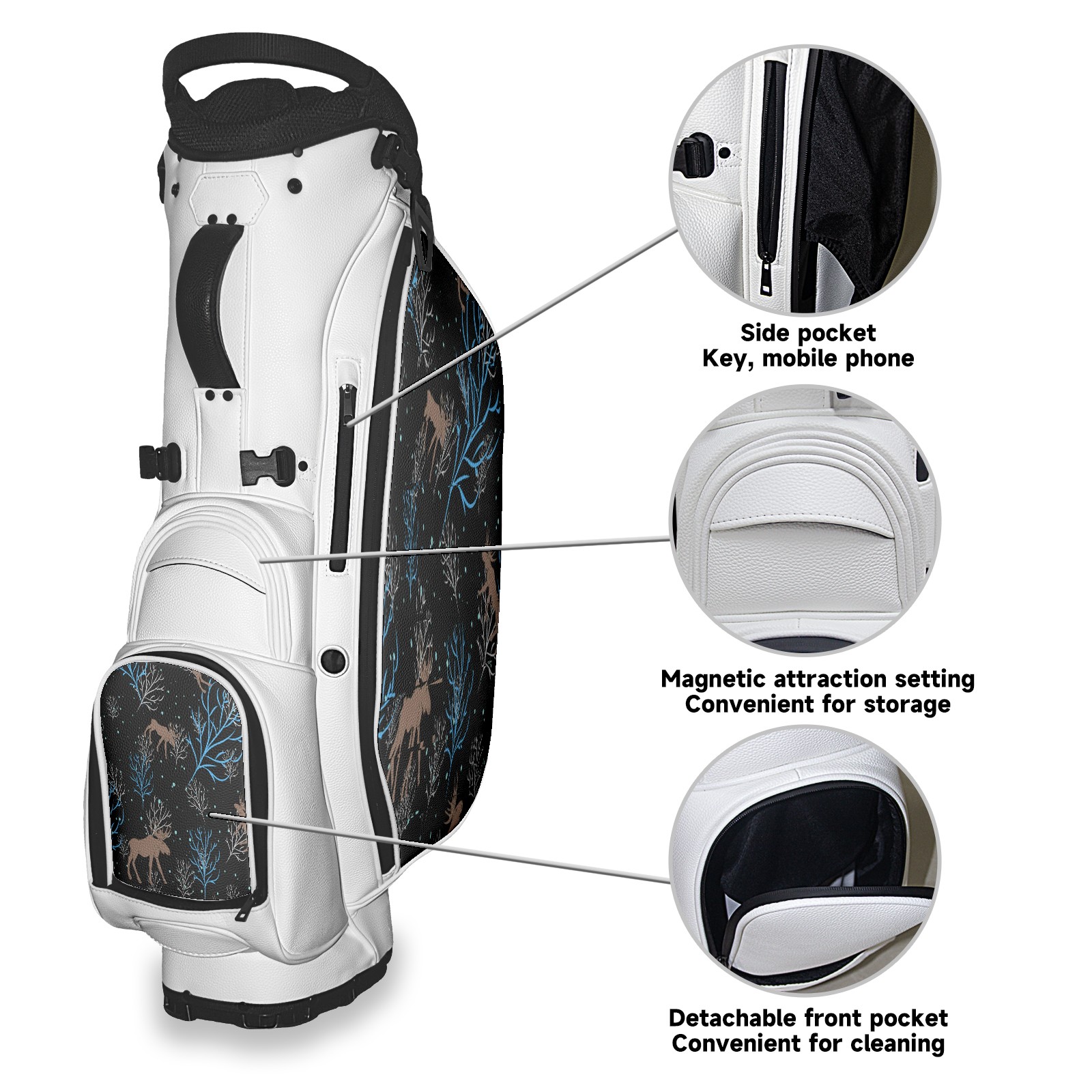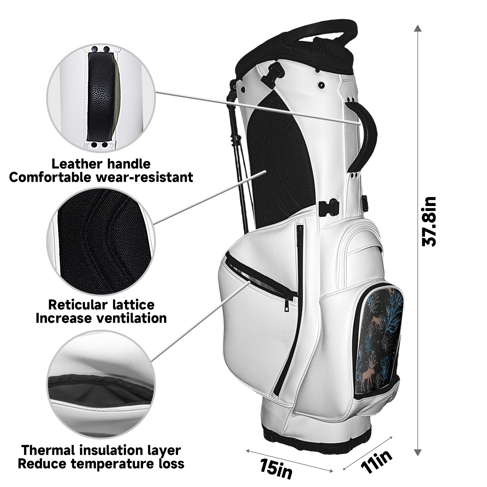 • <p>The Golf Stand Bag, designed specifically for golf enthusiasts, offers a choice of 5 - way and 14 - way top dividers. Its 5/14 - compartment design with independent full - size club compartments safeguards clubs from collisions. Equipped with a rain cover, waterproof zippered pockets (tested to resist moderate to heavy rain), and a high - performance cooler pouch that can keep drinks cold for hours, it ensures a convenient golfing experience. The bag features thickened, breathable neoprene shoulder straps and an adjustable chest buckle, reducing shoulder fatigue by 35% compared to regular bags, and its automatic aluminum alloy stand provides stable support on various terrains. Crafted from top - tier, water - resistant litchi - grain PU leather, with double - stitched edges, reliable zippers tested for over 15,000 cycles, and anti - abrasion bottom studs, it guarantees durability. You can personalize it with embroidery on the front pocket and rain cover side (15*15cm area), and it comes in classic black and white, with a matte finish and litchi - grain texture that combines business and leisure styles. Measuring 130 cm in height, 37 cm in width, and 31 cm in depth (including rain cover) and 90 cm x 31 cm x 37 cm (excluding rain cover), it strikes a balance between storage and portability, capable of holding 14 standard - sized clubs and other essentials, and it also includes a dust cover. It's truly the perfect choice for golfers.<br></p>