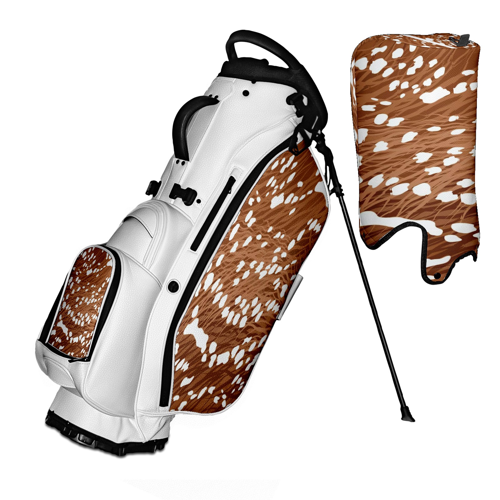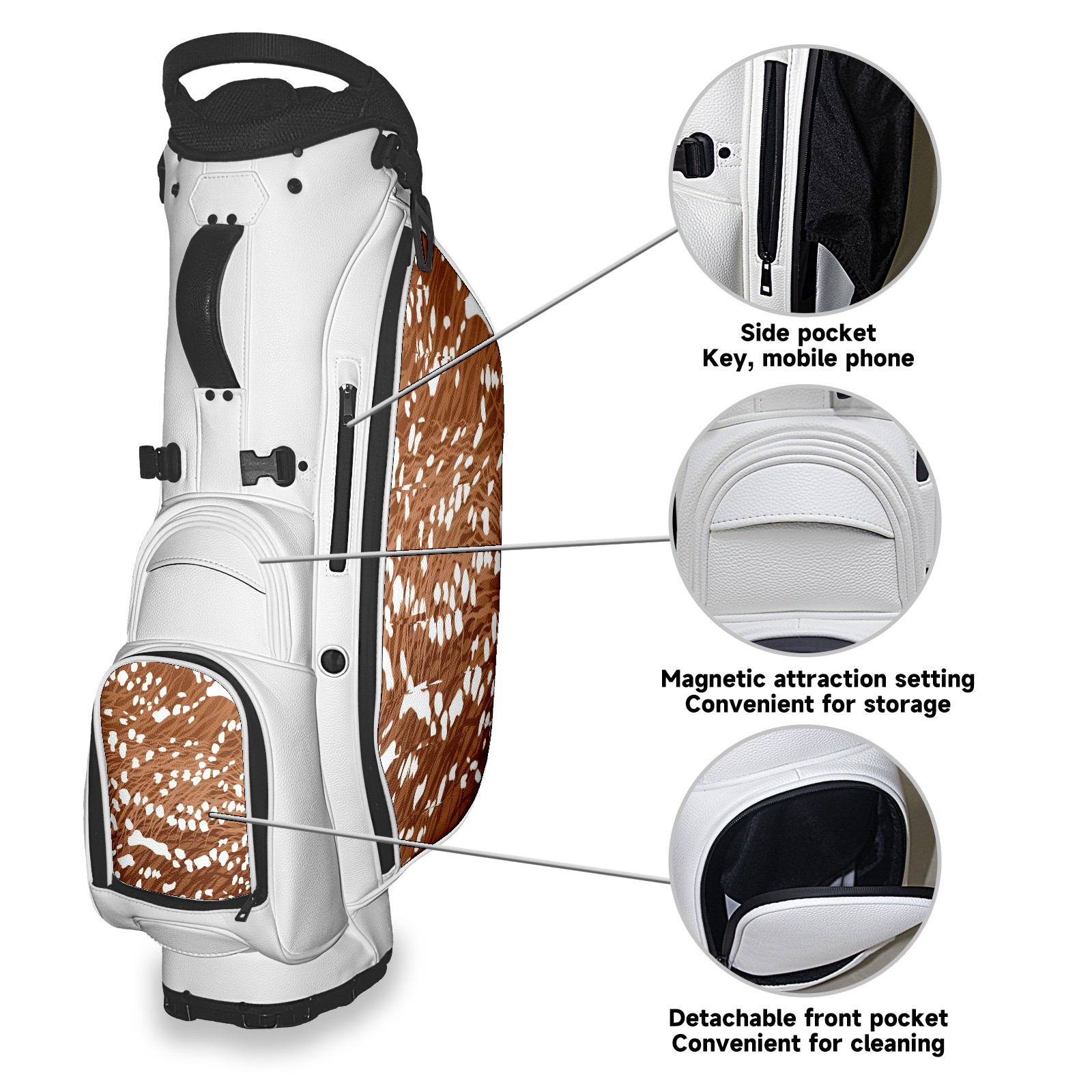 <p>The Golf Stand Bag, designed specifically for golf enthusiasts, offers a choice of 5 - way and 14 - way top dividers. Its 5/14 - compartment design with independent full - size club compartments safeguards clubs from collisions. Equipped with a rain cover, waterproof zippered pockets (tested to resist moderate to heavy rain), and a high - performance cooler pouch that can keep drinks cold for hours, it ensures a convenient golfing experience. The bag features thickened, breathable neoprene shoulder straps and an adjustable chest buckle, reducing shoulder fatigue by 35% compared to regular bags, and its automatic aluminum alloy stand provides stable support on various terrains. Crafted from top - tier, water - resistant litchi - grain PU leather, with double - stitched edges, reliable zippers tested for over 15,000 cycles, and anti - abrasion bottom studs, it guarantees durability. You can personalize it with embroidery on the front pocket and rain cover side (15*15cm area), and it comes in classic black and white, with a matte finish and litchi - grain texture that combines business and leisure styles. Measuring 130 cm in height, 37 cm in width, and 31 cm in depth (including rain cover) and 90 cm x 31 cm x 37 cm (excluding rain cover), it strikes a balance between storage and portability, capable of holding 14 standard - sized clubs and other essentials, and it also includes a dust cover. It's truly the perfect choice for golfers.<br></p>