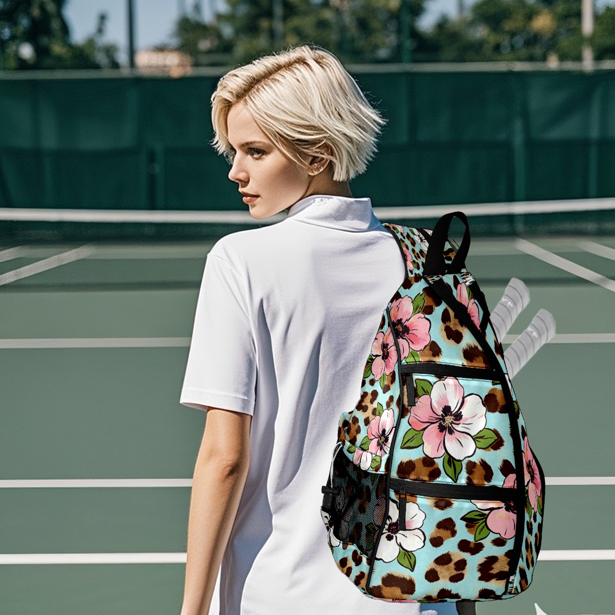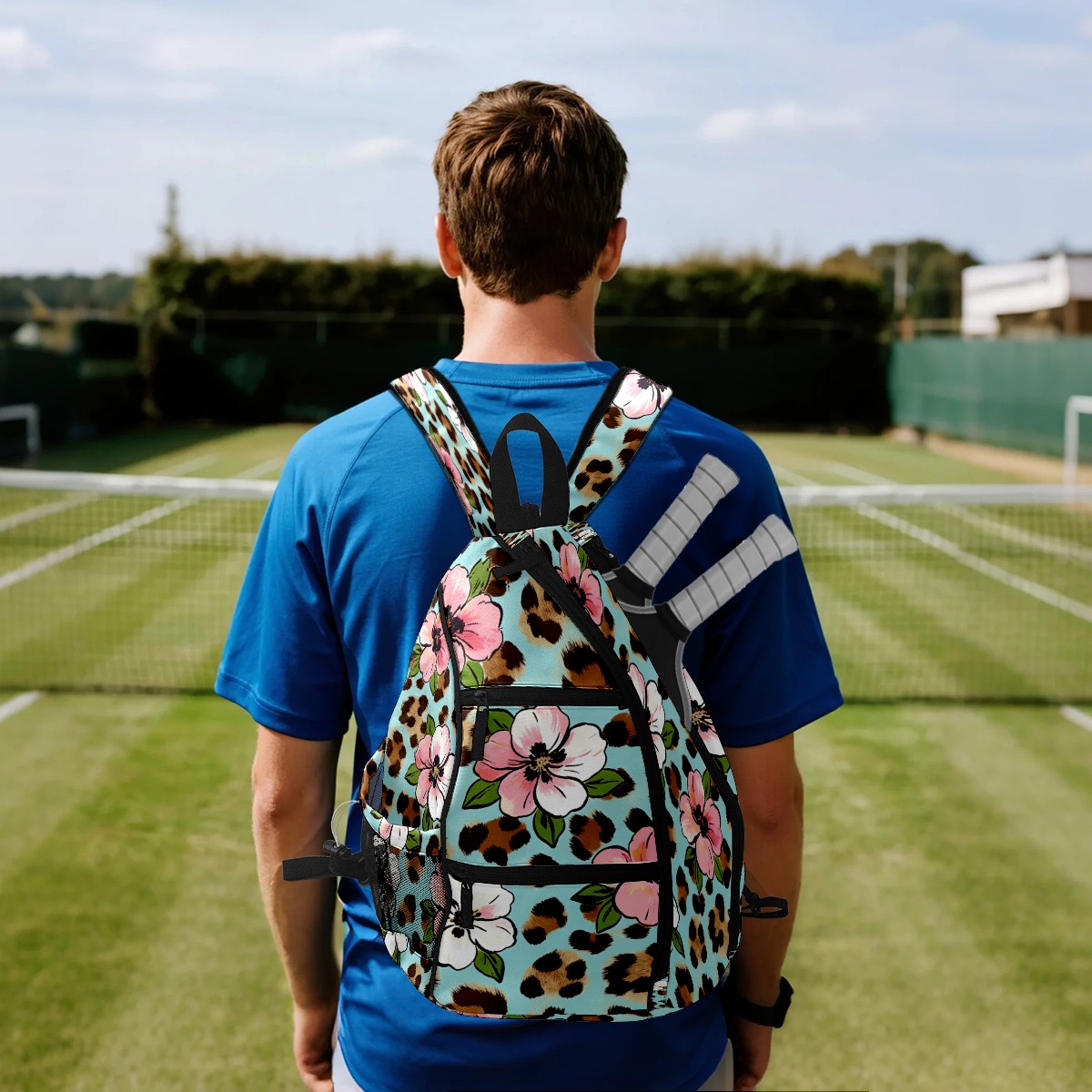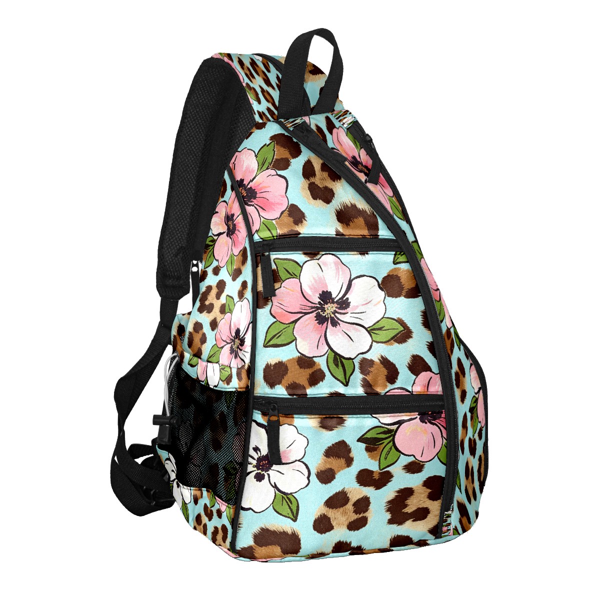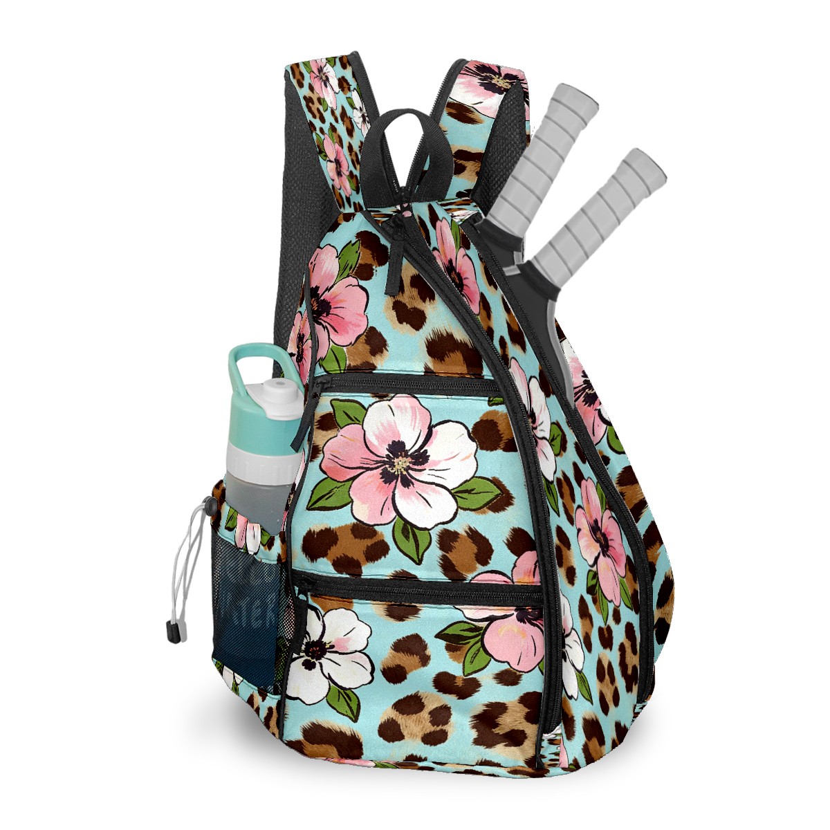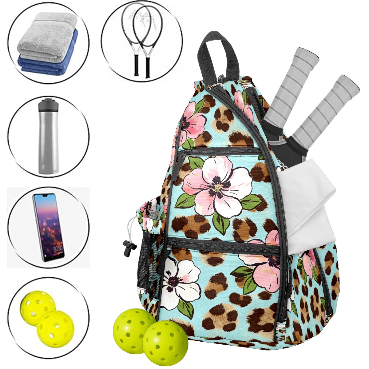 Pickleball Bag - Leopard Print Pink White Flowers Unisex Pickleball Backpack with Fence Hook, Adjustable Shoulder Straps, Security Pocket, Gift for Pickle Ball Enthusiasts