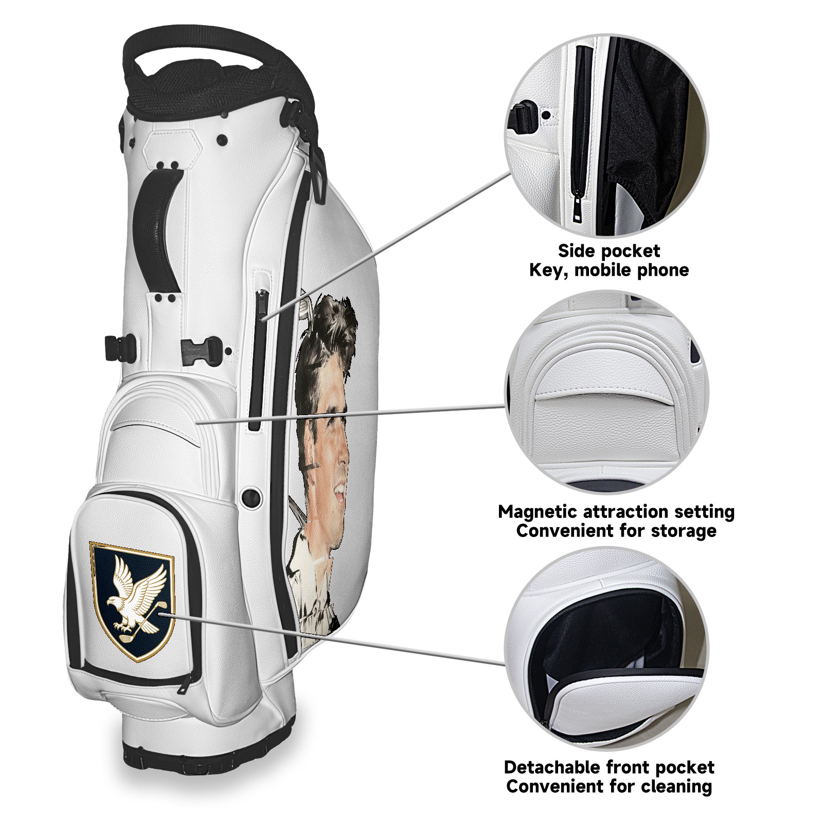 <p>The Golf Stand Bag, designed specifically for golf enthusiasts, offers a choice of 5 - way and 14 - way top dividers. Its 5/14 - compartment design with independent full - size club compartments safeguards clubs from collisions. Equipped with a rain cover, waterproof zippered pockets (tested to resist moderate to heavy rain), and a high - performance cooler pouch that can keep drinks cold for hours, it ensures a convenient golfing experience. The bag features thickened, breathable neoprene shoulder straps and an adjustable chest buckle, reducing shoulder fatigue by 35% compared to regular bags, and its automatic aluminum alloy stand provides stable support on various terrains. Crafted from top - tier, water - resistant litchi - grain PU leather, with double - stitched edges, reliable zippers tested for over 15,000 cycles, and anti - abrasion bottom studs, it guarantees durability. You can personalize it with embroidery on the front pocket and rain cover side (15*15cm area), and it comes in classic black and white, with a matte finish and litchi - grain texture that combines business and leisure styles. Measuring 130 cm in height, 37 cm in width, and 31 cm in depth (including rain cover) and 90 cm x 31 cm x 37 cm (excluding rain cover), it strikes a balance between storage and portability, capable of holding 14 standard - sized clubs and other essentials, and it also includes a dust cover. It's truly the perfect choice for golfers.<br></p>