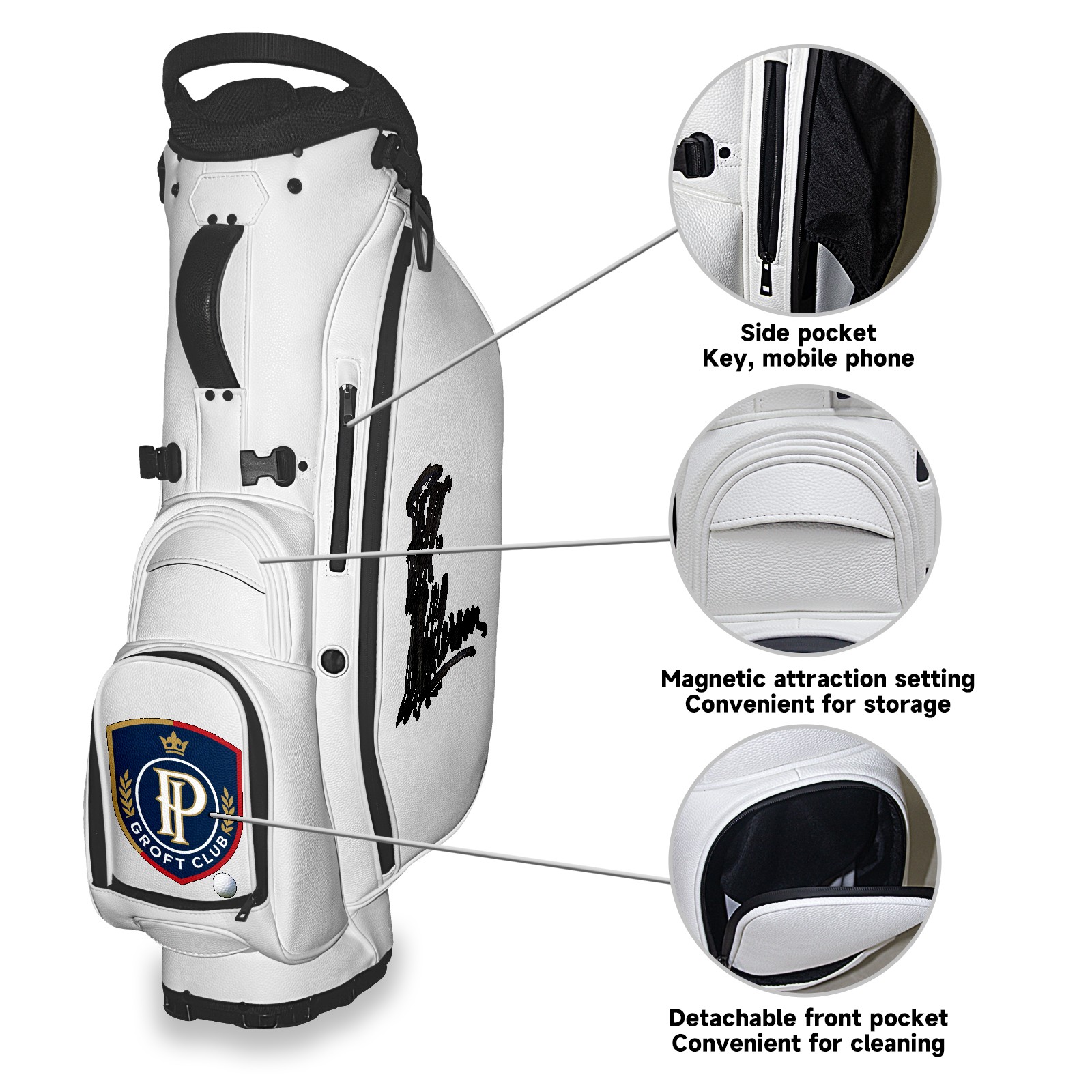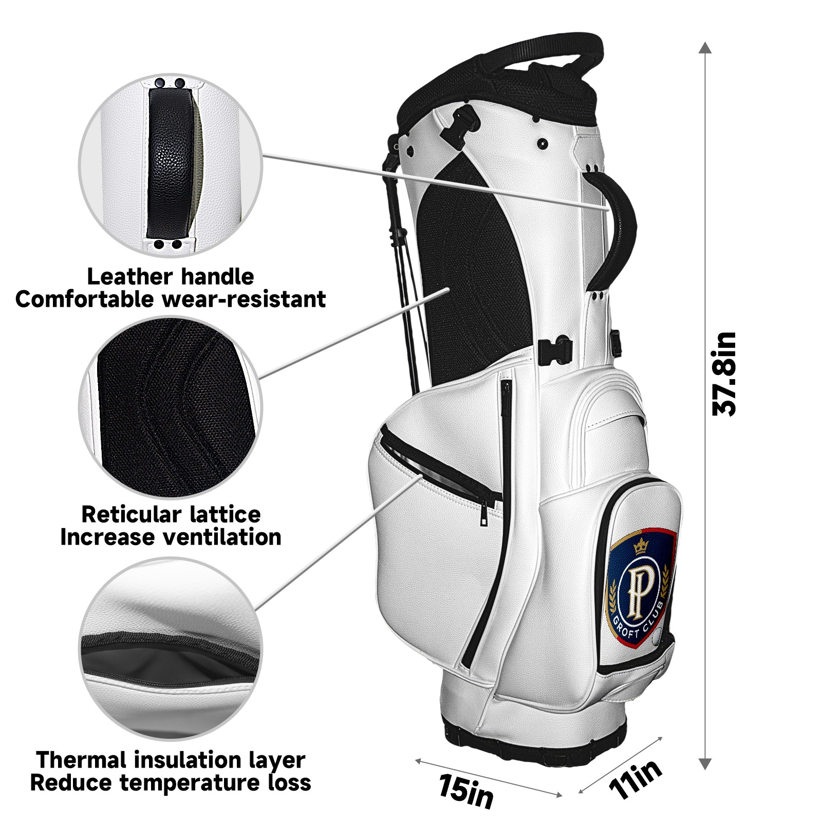 • <p>The Golf Stand Bag, designed specifically for golf enthusiasts, offers a choice of 5 - way and 14 - way top dividers. Its 5/14 - compartment design with independent full - size club compartments safeguards clubs from collisions. Equipped with a rain cover, waterproof zippered pockets (tested to resist moderate to heavy rain), and a high - performance cooler pouch that can keep drinks cold for hours, it ensures a convenient golfing experience. The bag features thickened, breathable neoprene shoulder straps and an adjustable chest buckle, reducing shoulder fatigue by 35% compared to regular bags, and its automatic aluminum alloy stand provides stable support on various terrains. Crafted from top - tier, water - resistant litchi - grain PU leather, with double - stitched edges, reliable zippers tested for over 15,000 cycles, and anti - abrasion bottom studs, it guarantees durability. You can personalize it with embroidery on the front pocket and rain cover side (15*15cm area), and it comes in classic black and white, with a matte finish and litchi - grain texture that combines business and leisure styles. Measuring 130 cm in height, 37 cm in width, and 31 cm in depth (including rain cover) and 90 cm x 31 cm x 37 cm (excluding rain cover), it strikes a balance between storage and portability, capable of holding 14 standard - sized clubs and other essentials, and it also includes a dust cover. It's truly the perfect choice for golfers.<br></p>