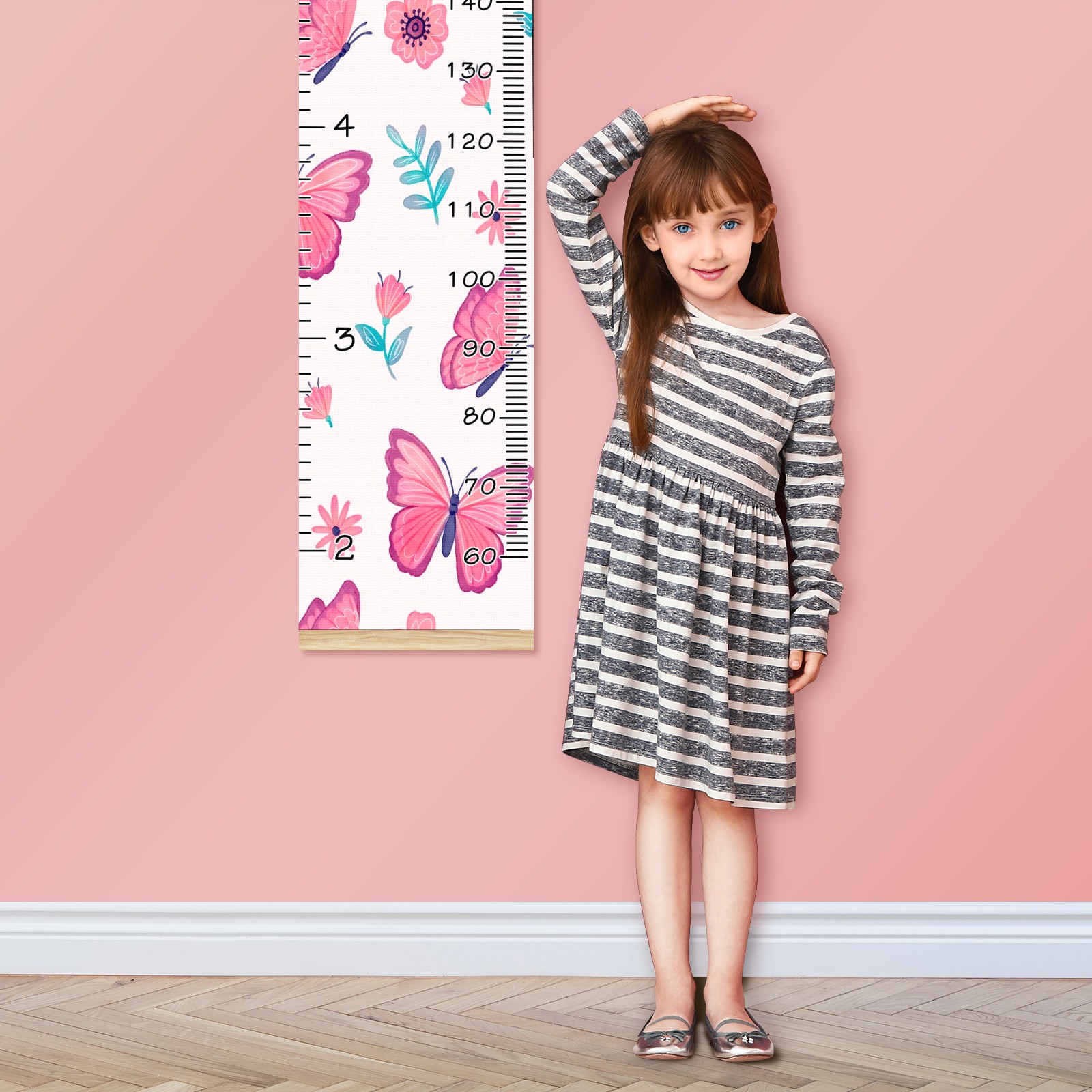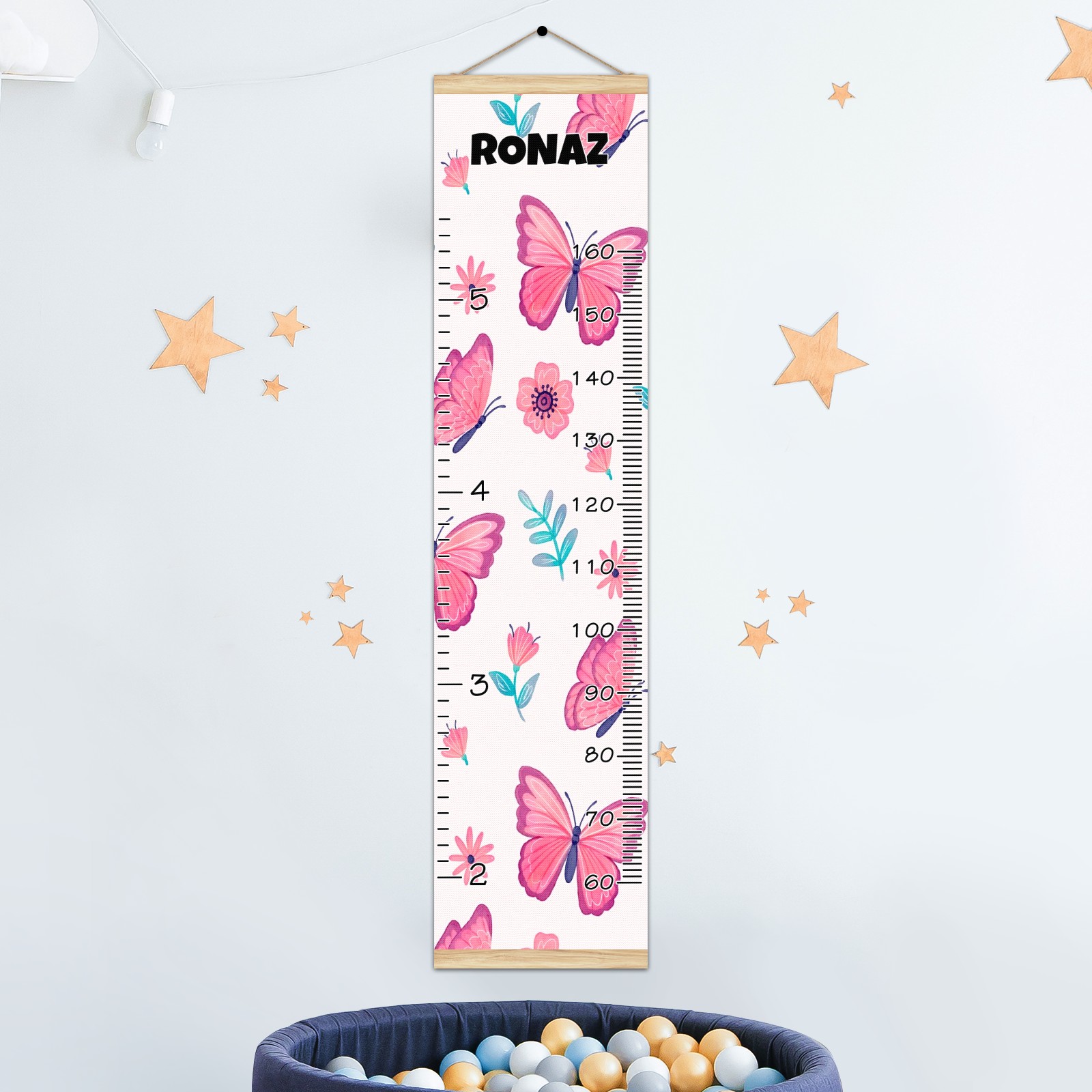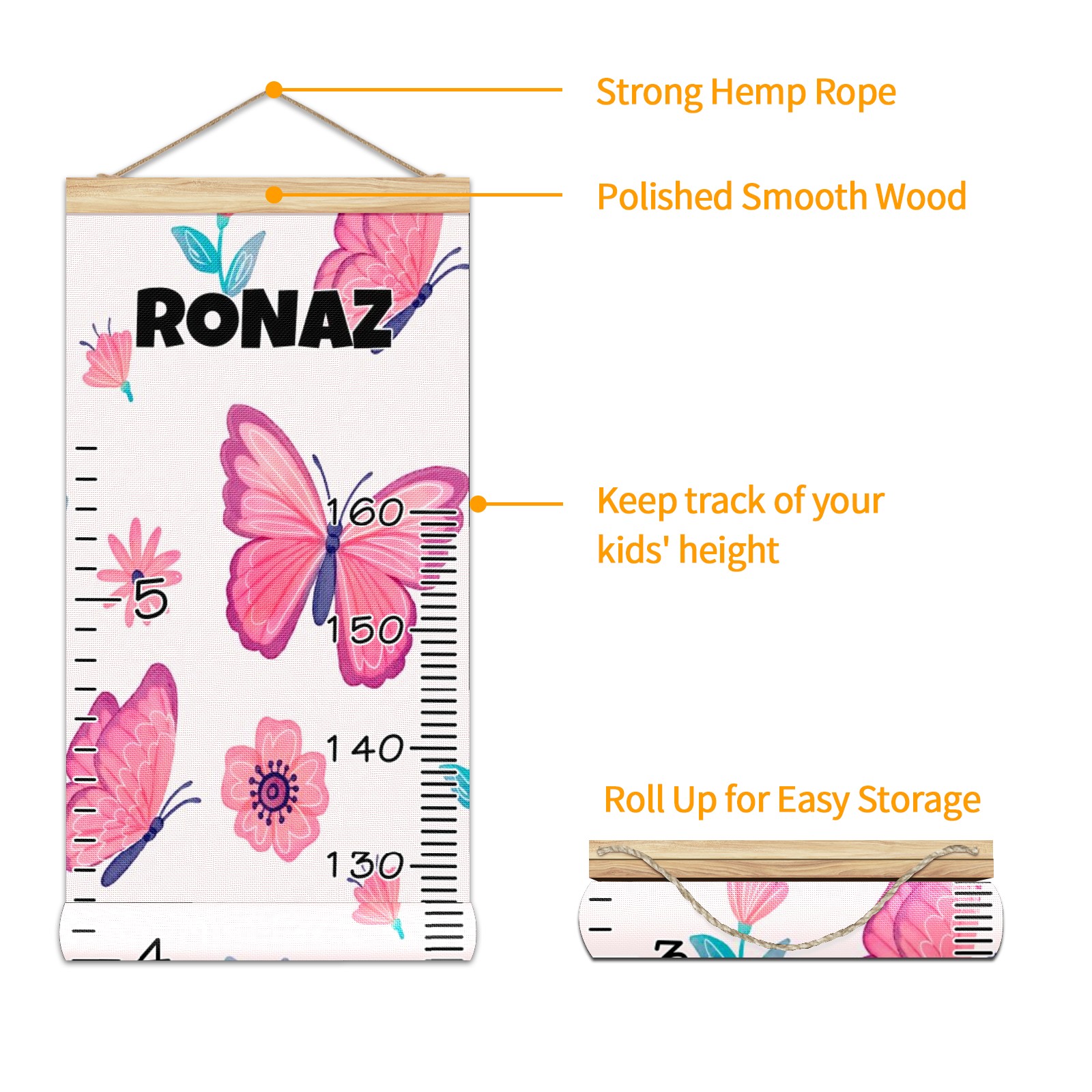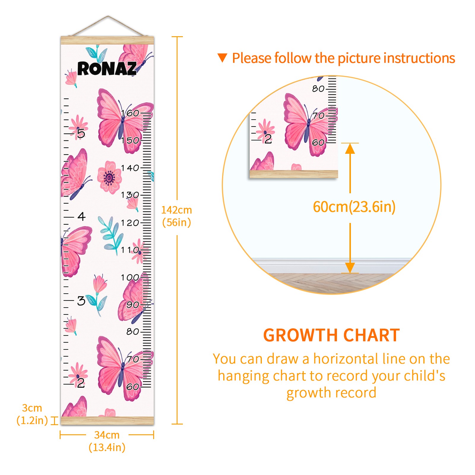 Personalized Kids Name Growth Chart Ruler for Wall Wood Frame Canvas Height Measure Chart 13.4x56 in Hanging Growth Chart Pink Butterfly & Flower12.29 Boys Girls Room Decor