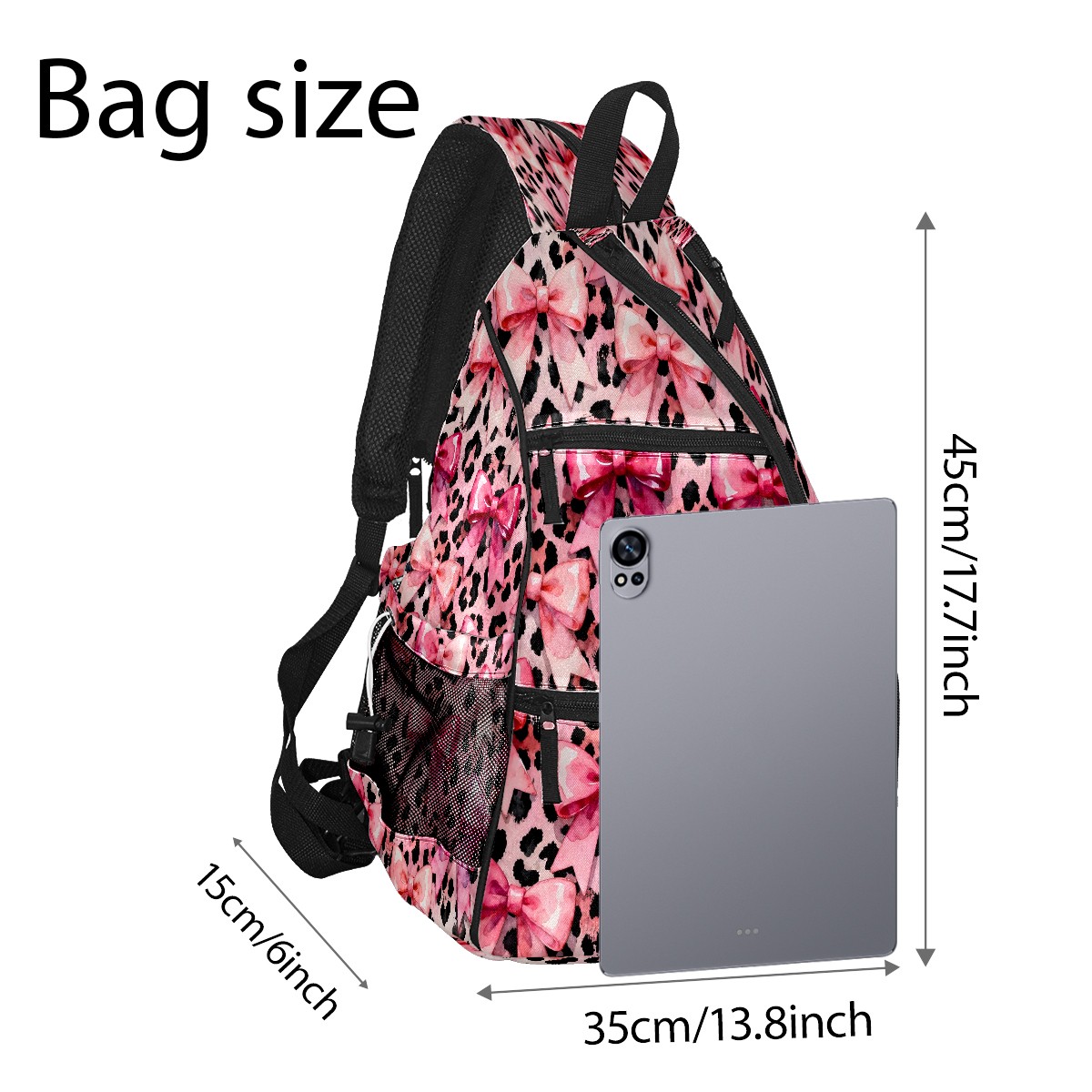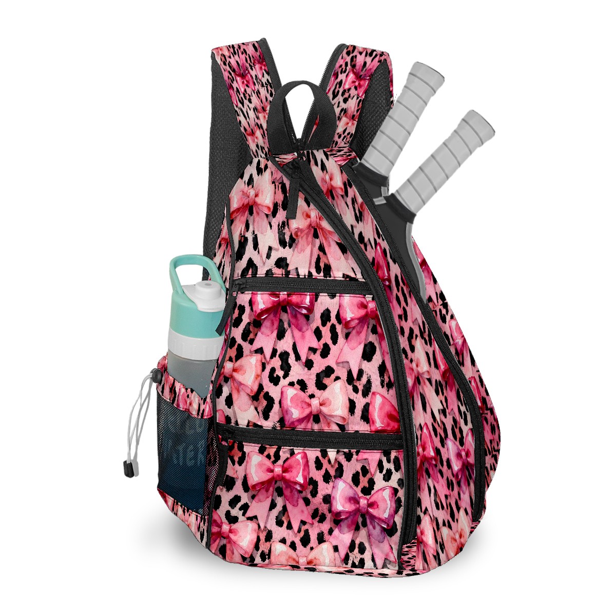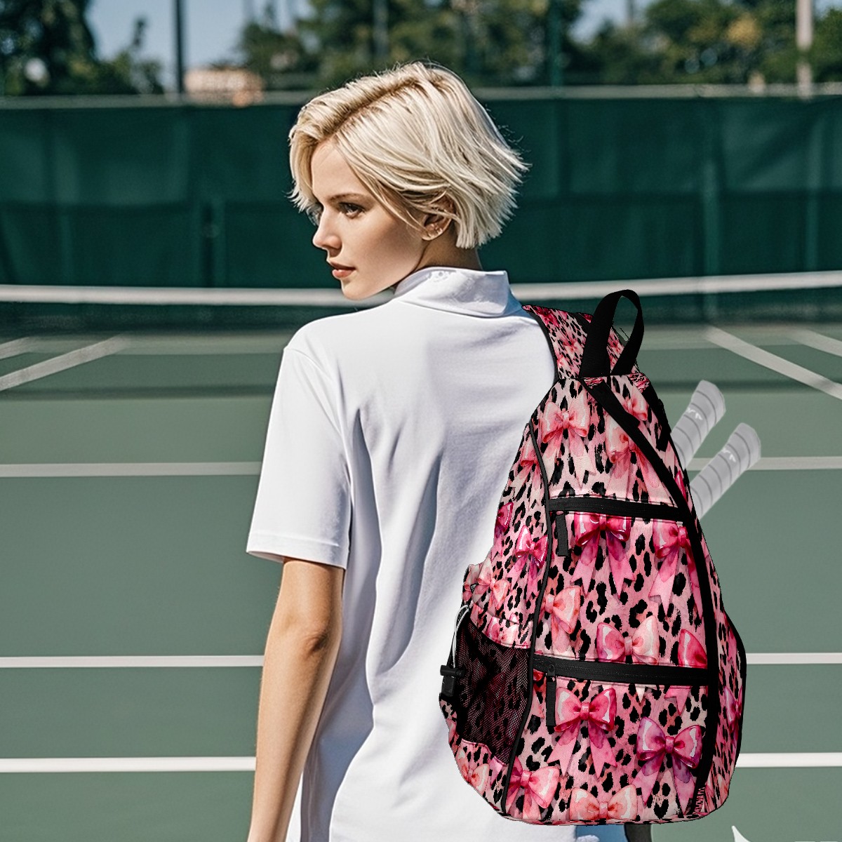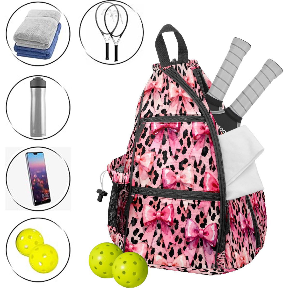 Pickleball Sling Bag for Women and Men - Backpack with Nylon Fabric/Woven Strap/Mesh Pocket/Fence Hook/Adjustable Bag Pink Bow