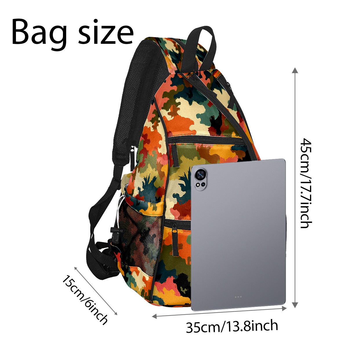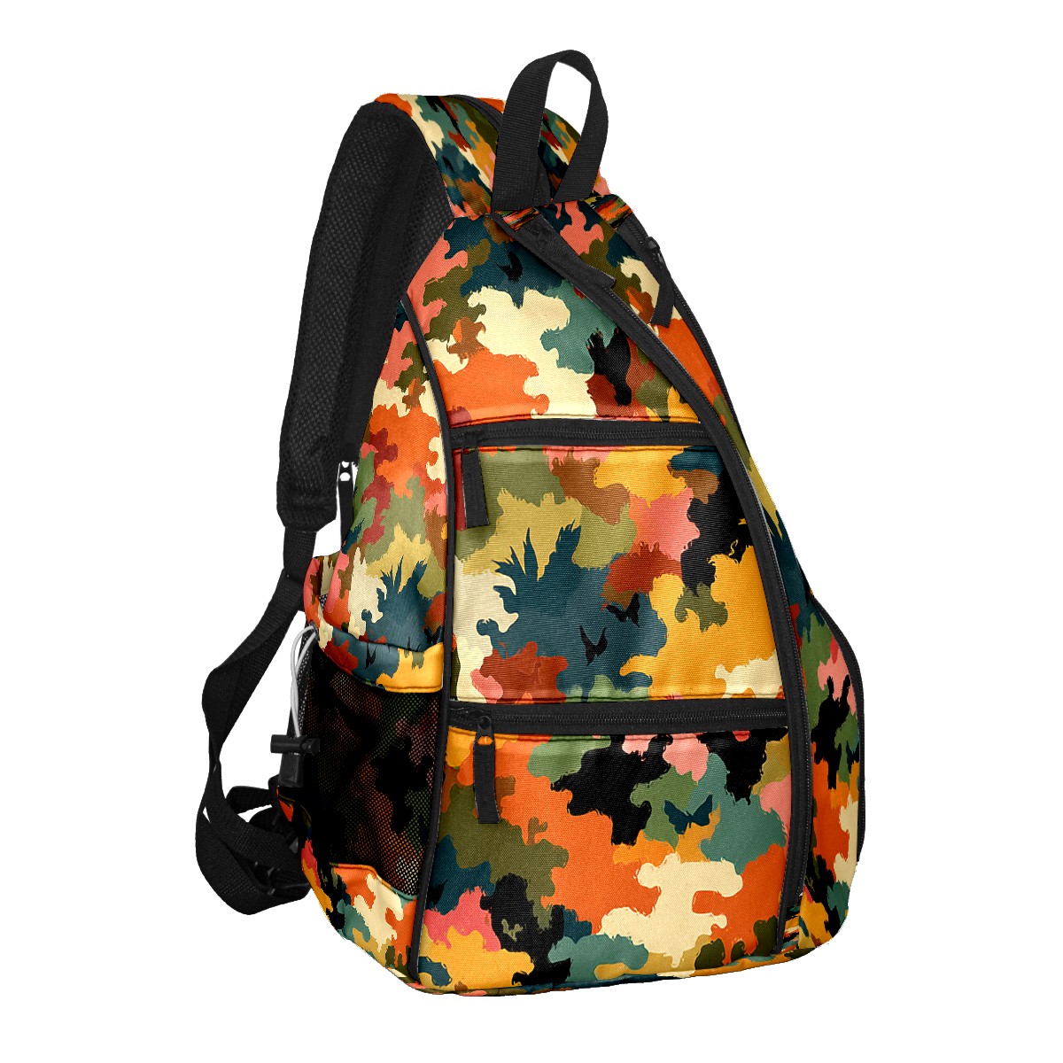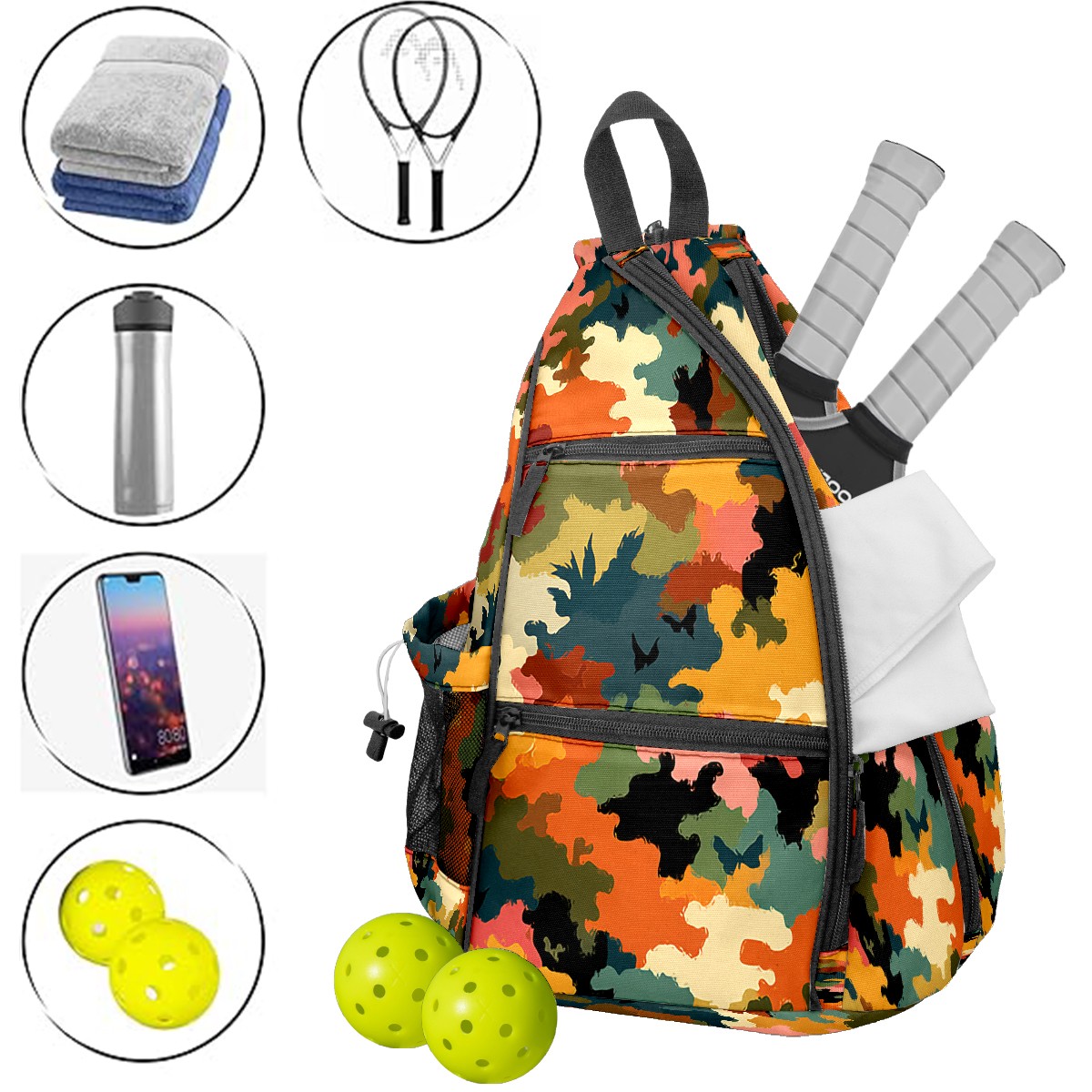 Pickleball Sling Bag for Women and Men - Backpack with Nylon Fabric/Woven Strap/Mesh Pocket/Fence Hook/Adjustable Bag Camouflage Orange